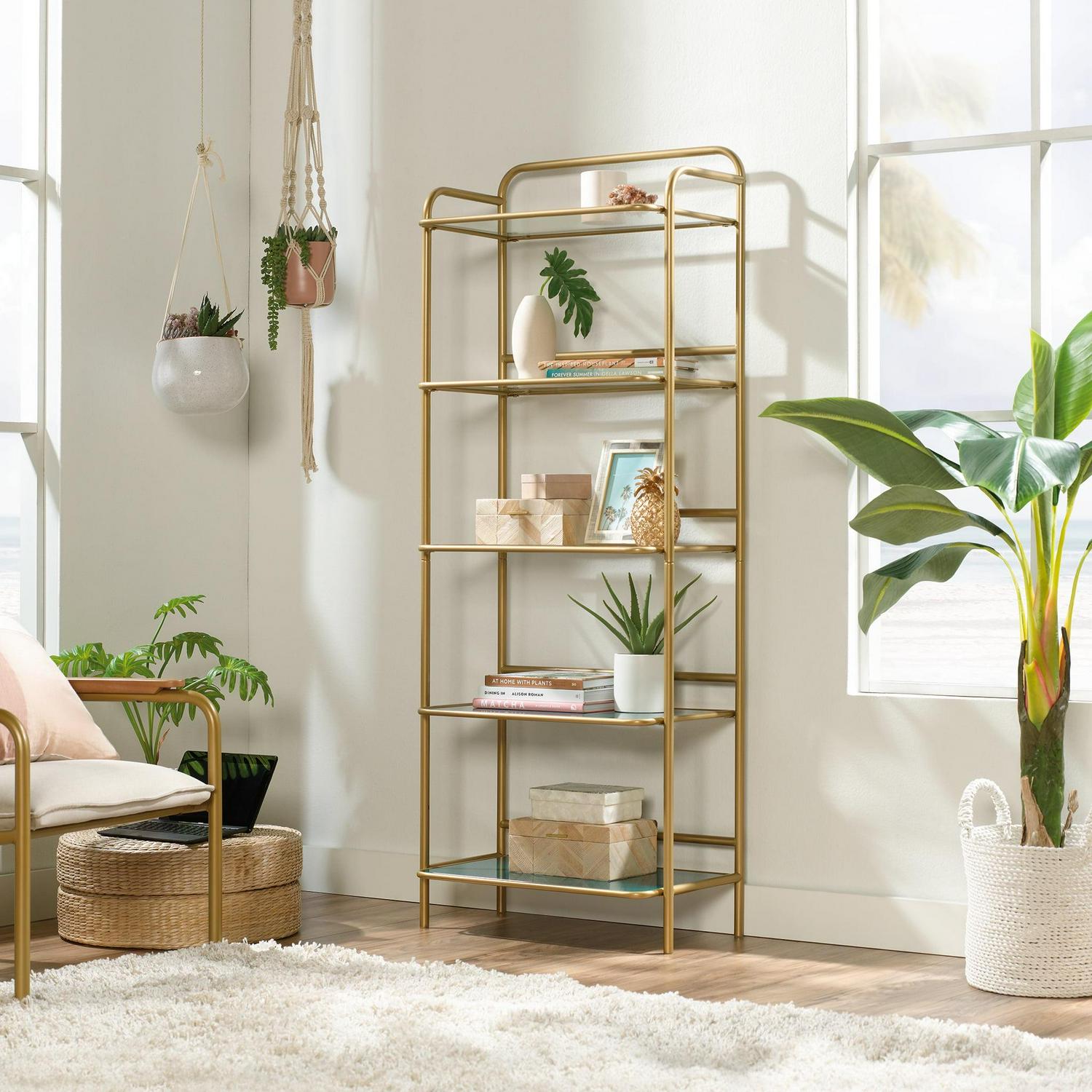 – Sauder Coral Cape 5-Shelf Bookcase with Glass Shelves, Satin Gold Finish: