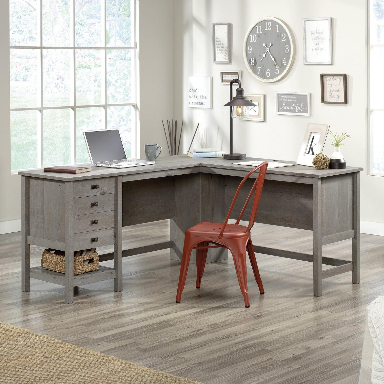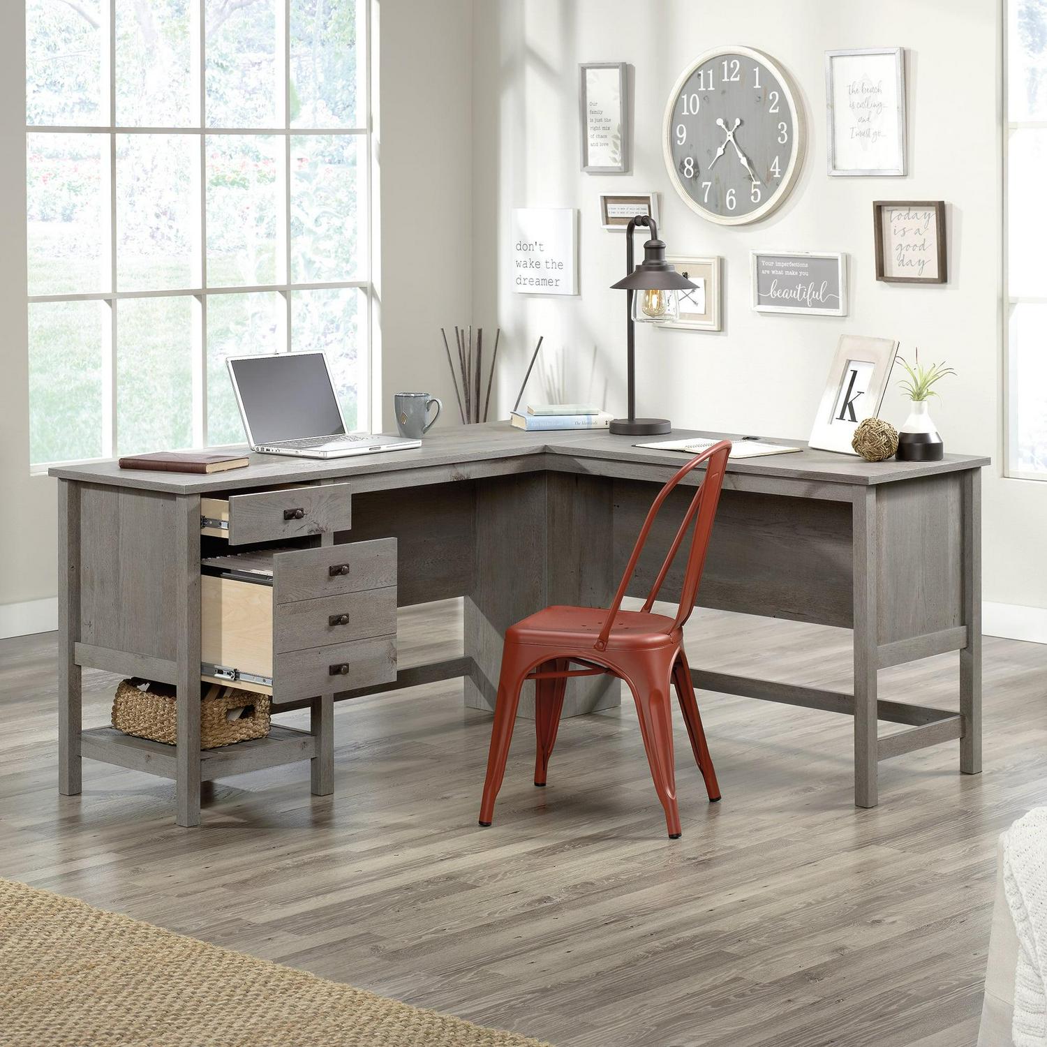 Update your home office with this L-shaped desk from the Cottage Road collection. The spacious work surface of this home office desk has room for your computer, pens, binders, folders, and a little home decor. Two drawers feature full extension slides for desk essentials and convenient storage options. The lower drawer holds letter-size hanging files, so your important documents are never hard to find. This L-shaped office desk features a lower, open shelf for additional storage of books or an organizing bin. A tidy workspace is crucial, that’s why this wood L-shaped desk comes equipped with two desktop grommets to keep your home office clutter-free of electronic cords. This farmhouse-style wood computer desk is finished on all sides for versatile placement in any room of your home. This allows you to rearrange and revamp as often as you want your desk will look good from every angle. Finished in Mystic Oak, this L-shaped desk with storage breathes new life into and new meaning into the home office.