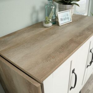 Let your crafting heart go wild! Create the perfect space in your home for all your sewing and crafting needs with this sewing/craft cart from the Sauder Select collection. This sewing craft table offers a spacious top surface that provides you with the room you need for all your supplies like your sewing machine, scrapbooks, spools of thread and organizing bins. Need additional work space We got you covered. The drop leaf table top provides you with the extra space you need for sewing and crafting. This sewing and craft table features easy access storage behind its roll-open doors that includes two storage bins and a hidden shelf for your sewing machine. Behind the door it also features two adjustable shelves that can move to different heights to create flexible storage for items of all shapes and sizes. This rolling sewing table includes easy-roll casters so it can easily move to wherever your projects take you. Finished in Soft White with Lintel Oak accents, this handy craft cart will have you feeling ready to work.