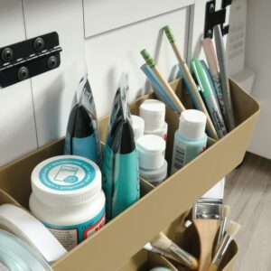 – Features easy access storage behind its roll-open doors that includes Two (2) storage bins and a hidden shelf for your sewing machine