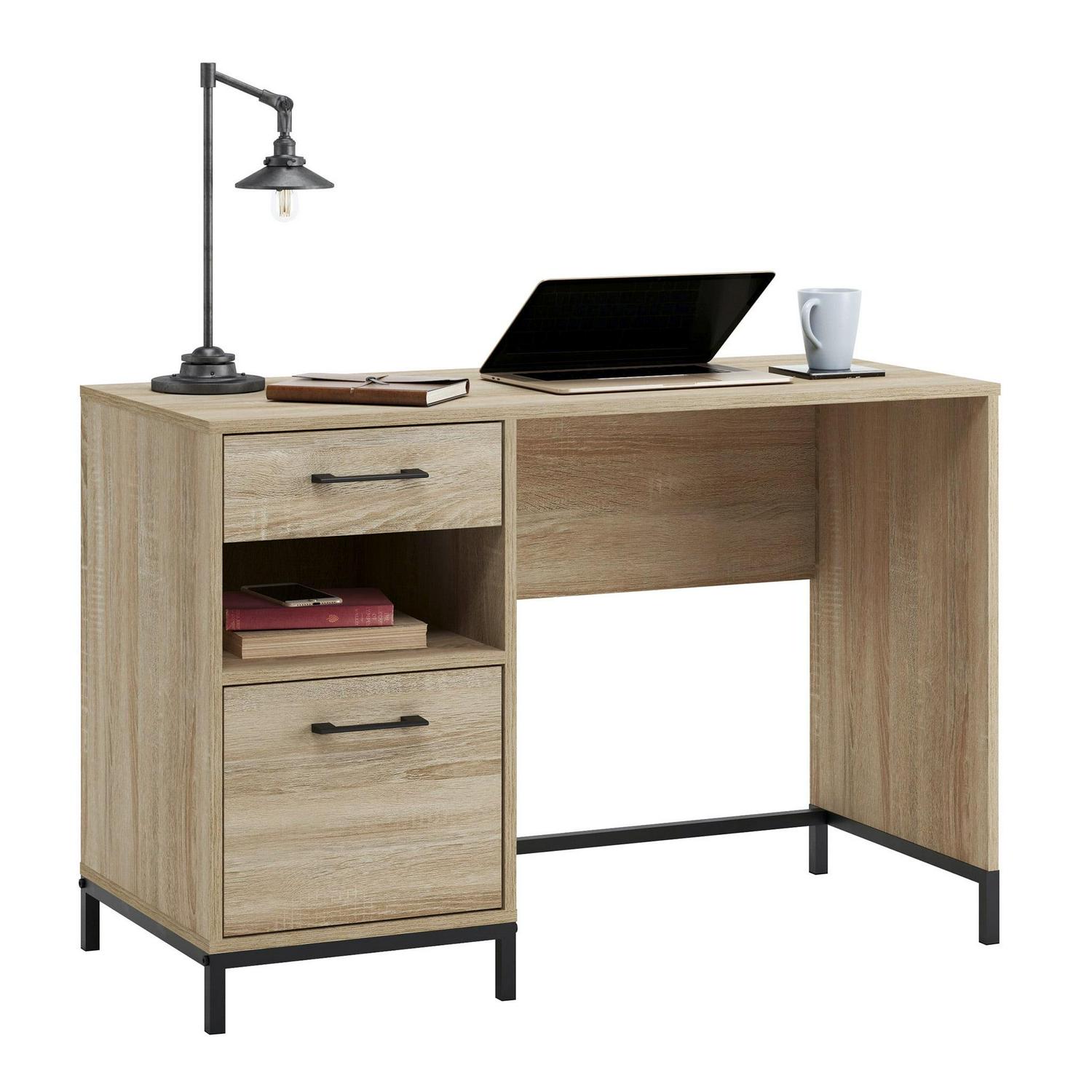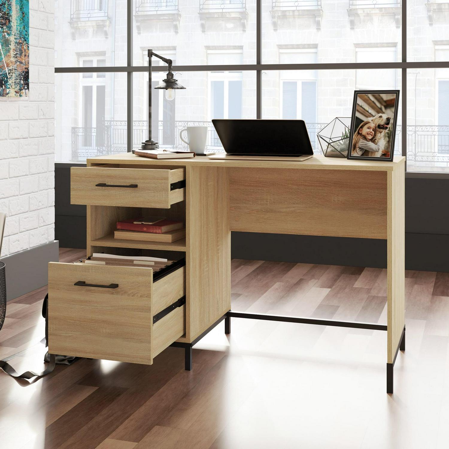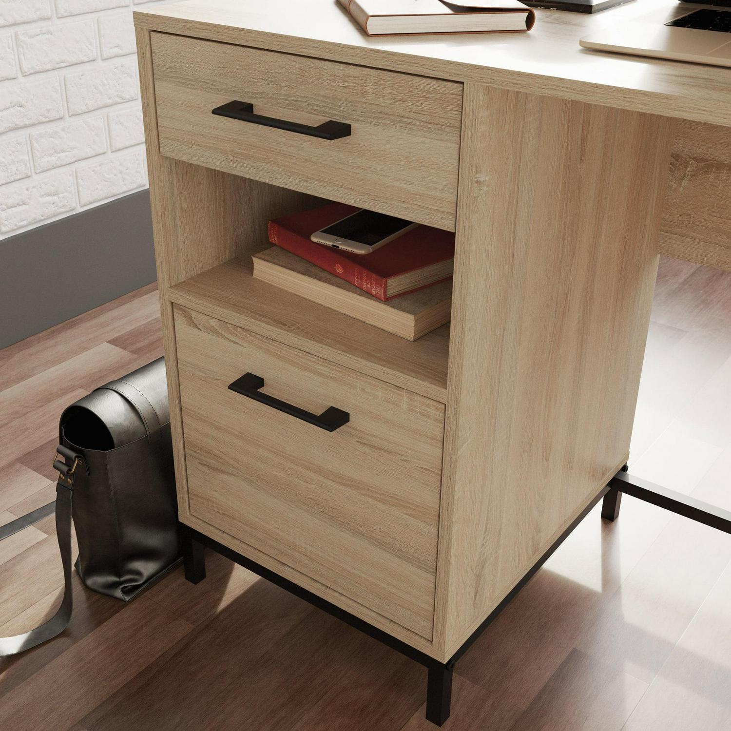 A simple desk can make all the difference to the daily tasks that need accomplished. Create the perfect space to brainstorm your goals, write a thank you note to your best friend or work from home with this small office desk from the Curiod collection. This single pedestal desk feature two drawers with full extension slides to hold your necessary writing supplies and other home office desk essentials. The lower drawer holds letter-size hanging files to keep your important documents organized and easy to access. An open shelf between the two drawers allows you to store common items like books, paper, or pens in an easy to reach place. This desk with drawers is finished on all sides for versatile placement in any room of your home. Finished in Charter Oak and detailed with a durable, black metal base and hardware, this single pedestal desk brings the right amount of office and productivity to your home.We hope you like what you see. Our designers travel the world and bring back the best and latest in style, finish, and color trends. This inspiring world travelis evident in the cutting edge and innovative furniture solutions we offer to you! Other affordablefurnishings from the collection (sold separately) are available to complete the look. For assistanceafter the purchase, you can to reach out to our award-winning and friendly Midwest based customerservice. They are ready to help you every step of the way with any questions you might have aboutthe product. Please contact us at 1-800-523-3987.