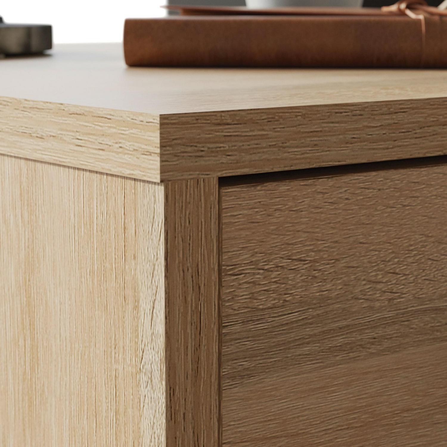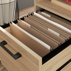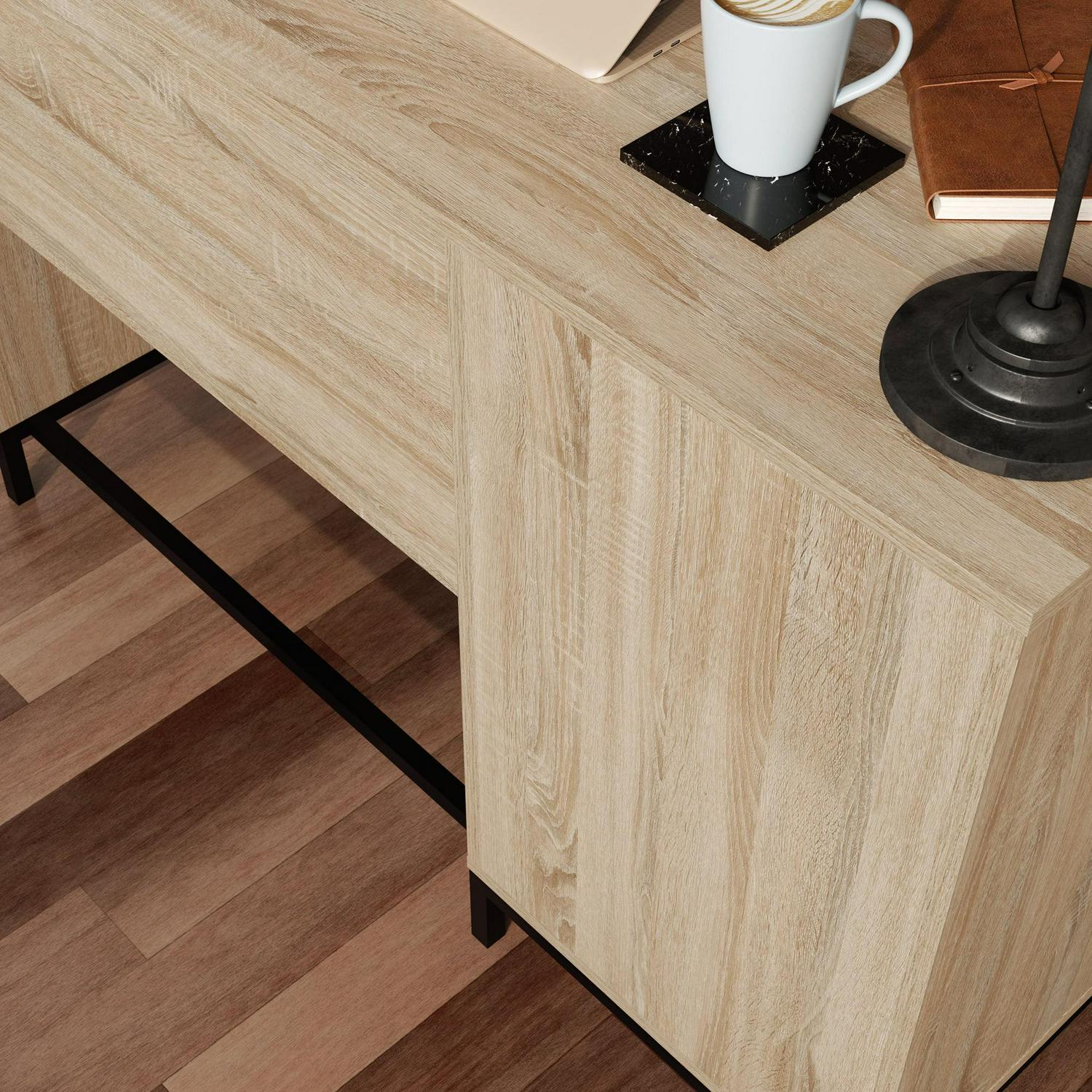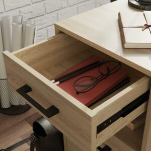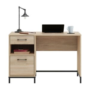 A simple desk can make all the difference to the daily tasks that need accomplished. Create the perfect space to brainstorm your goals, write a thank you note to your best friend or work from home with this small office desk from the Curiod collection. This single pedestal desk feature two drawers with full extension slides to hold your necessary writing supplies and other home office desk essentials. The lower drawer holds letter-size hanging files to keep your important documents organized and easy to access. An open shelf between the two drawers allows you to store common items like books, paper, or pens in an easy to reach place. This desk with drawers is finished on all sides for versatile placement in any room of your home. Finished in Charter Oak and detailed with a durable, black metal base and hardware, this single pedestal desk brings the right amount of office and productivity to your home.We hope you like what you see. Our designers travel the world and bring back the best and latest in style, finish, and color trends. This inspiring world travelis evident in the cutting edge and innovative furniture solutions we offer to you! Other affordablefurnishings from the collection (sold separately) are available to complete the look. For assistanceafter the purchase, you can to reach out to our award-winning and friendly Midwest based customerservice. They are ready to help you every step of the way with any questions you might have aboutthe product. Please contact us at 1-800-523-3987.