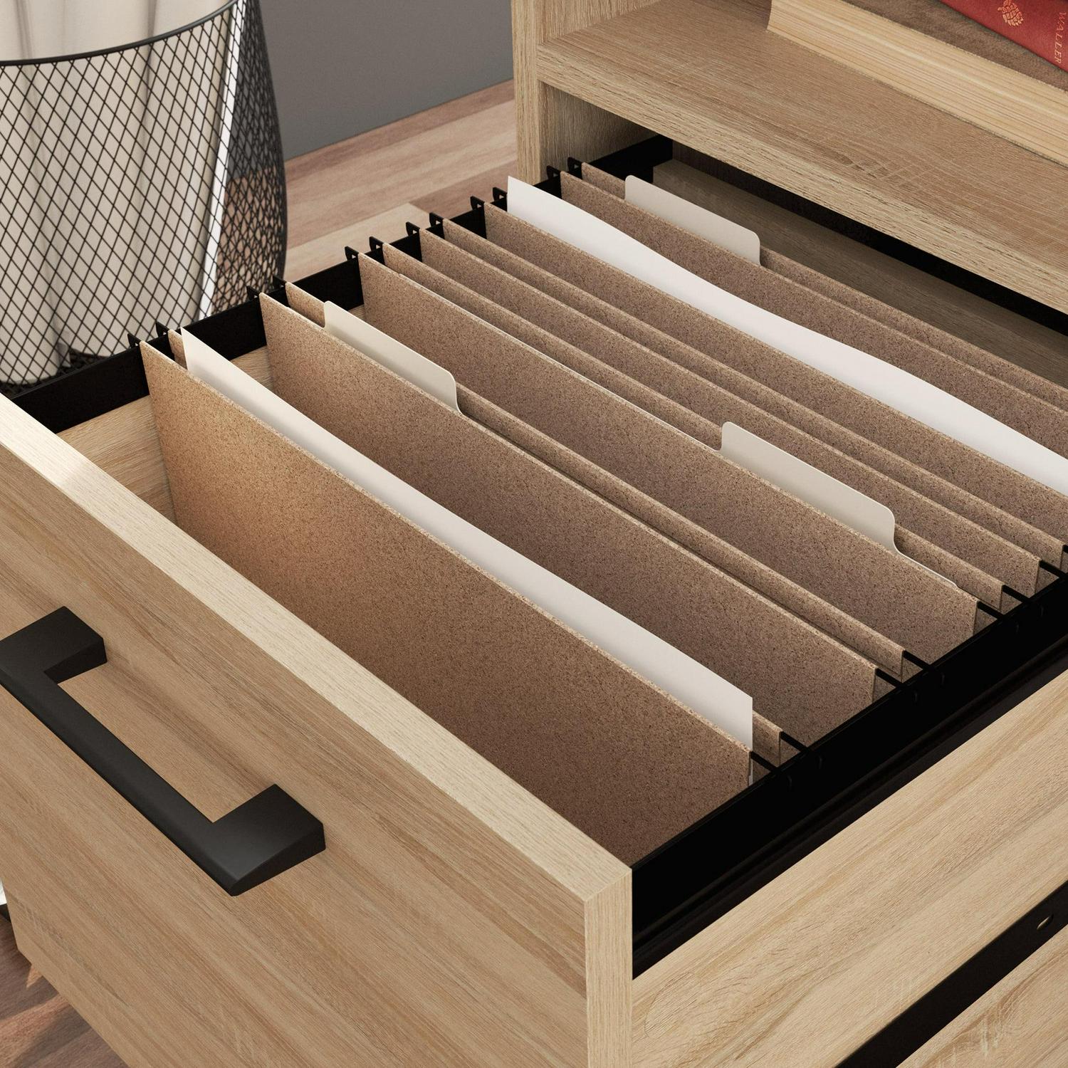 - Lower drawer holds letter-size hanging files to keep your documents organized