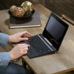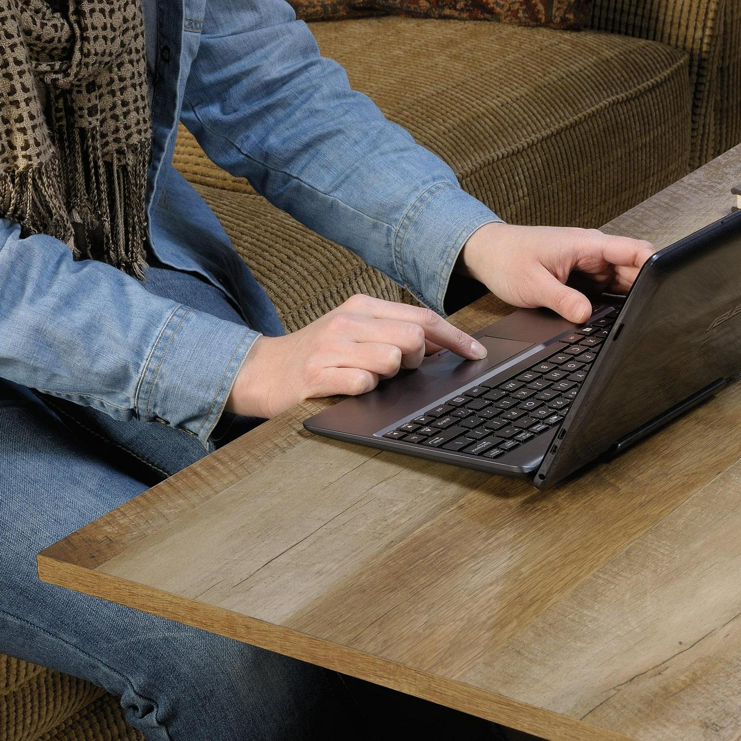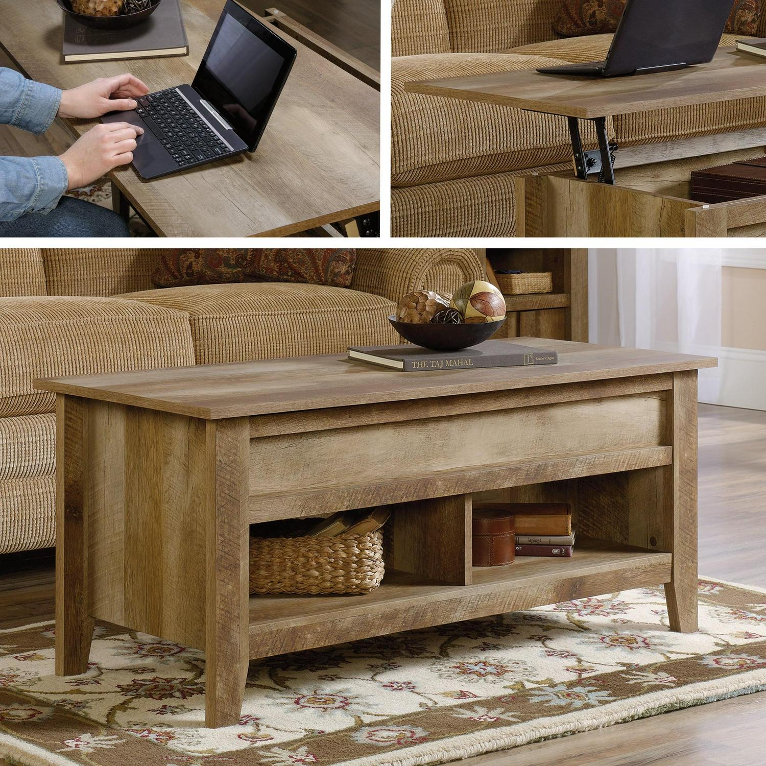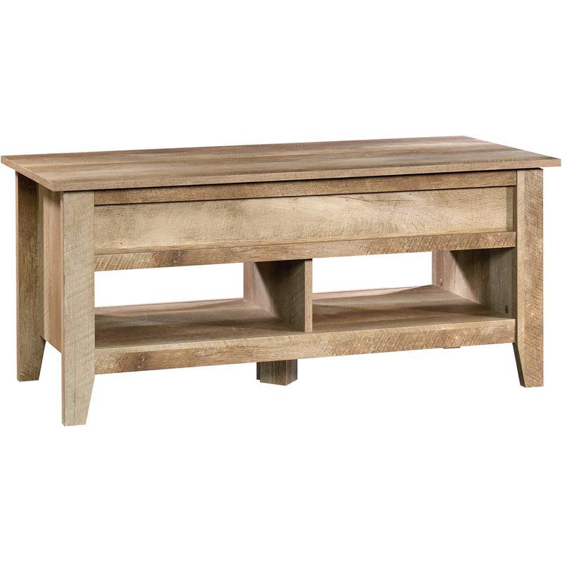 Redefine your living space with this unique lift-top coffee table from the Dakota Pass collection. The top of this pop-up coffee table lifts up and forward to turn this coffee table into a multipurpose work surface. Work from home, surf the web, or eat a snack while relaxing on your couch with this rustic lift-top coffee table. Store blankets, board games and more in the hidden storage compartment under the top of the coffee table. A lower open shelf for storage and display of home décor, books, and organizing bins, makes this living room coffee table versatile enough for the busiest homes. Finished on all sides for a polished look from every angle, this storage coffee table will look great from every angle. Finished in a rustic Craftsman Oak, add style and function to your living room with this versatile rustic lift-top coffee table from Sauder.