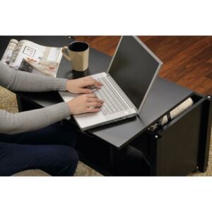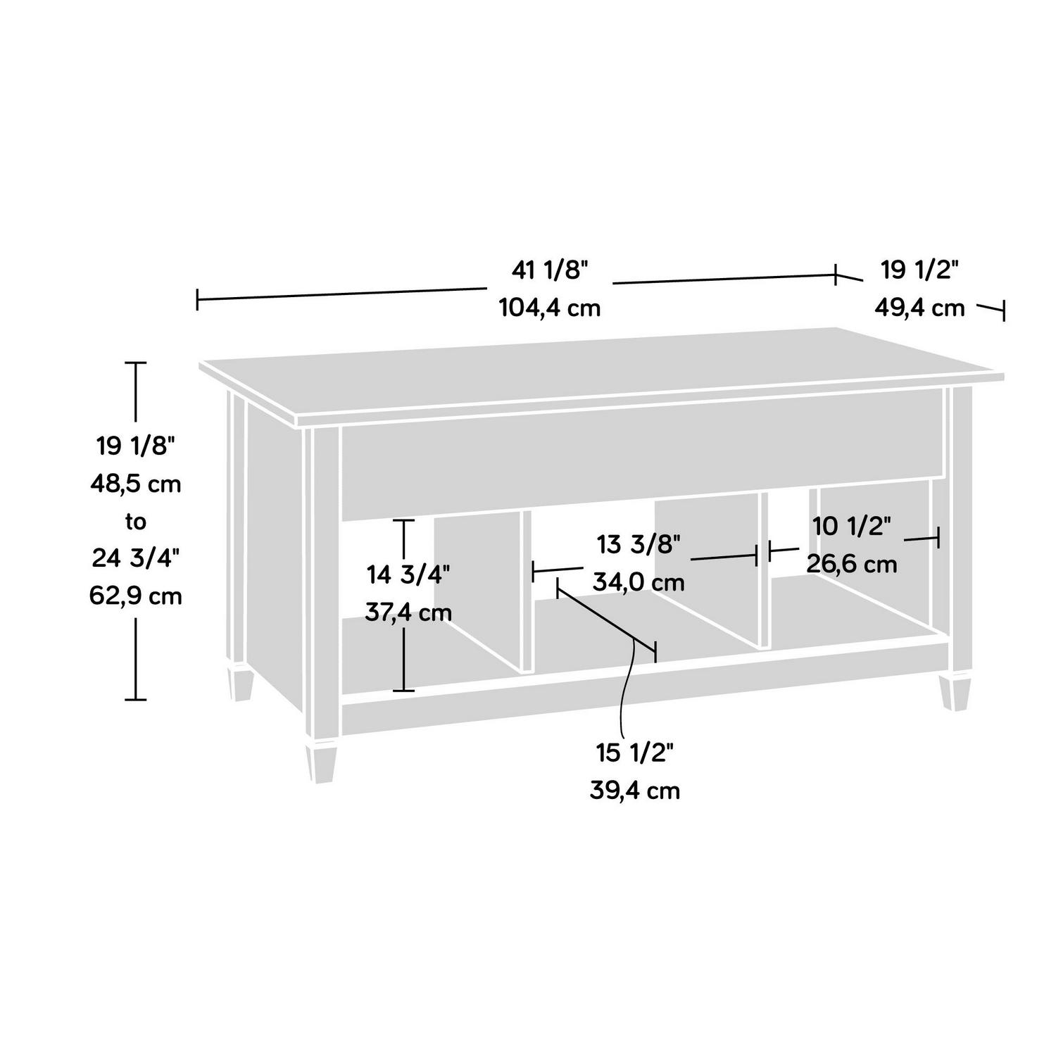 Stylish, functional, and easy on the eyes. This lift-top coffee table from the Edge Water collection is the perfect addition for your home. The tabletop lifts up and moves forward to create a multipurpose work surface for craft time, eating a snack, or playing games with family and friends. This versatile coffee table lets you work on your laptop, play on your tablet, or eat while watching the news all while relaxing on your couch. Additionally, this living room coffee table features hidden storage beneath the top to house magazines, linens, games, and more. Open shelves can be used for blankets or knick-knacks and picture frames. This pop-up coffee table is finished on all sides for versatile placement in any room of your home. It will look polished from all sides. Finished in a classic Estate Black finish, this storage coffee table with lift top will look great anywhere in your home.