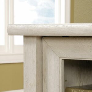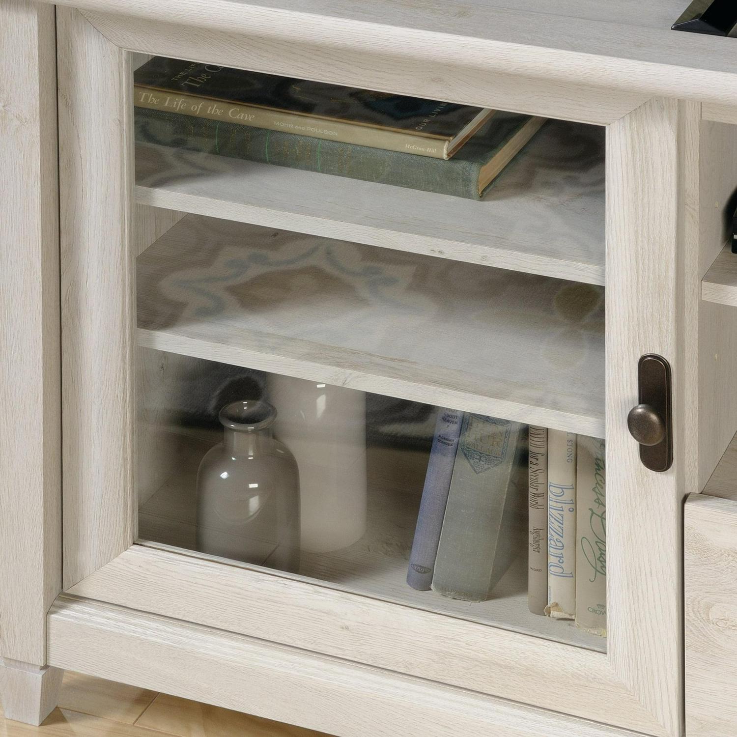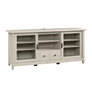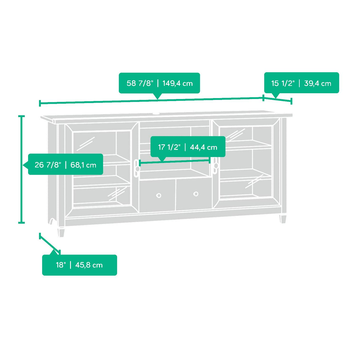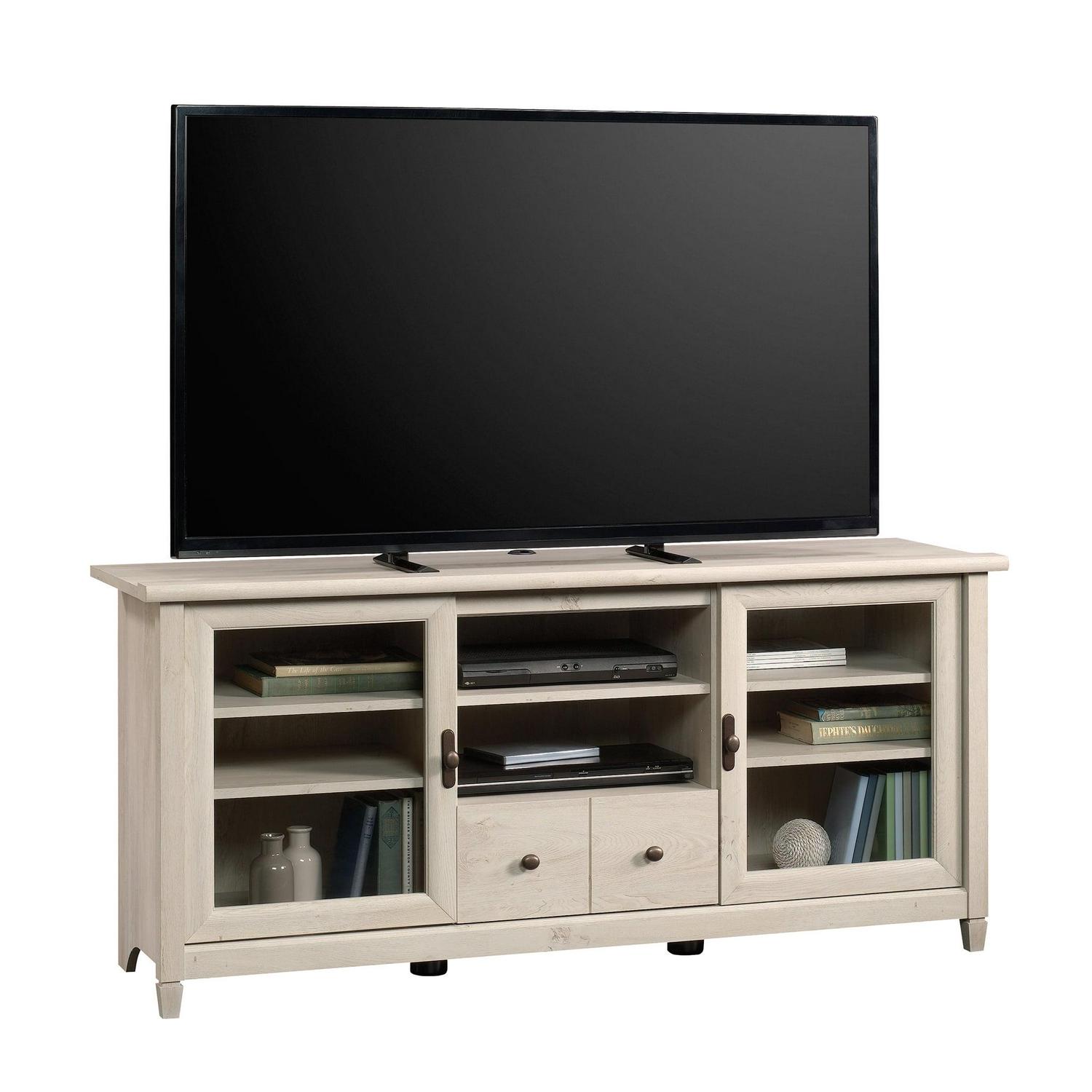 Upgrade your entertainment center with the Sauder Edge Water TV Stand for TVs up to 55″. This item comes in various colors, so you can pick the one that best matches your decor. The Sauder TV stand is designed to accommodate TVs up to 55″, and it will make an attractive focal point in any setting. The unit features an adjustable center shelf that can hold audio/video equipment, and shelves behind each framed safety-tempered glass door. The Chalked Chestnut TV stand also has a drawer with metal runners and safety stops. Organize your electronics and various DVDs and other objects. It will change the way a room or area looks and feels. The Sauder Edge Water Entertainment Credenza can be the entertainment hub in your home.