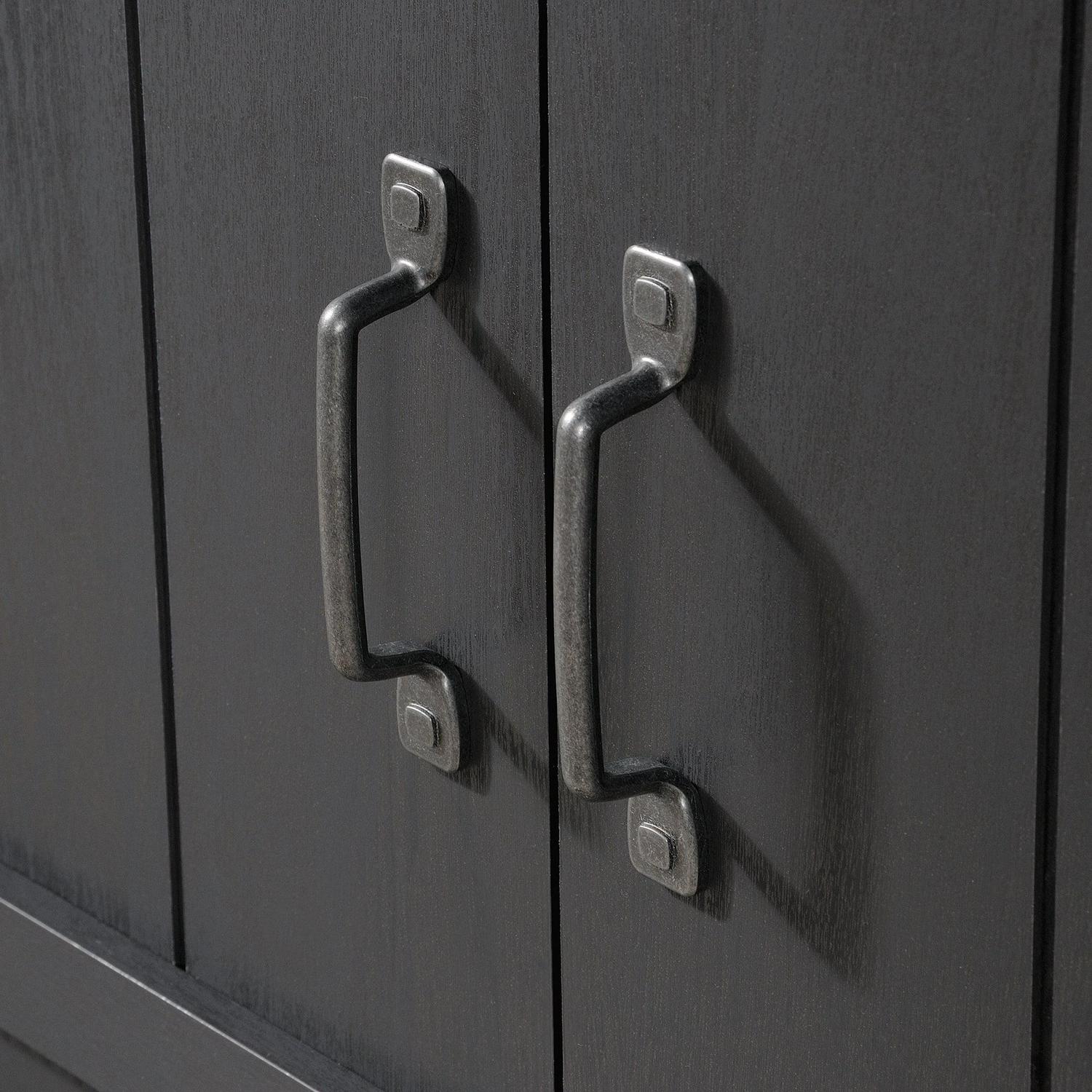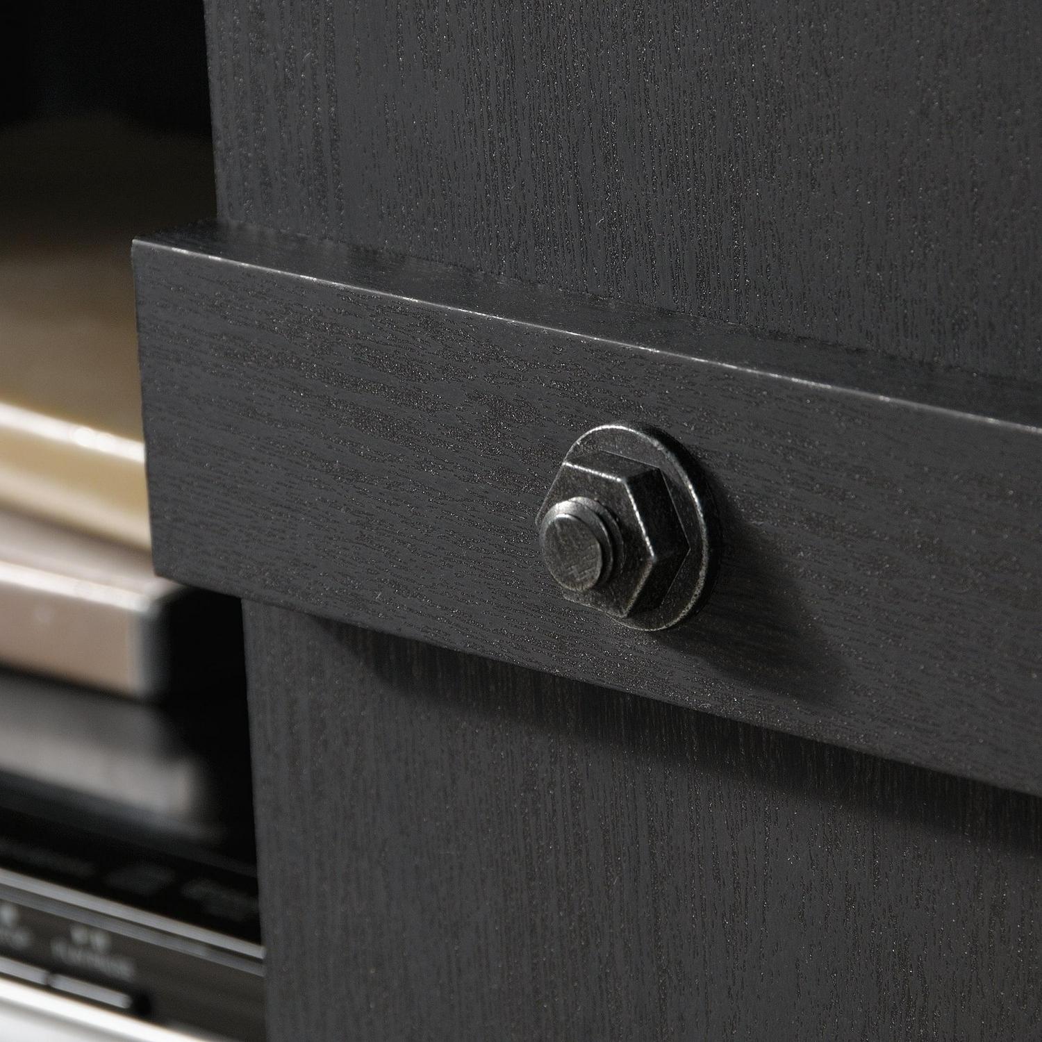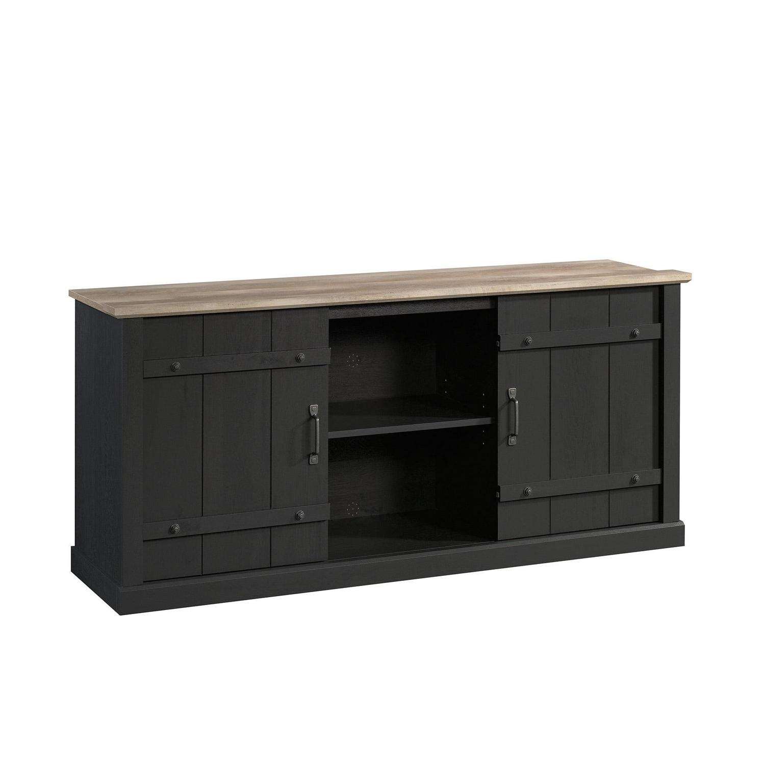 The ease and unique design of sliding barn doors never go out of style. Bring this classic feature into the 21st century with this TV credenza from the Sauder Select collection. This farmhouse TV stand accommodates up to a 70 TV weighing 95 lbs. or less, making it the ideal spot to cozy up and watch all-day movie marathons with your friends or family. Its top surface can also be used to display your favorite home decor items like decorative plants, knick-knacks and photos of your family. This TV stand with storage features hidden space behind its two sliding doors so you can display the best and hide the rest. This TV stand with sliding doors includes three adjustable shelves that can move to different heights to create flexible storage options for items of all shapes and sizes. These shelves are perfect for video and gaming consoles or movies and board games. This credenza TV stand includes an enclosed back panel with cord access so you can keep all your wires neat and out of the way. Finished in Raven Oak with Lintel Oak accents, this one-of-a-kind TV credenza provides a rustic farmhouse vibe and is just what your home needs.