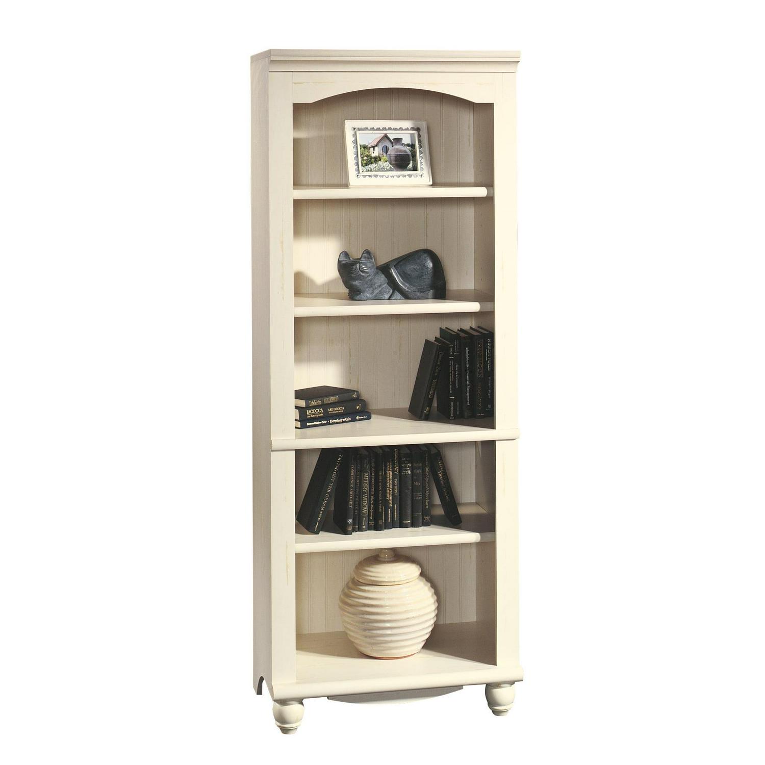 Elevate your home decor with this library from the Harbor View collection. This tall bookcase features five spacious shelves that are ideal for storing and displaying anything you have in your home from books, folders, and binders to awards, picture frames, and decorative knick-knacks. It has room for it all! The three adjustable shelves give you the option to move them to different heights to hold items of all different shapes and sizes, accommodating your needs. This library with shelves also includes cord access through the enclosed back panel so you can keep all your wires neat and out of sight. The simple design and stunning appearance make this 5-shelf bookcase a perfect fit for any room in your home the living room, your office, down the hallway, or even in the bedroom. Finished in Antiqued White and detailed with solid wood-turned feet, this tall library bookcase adds a touch of cottage-inspired style to any room in your home.