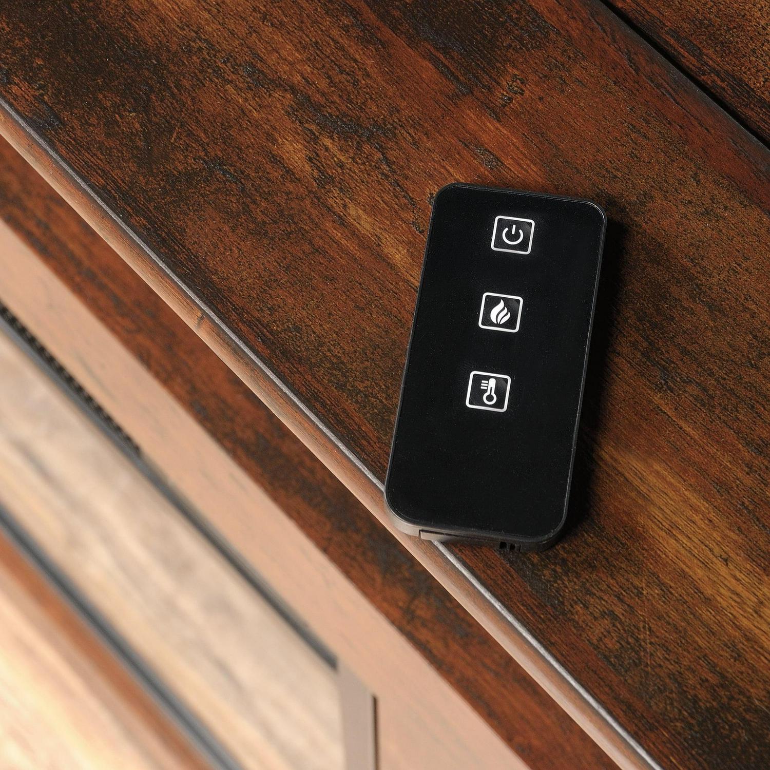 - Electric firebox with remote control and built-in overheat protection heats up to 400 square feet