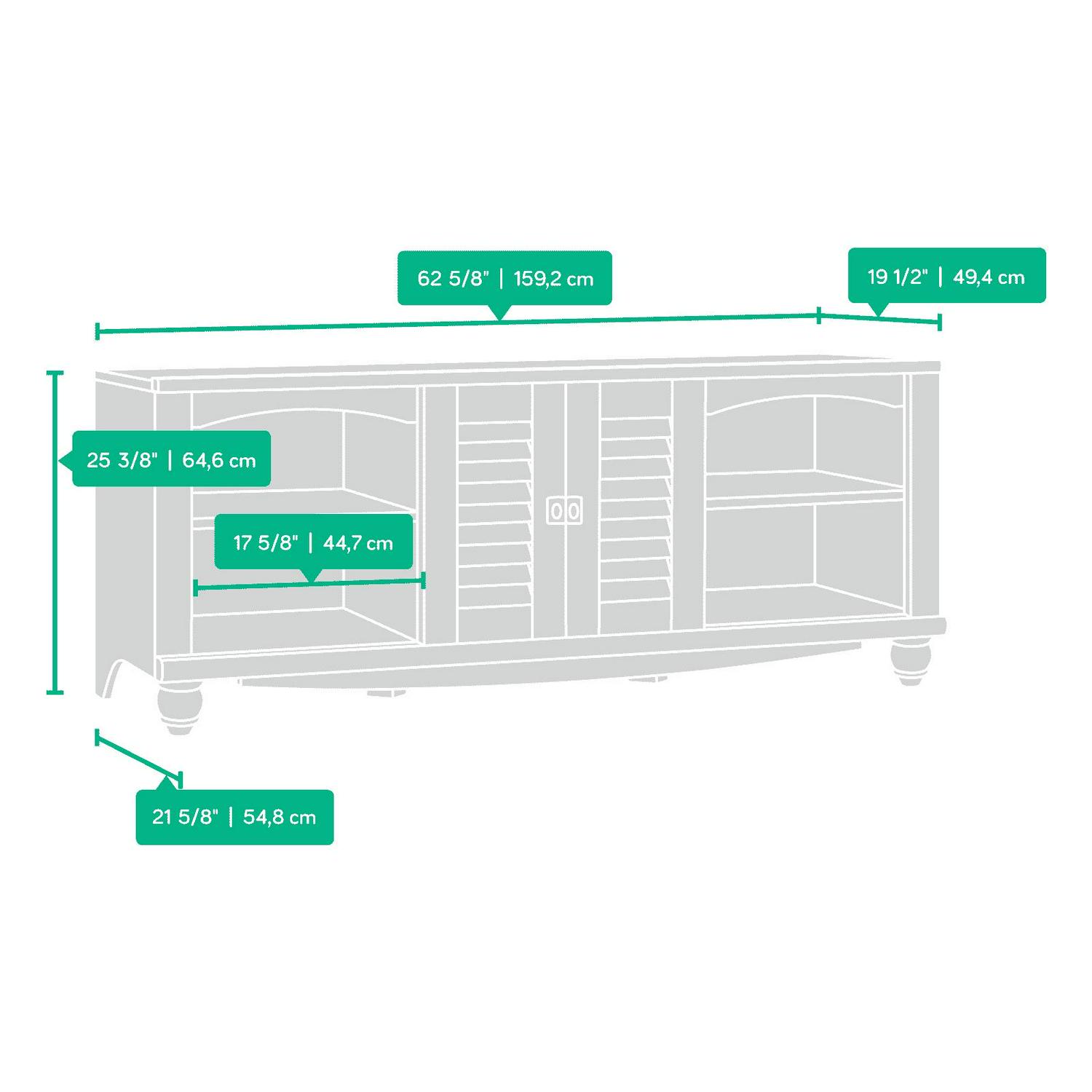 - The storage area behind louver detailed doors has an adjustable shelf and holds DVDs and CDs
