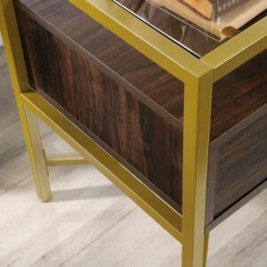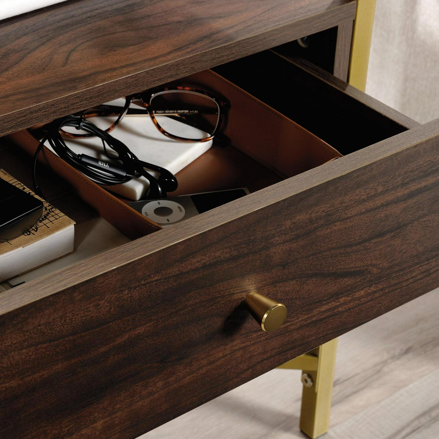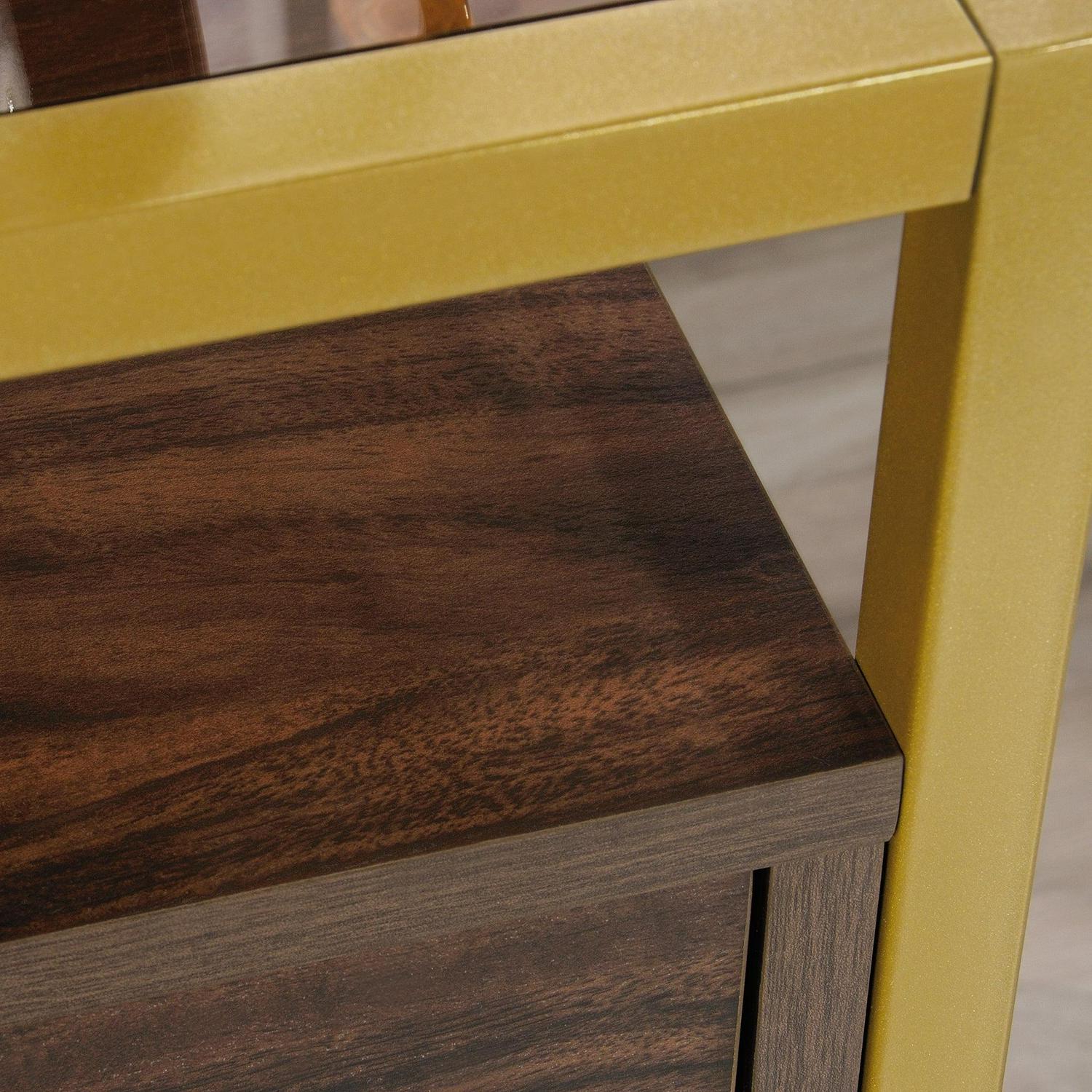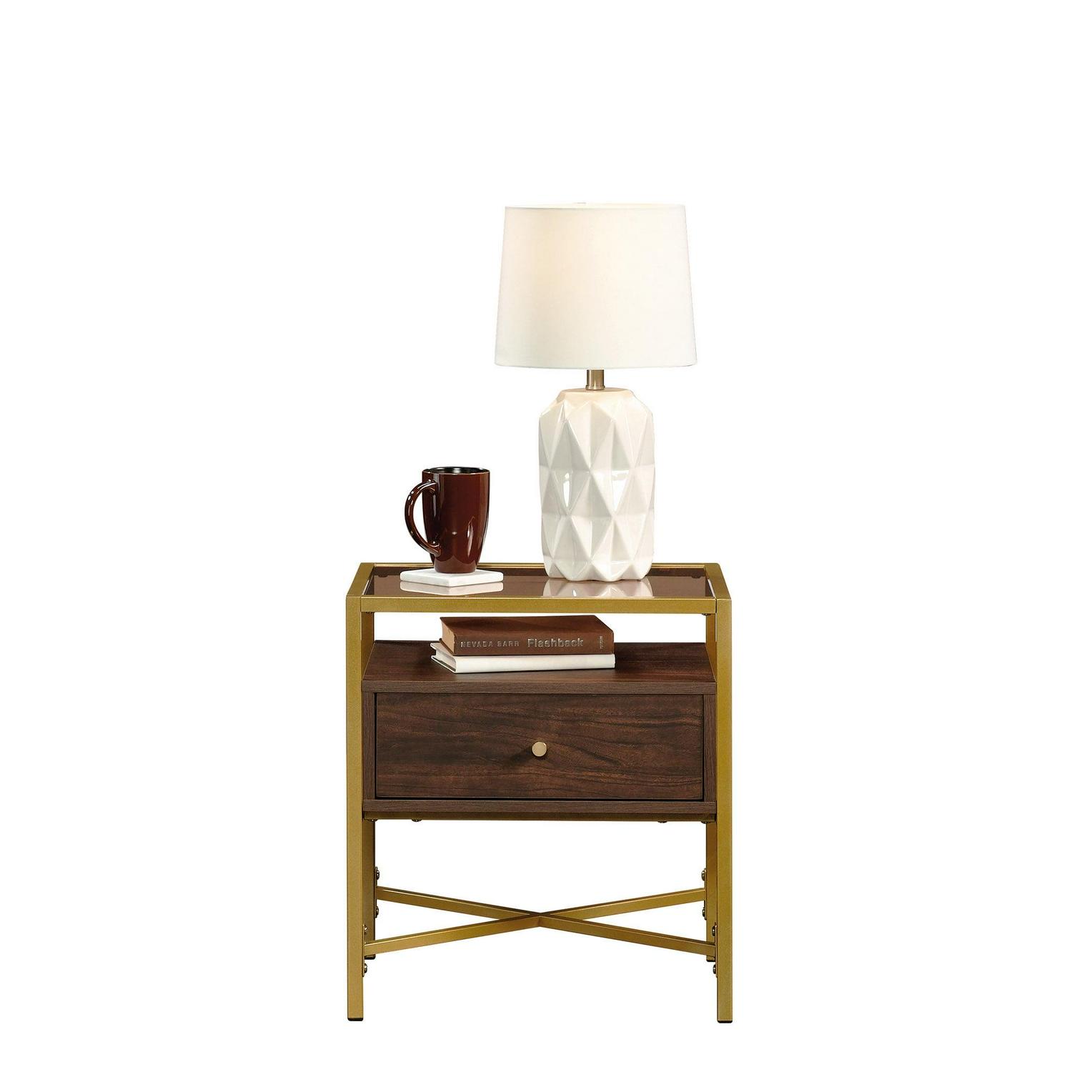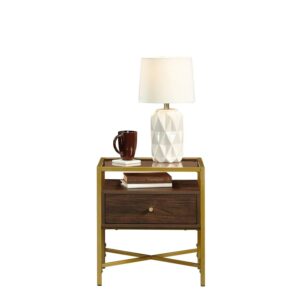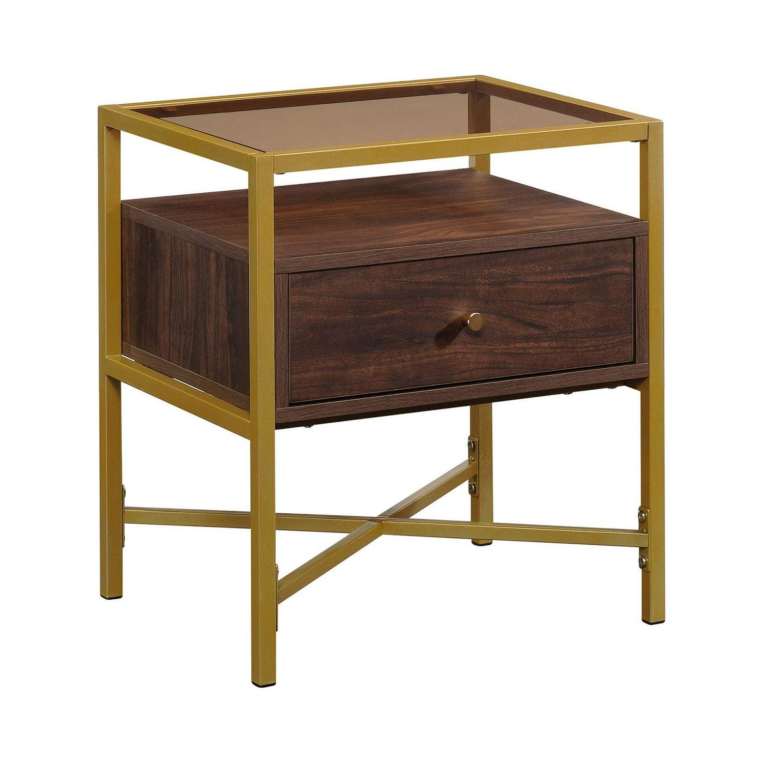 Is your living room looking a bit boring and bland Add a little style and glam to your home d cor with this wood and metal side table from the Harper Heights collection. This glass top side table offers a spacious top surface with all room for items like a lamp, framed photos, coasters, and ice-cold drinks. The tinted, safety-tempered glass top adds an extra touch of luxurious style that is sure to stand out. The contemporary side table’s open shelf provides easy-access storage to stow away items like your reading glasses and TV remote. Plus, the lower storage drawer opens and closes on smooth metal runners for a convenient spot to store items like books, crossword puzzles, and your secret stash of sweets. Attractive from every angle, this side table with storage is finished on all sides for versatile placement. Finished in Rich Walnut and paired with a durable, powder-coated metal frame in gold, this stunning glass top end table is sure to catch the eye of all your guests.