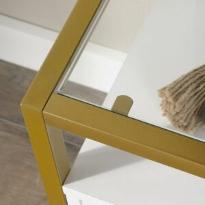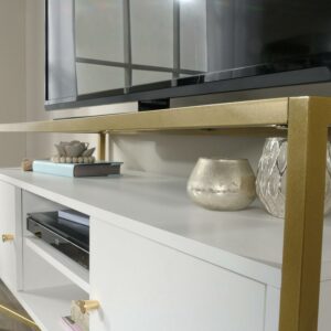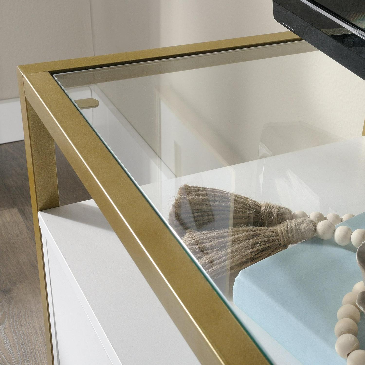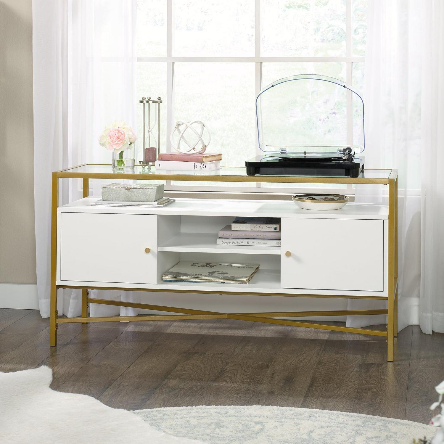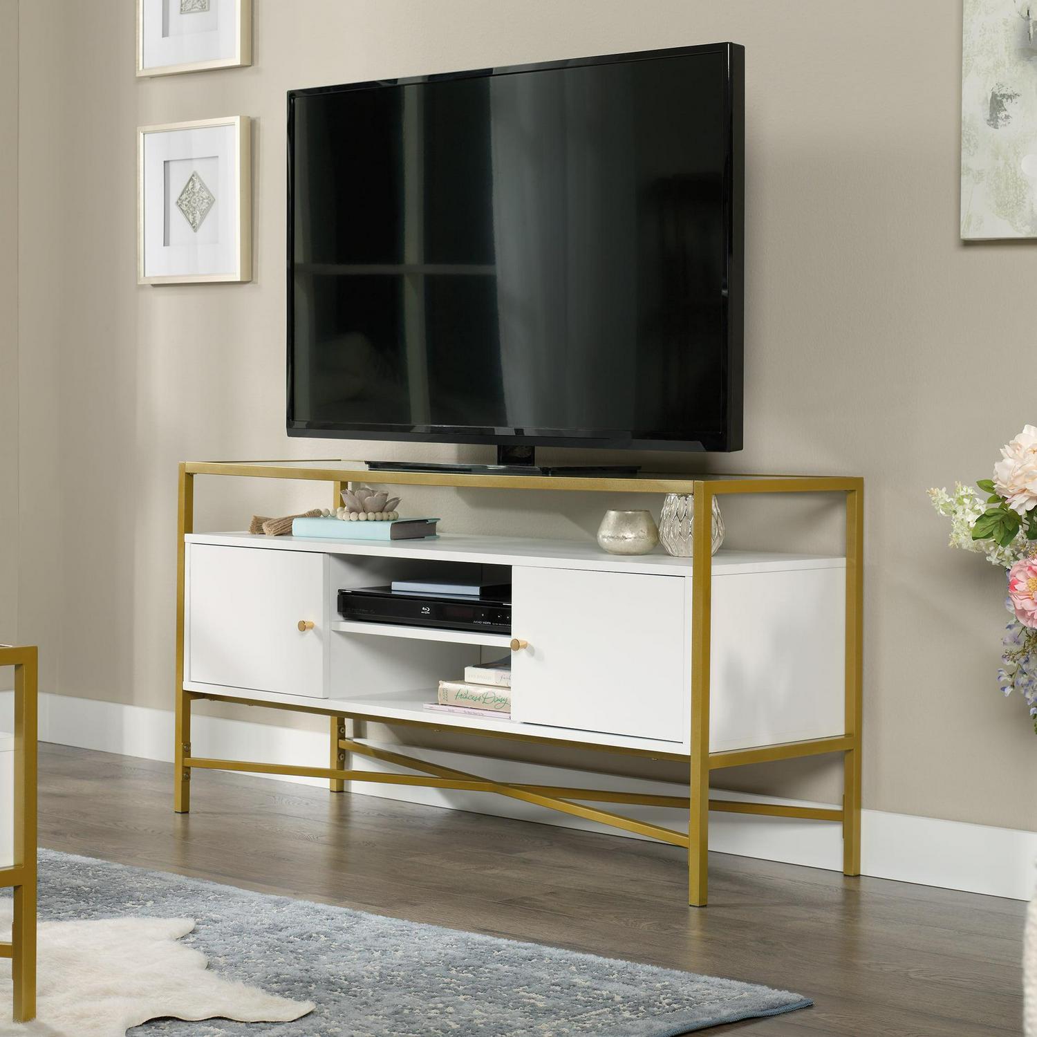 Enjoy the modern design of the Sauder Harper Heights TV Stand. This TV stand features 2 shelves and 2 enclosed storage compartments to house all your technological toys. It has wire management gromets, and holds a TV up to 55 in. The gold metal frame and choice of glass and wood finish complete the contemporary styling.