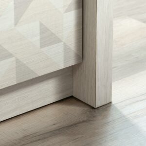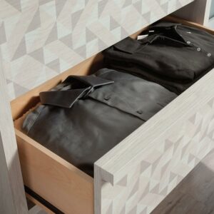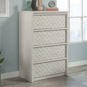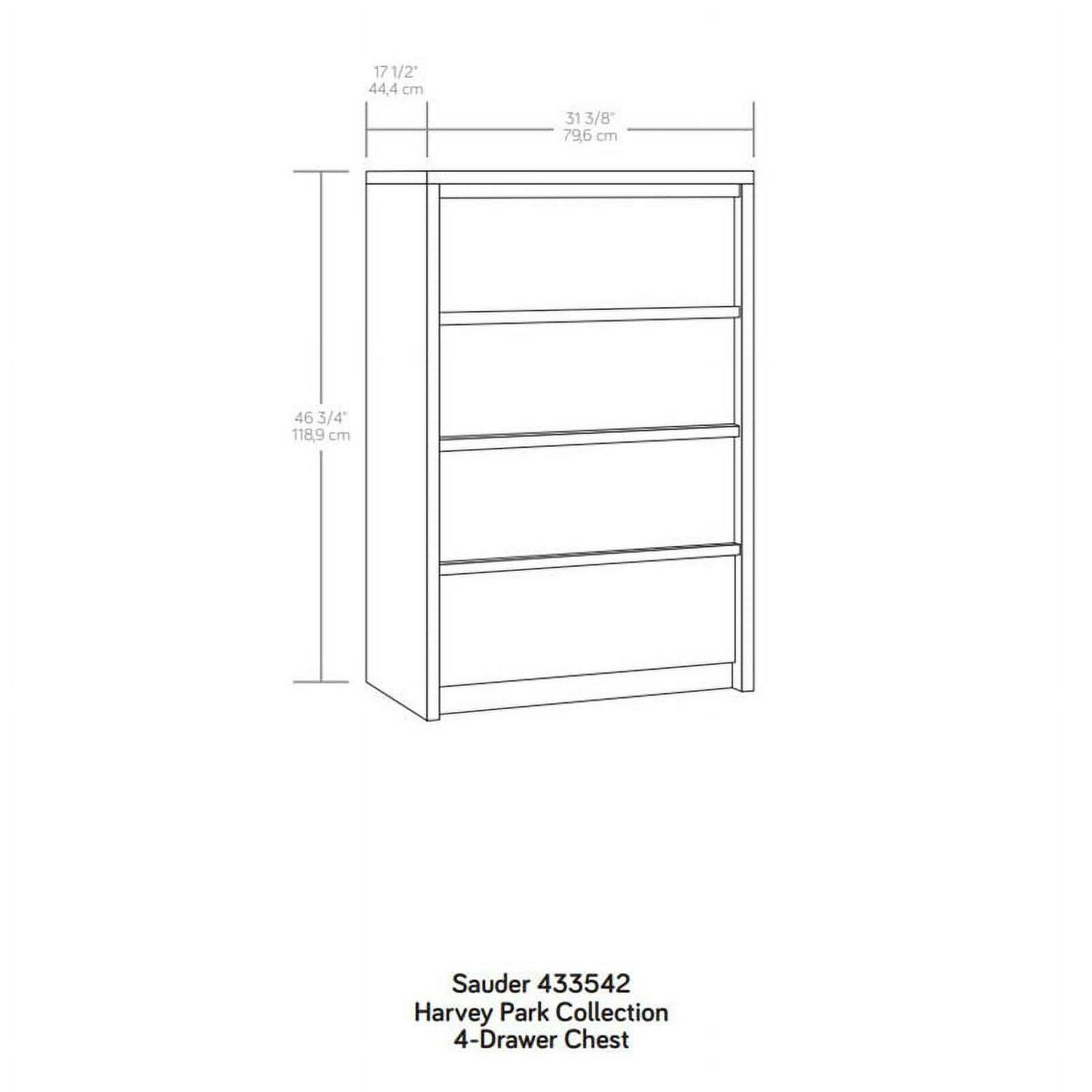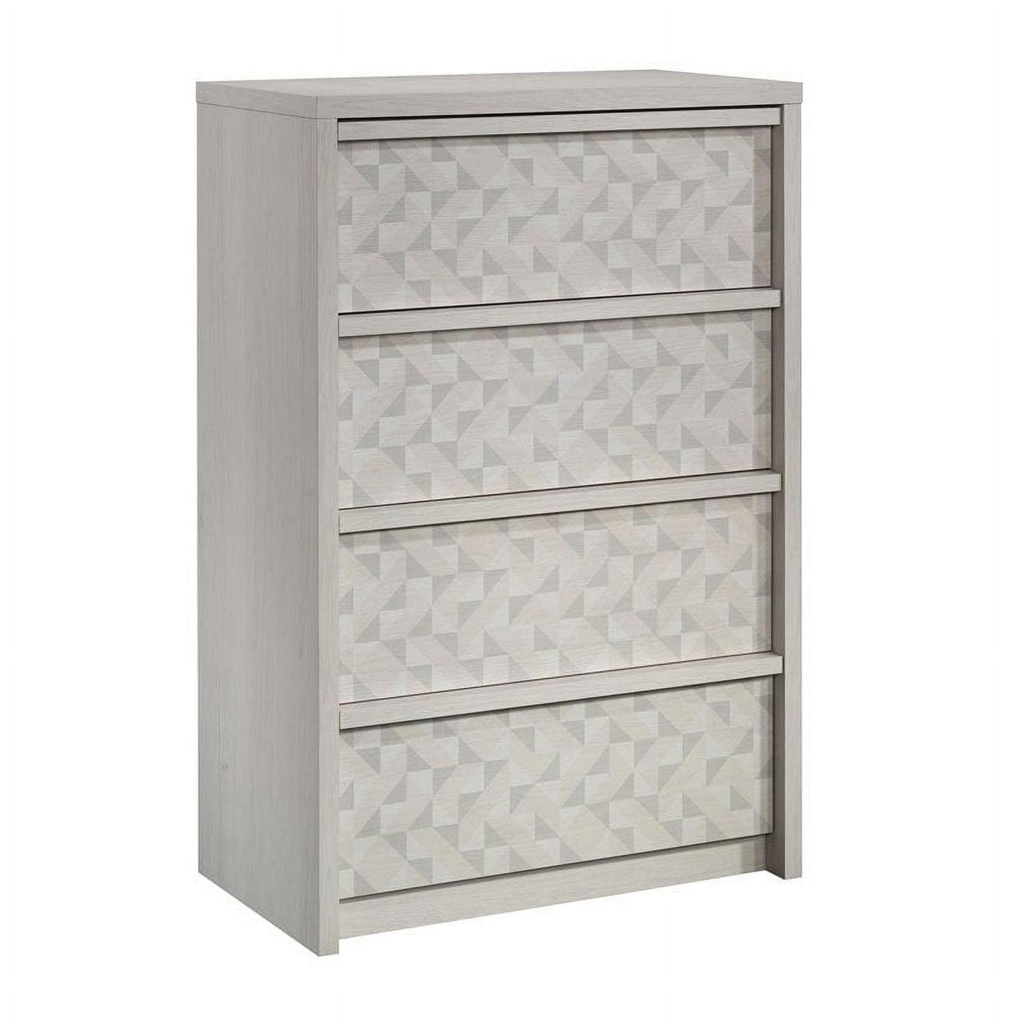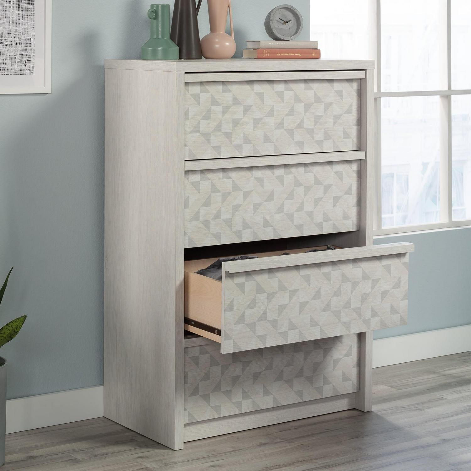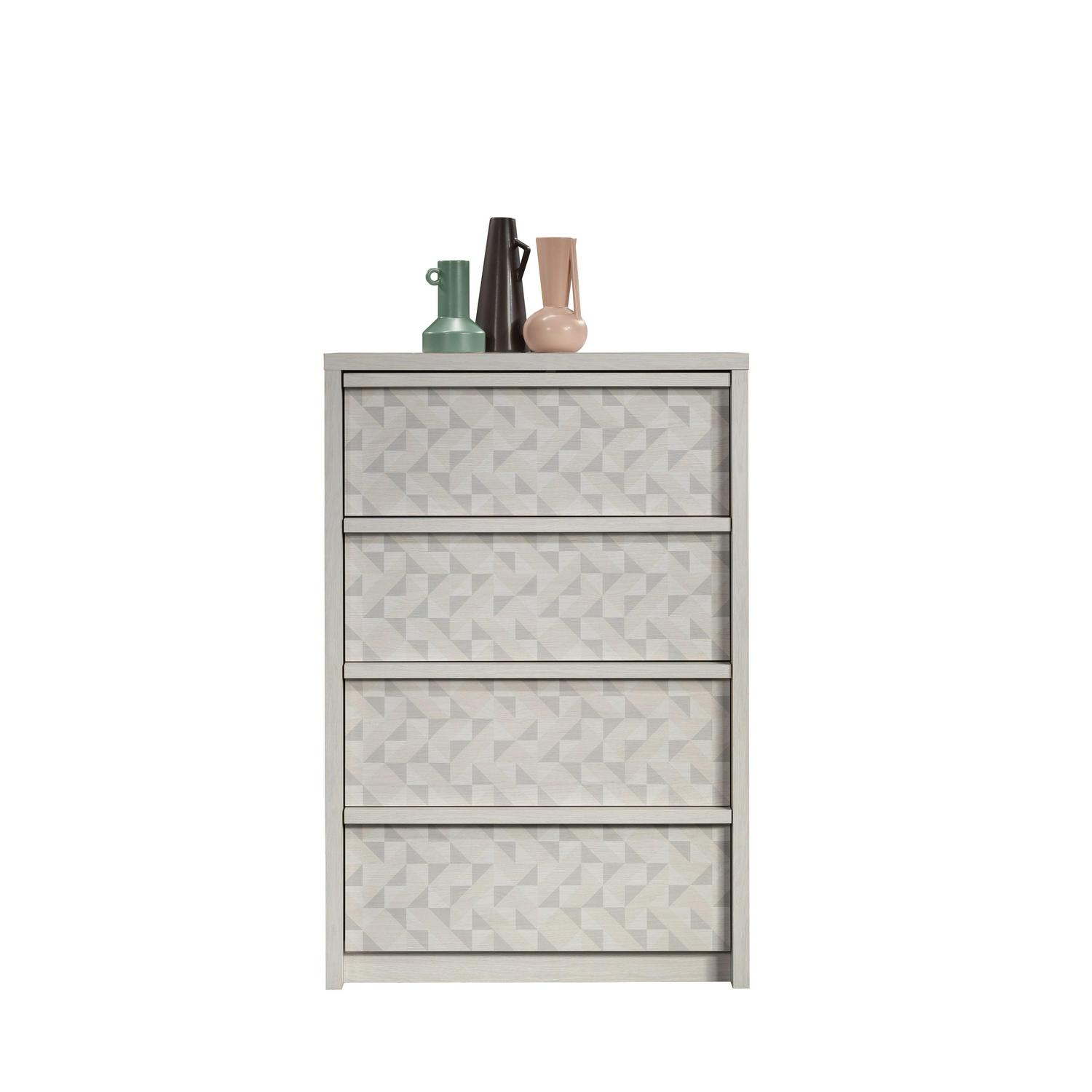 Tuck away your wardrobe in minimalist style with this 4-drawer chest from the Harvey Park collection. Find room for your array of blouses and slacks in one of the four drawers in this bedroom chest of drawers that open and close on smooth metal runners. These four drawers are spacious enough to hold your comfiest sweatshirts, thickest denim, or biggest duvet comforter. A T-lock drawer assembly system makes putting together this 4-drawer dresser as easy as can be. Use the top surface of this wood chest of drawers for displaying your jewelry, perfume bottles, or photos of your family. Finished in Glacier Oak with a geometric triangle front pattern, this 4-drawer dresser will have your bedroom feeling stylish and organized in no time. We hope you like what you see in this bedroom furniture. Sauder designers travel the world and bring back the best and latest in style, finish, and color trends. This inspiring world travel is evident in the cutting edge and innovative furniture solutions we offer to you!