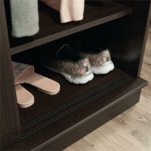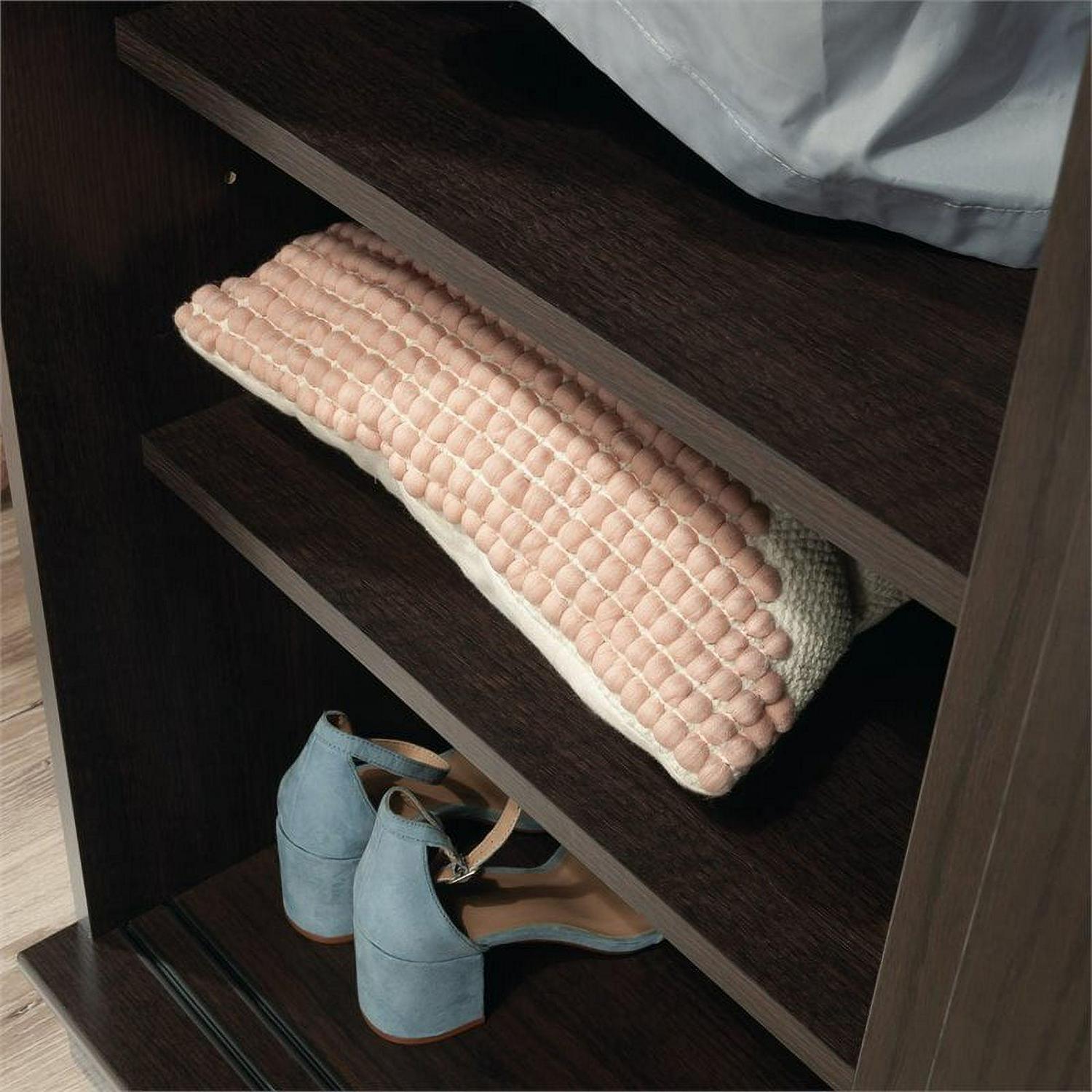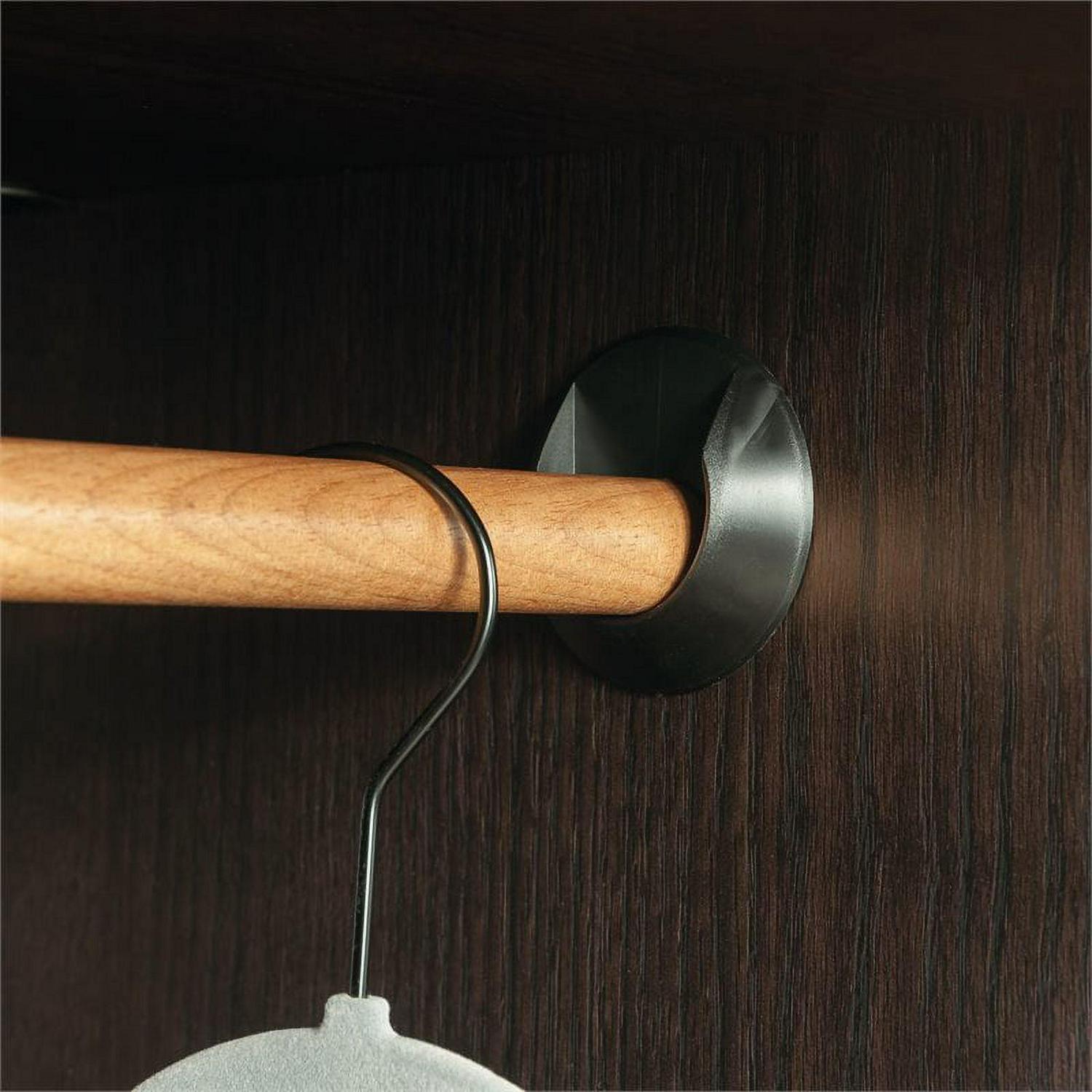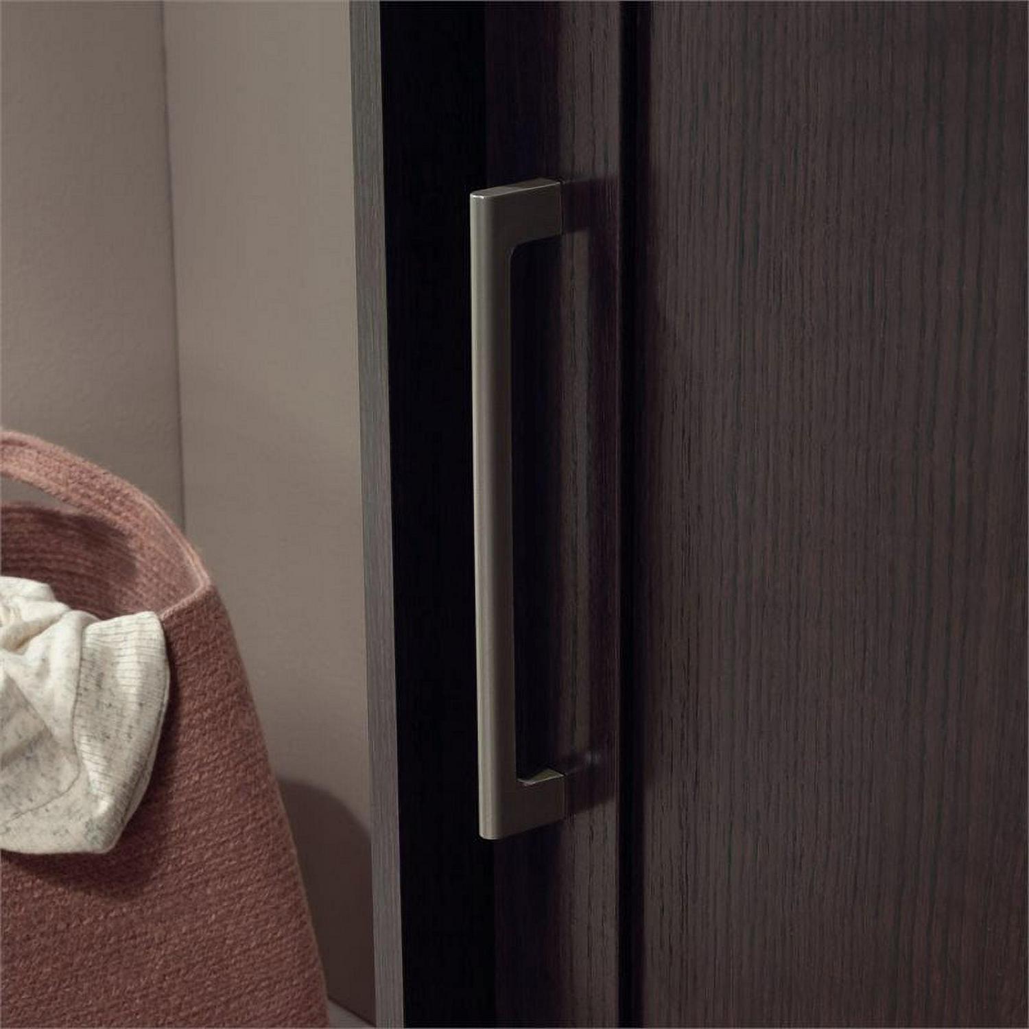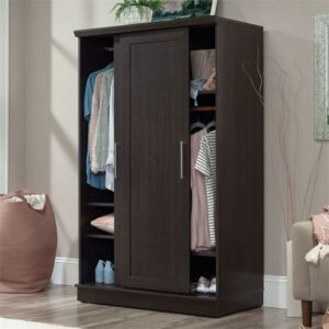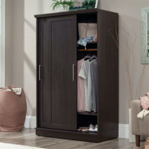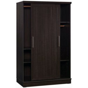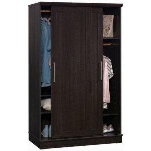 Hideaway storage options never looked so sleek. This 2-door wardrobe cabinet from the HomePlus collection adds closet space to your home without sacrificing on good looks. This wardrobe with sliding doors features two garment rods behind a set of sliding doors that offer hidden hanging storage for coats, blouses, and denim. This storage cabinet with sliding doors can be customized to your liking as the garment rod behind the left door can be placed in two positions to accommodate longer or shorter items. This 2-door armoire cabinet features three adjustable shelves for customization and to accommodate items of various sizes, as well as one fixed shelf. Use these shelves for stacks of sweatshirts, shoes, seasonal decor, or whatever needs to be stored away. Finished in a dark Dakota Oak this 2-door storage cabinet will add the hidden storage you need to your entryway, hallway, or guest room. We hope you like what you see. Our designers travel the world and bring back the best and latest in style, finish, and color trends. This inspiring world travelis evident in the cutting edge and innovative furniture solutions we offer to you! Other affordablefurnishings from the collection (sold separately) are available to complete the look. For assistanceafter the purchase, you can to reach out to our award-winning and friendly Midwest based customerservice. They are ready to help you every step of the way with any questions you might have aboutthe product. Please contact us at 1-800-523-3987.