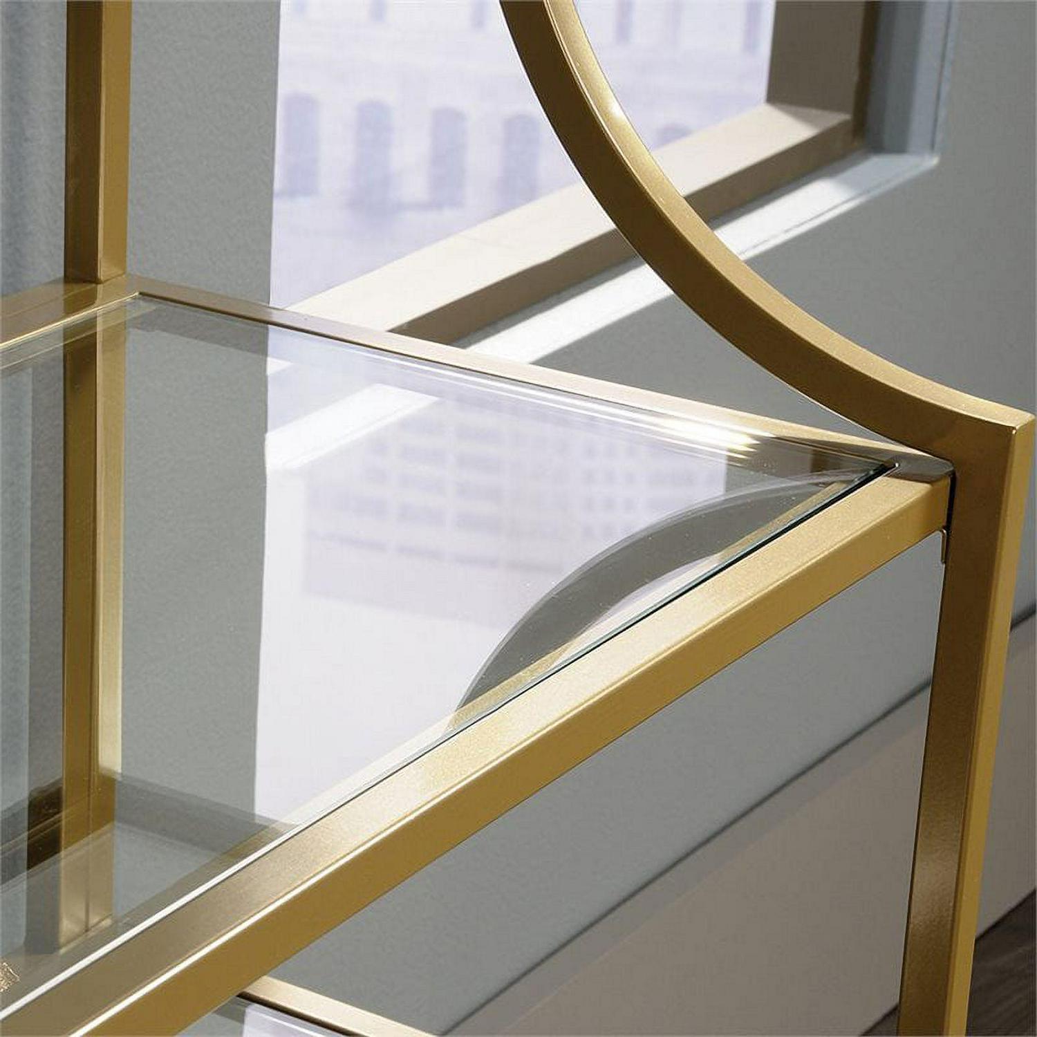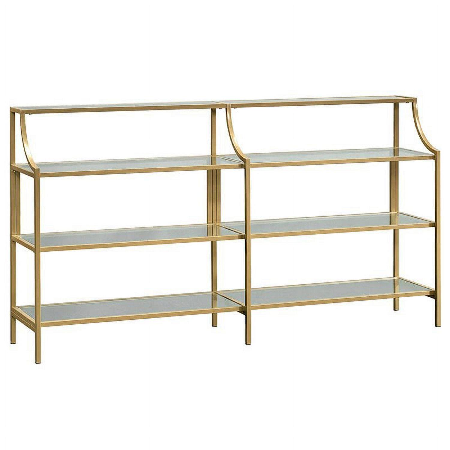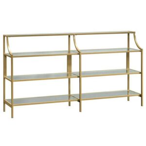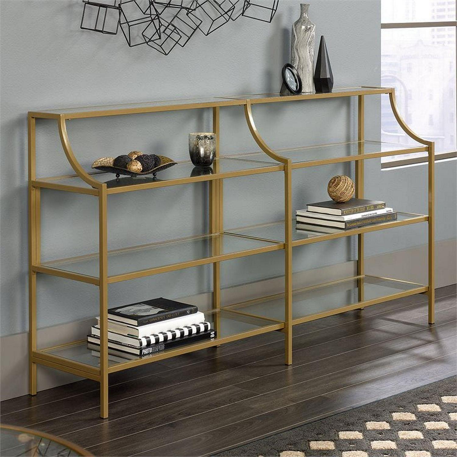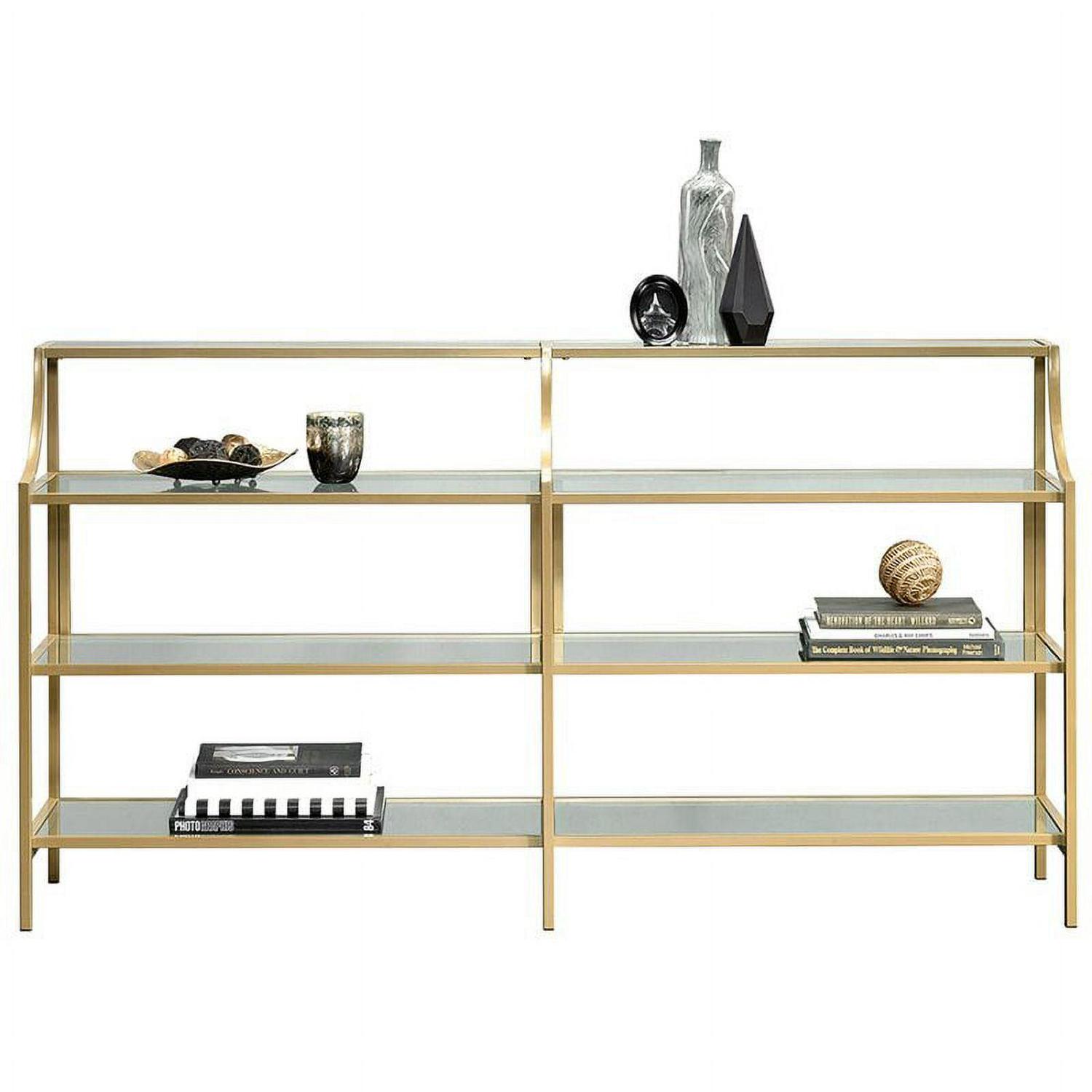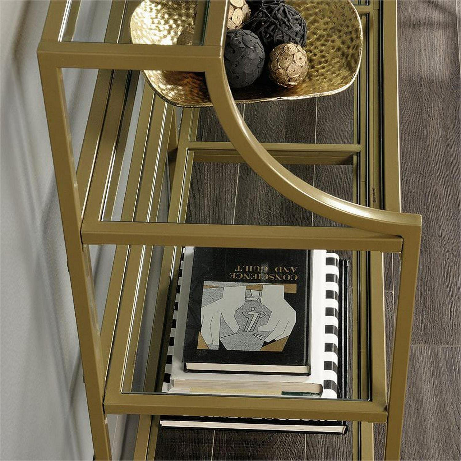 Display your knick knacks in style with the Sauder International Lux Glass Topped Console Table. This metal and tempered glass console table is finished in a satin gold. It has 3 long shelves for display and is finished on all sides so placement can be anywhere in the home.