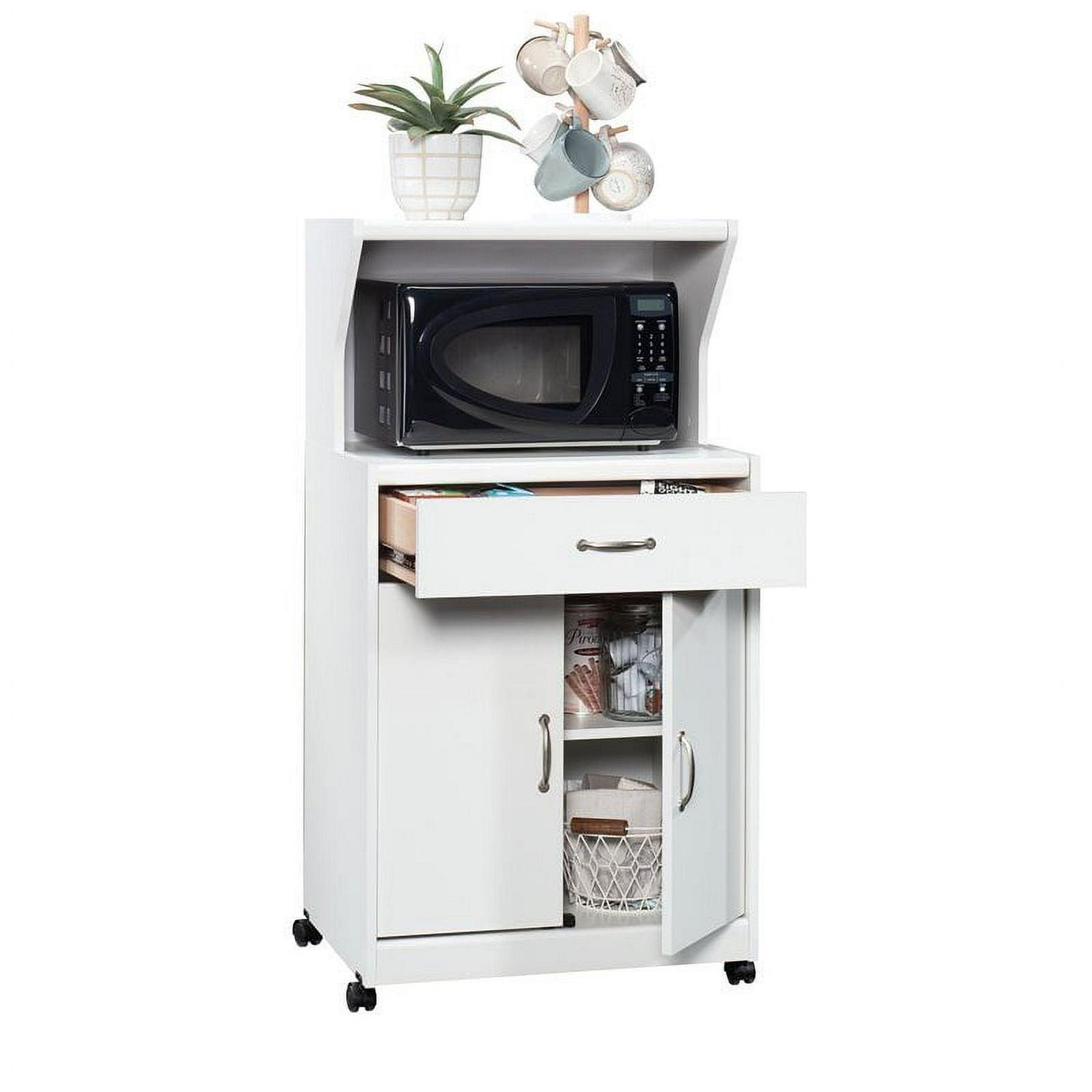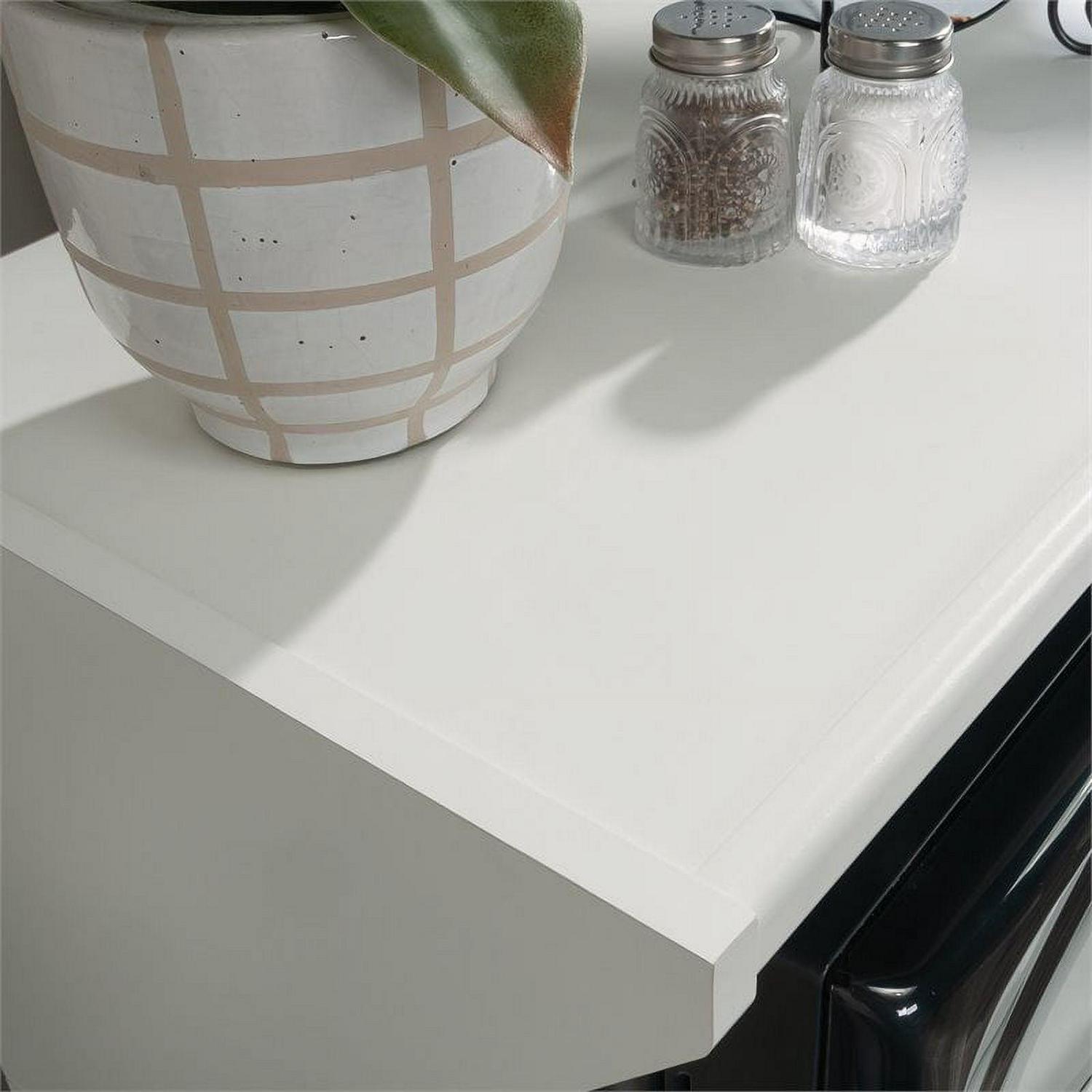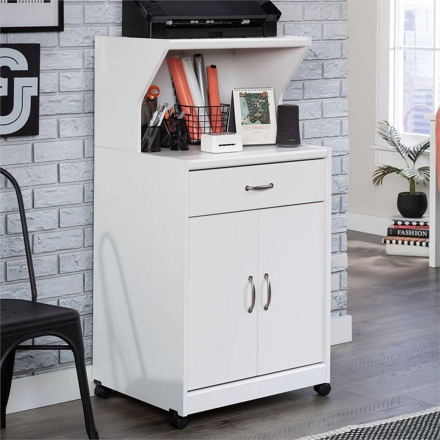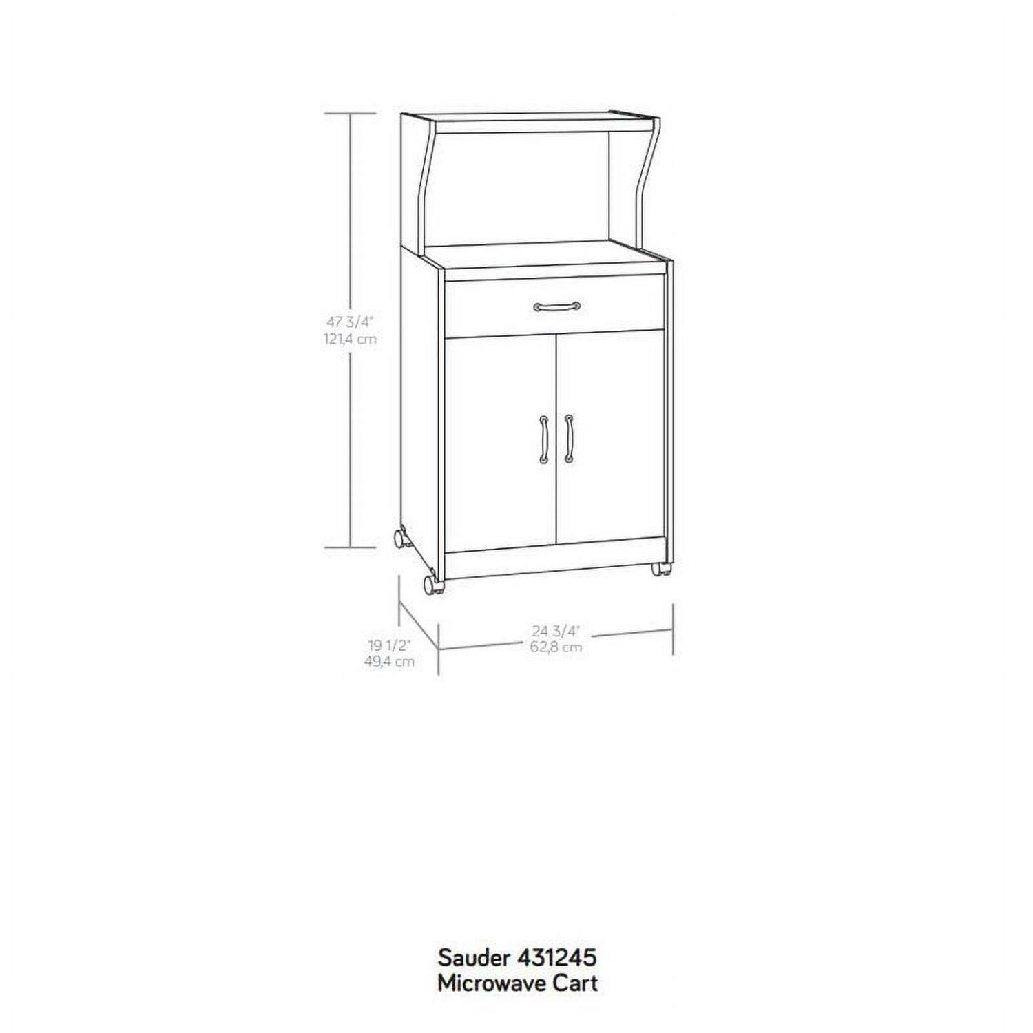 Add to your kitchen counter space without breaking the bank with this microwave kitchen cart from the Sauder Select collection. This kitchen cart with microwave shelf features a dedicated area for your microwave oven to avoid taking up valuable space on your kitchen counters. This kitchen cart microwave stand also has a spacious top shelf for additional display and storage of plates, paper towels, decor, and more! This kitchen microwave cart also includes a drawer with metal runners and safety stops to hold essential kitchen or pantry items. The lower hidden storage area behind the doors features an adjustable shelf for storage of other kitchen gadgets or extra cereal boxes. Dual-wheel casters for easy mobility allow you to move the cart from room to room, or corner to corner, depending on your needs. An enclosed back with cord access allows for easy pass through to avoid cord clutter. Assembly is quick and easy with a T-slot drawer system. Finished in Soft White, this multifunctional, white microwave kitchen cart will have you organized in no time.