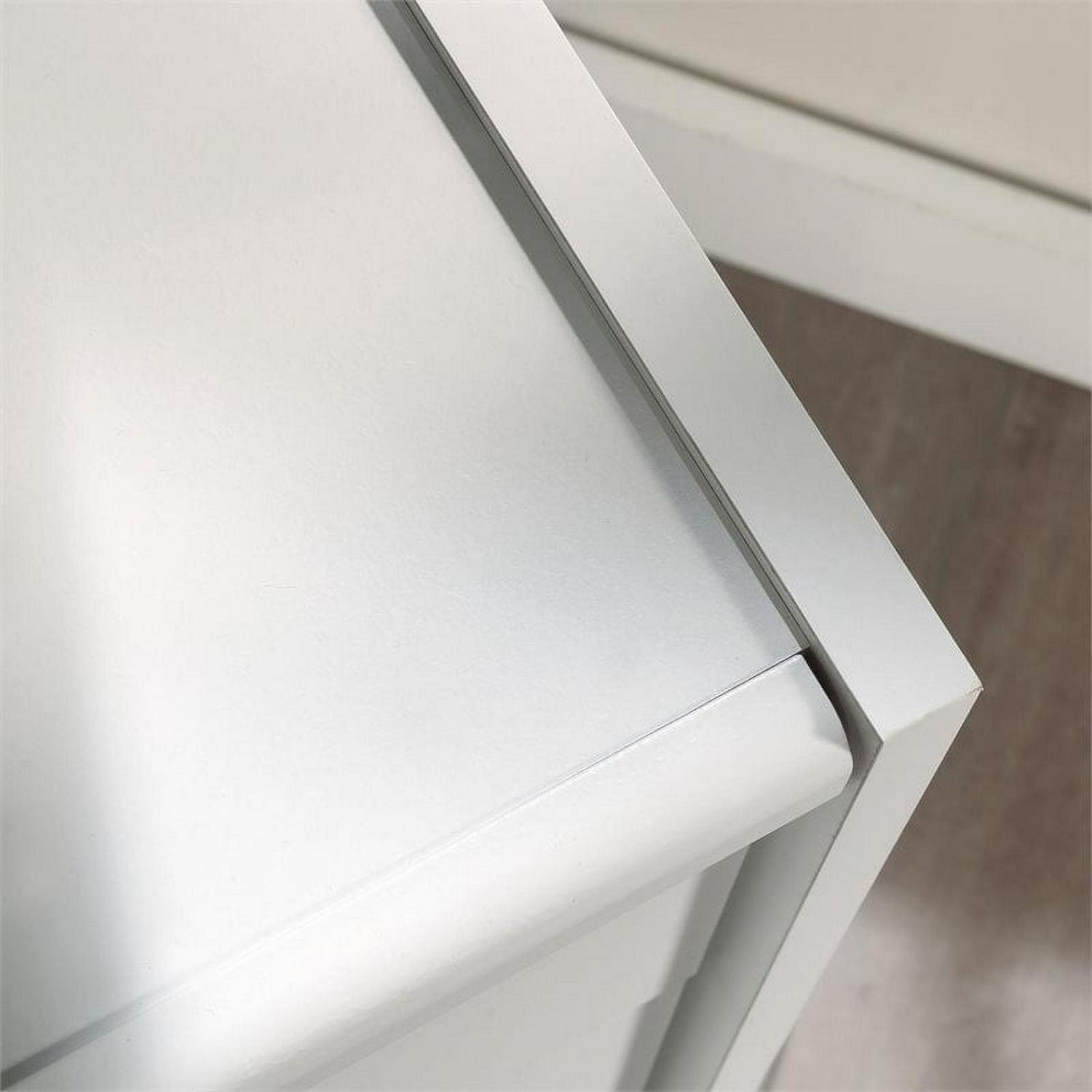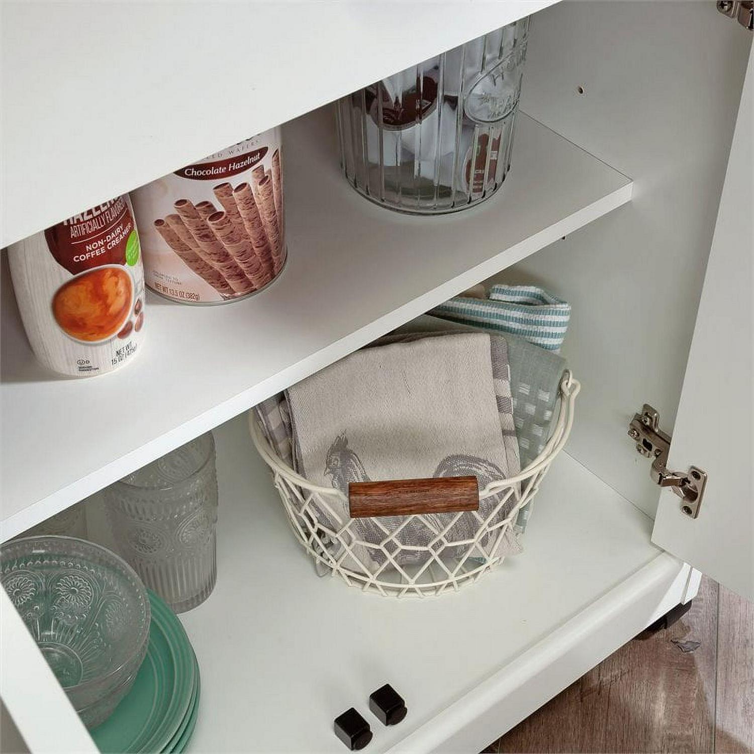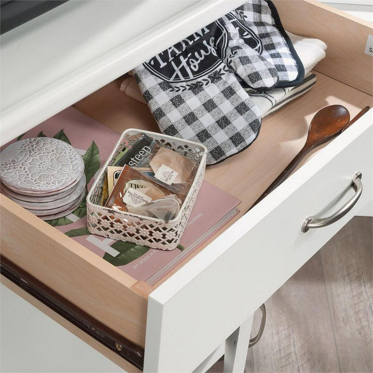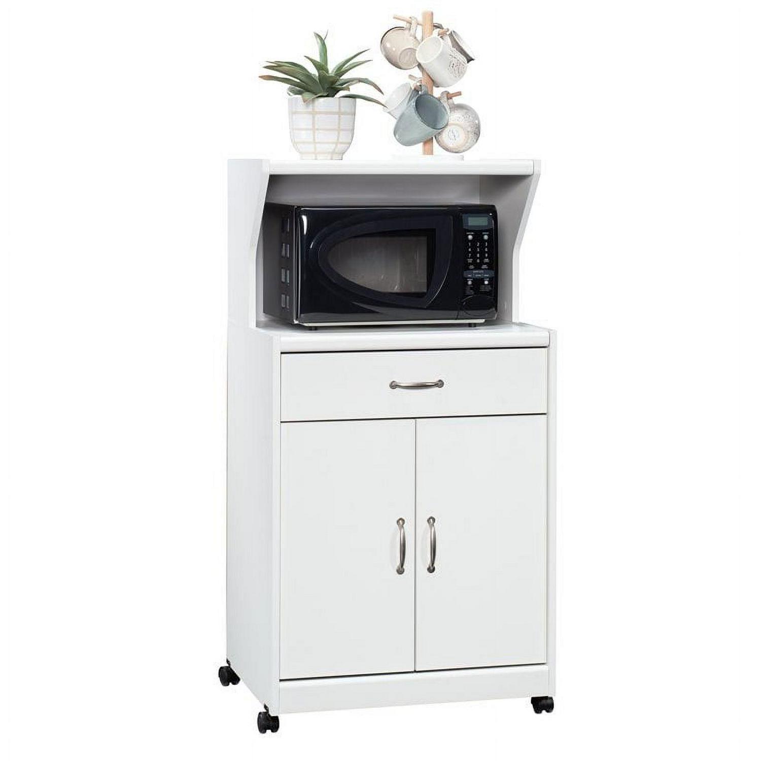Add to your kitchen counter space without breaking the bank with this microwave kitchen cart from the Sauder Select collection. This kitchen cart with microwave shelf features a dedicated area for your microwave oven to avoid taking up valuable space on your kitchen counters. This kitchen cart microwave stand also has a spacious top shelf for additional display and storage of plates, paper towels, decor, and more! This kitchen microwave cart also includes a drawer with metal runners and safety stops to hold essential kitchen or pantry items. The lower hidden storage area behind the doors features an adjustable shelf for storage of other kitchen gadgets or extra cereal boxes. Dual-wheel casters for easy mobility allow you to move the cart from room to room, or corner to corner, depending on your needs. An enclosed back with cord access allows for easy pass through to avoid cord clutter. Assembly is quick and easy with a T-slot drawer system. Finished in Soft White, this multifunctional, white microwave kitchen cart will have you organized in no time.