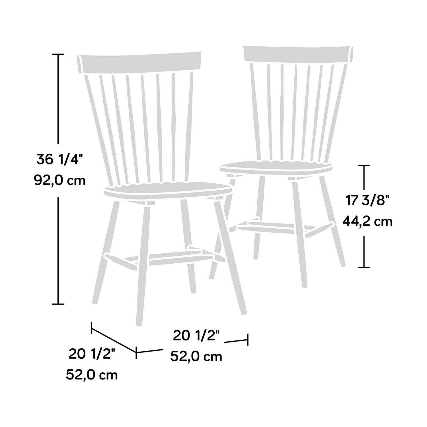 – Sauder New Grange Farmhouse Spindle Chairs, Pewter Green Finish:Assembled Dimensions: 20.5″ L x 21.3″ W x 36.2″ HSolid wood construction for durability and styleIncludes two chairs because one would be lonelyResidential use onlyFinished in Pewter Green5 year limited warrantyModel #: 427843Box Dimensions: 23.6″ L x 18.1″ W x 21.3″ HFor additional questions or any issues, please contact the manufacturer at 1-800-523-3987.Be sure to check out the Sauder New Grange collection for more great items!