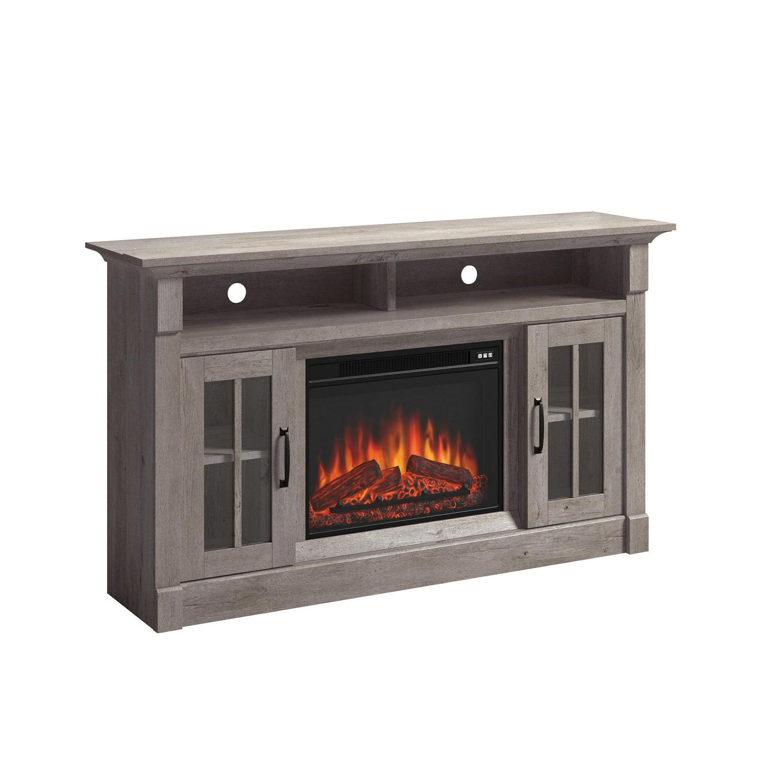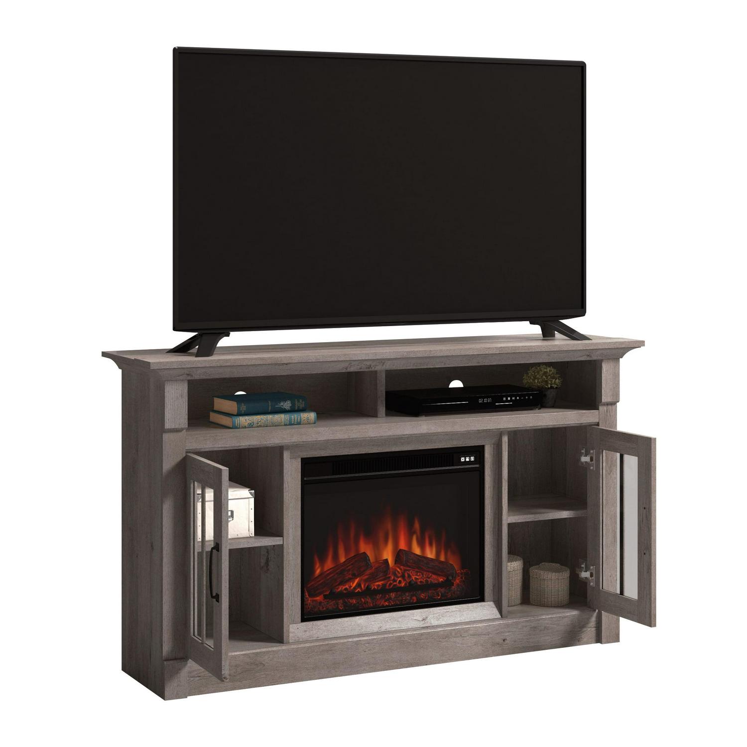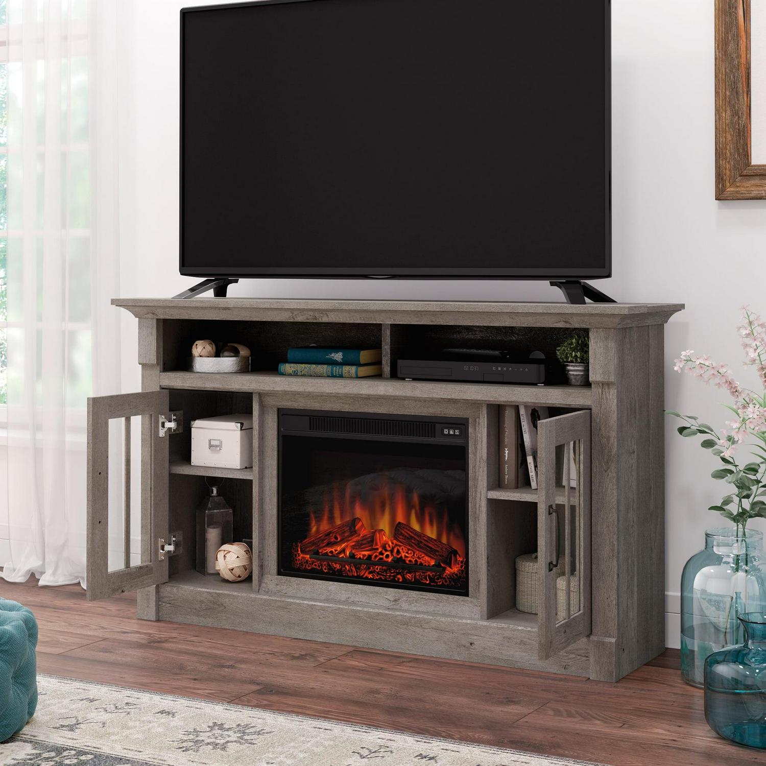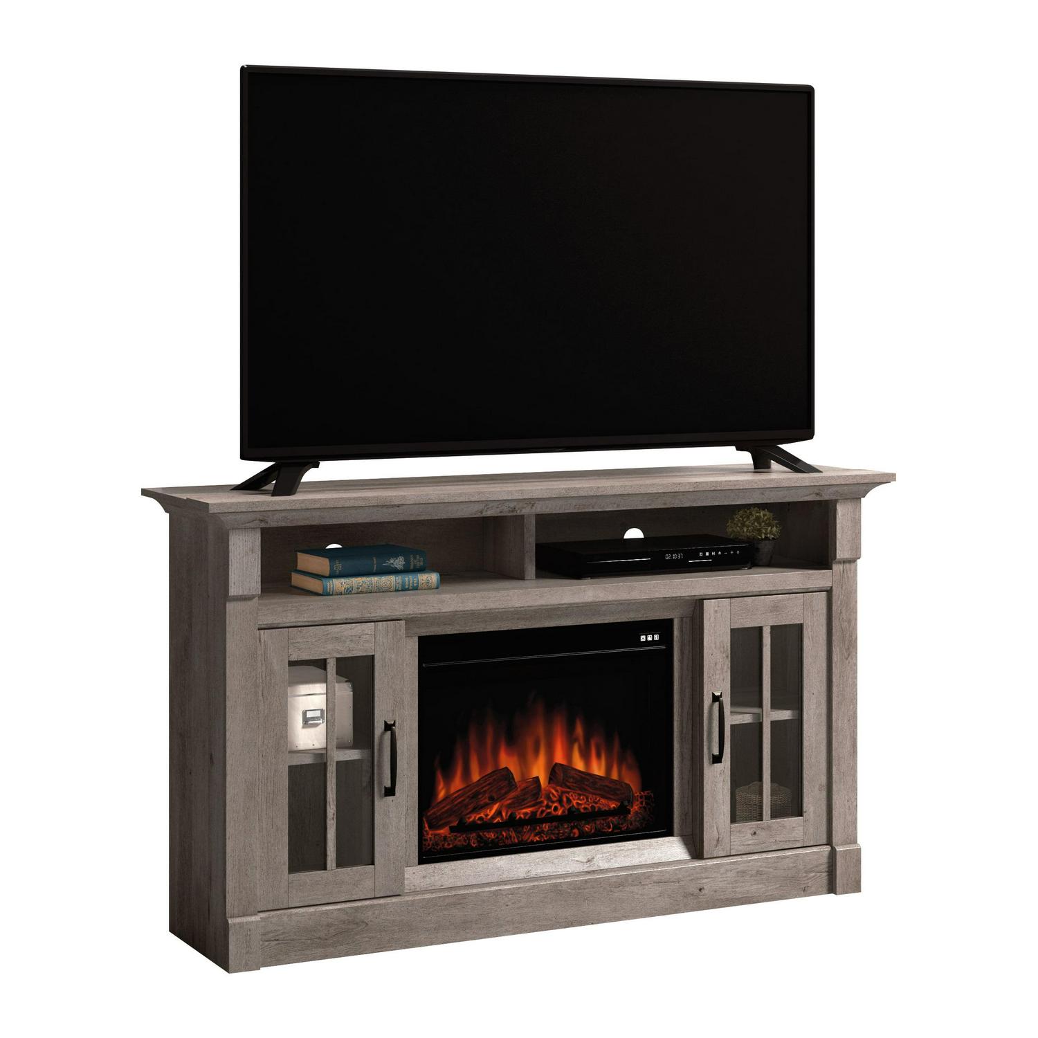 – Sauder Rustic Fireplace TV Stand, for TVs up to 65″, Mystic Oak Finish:
