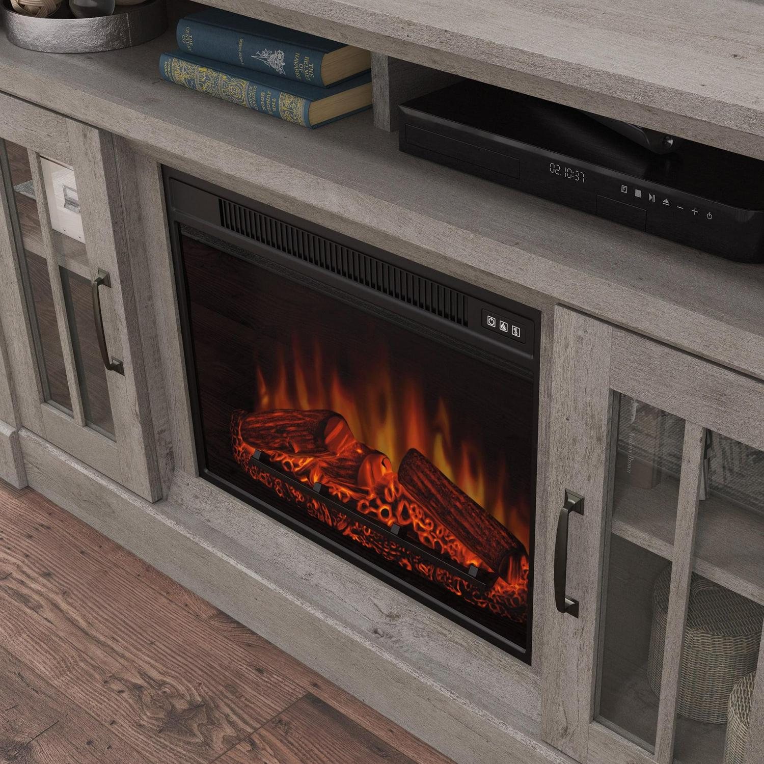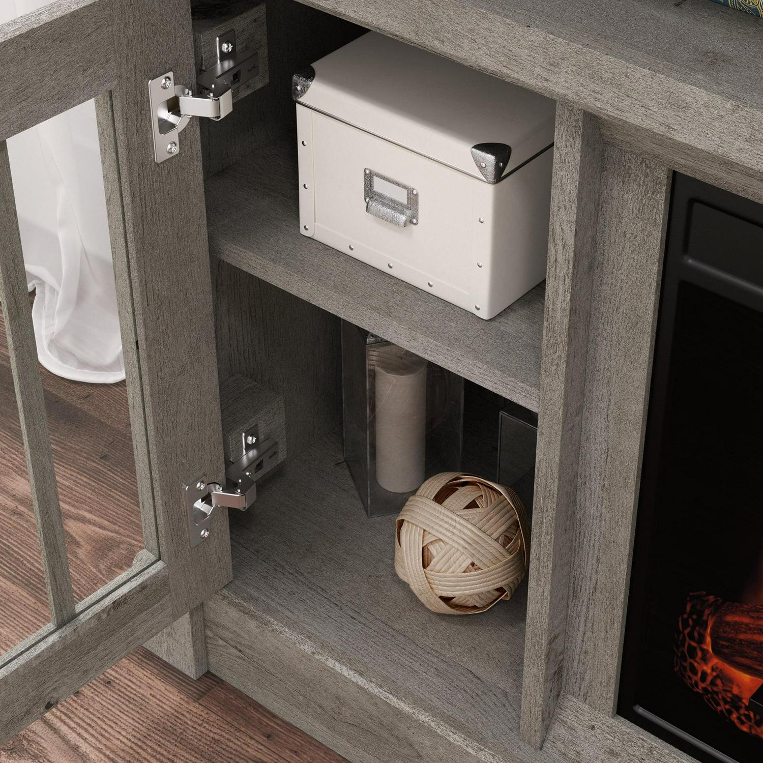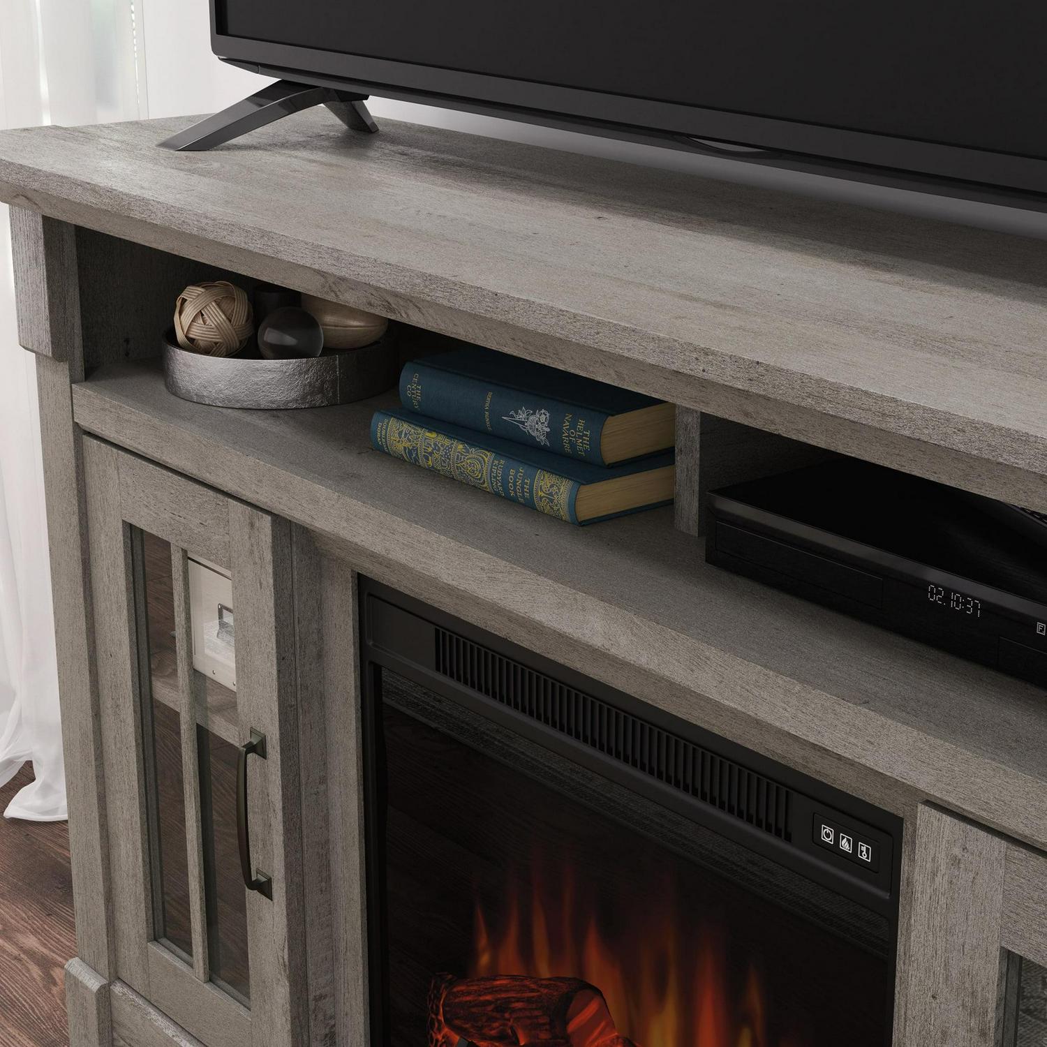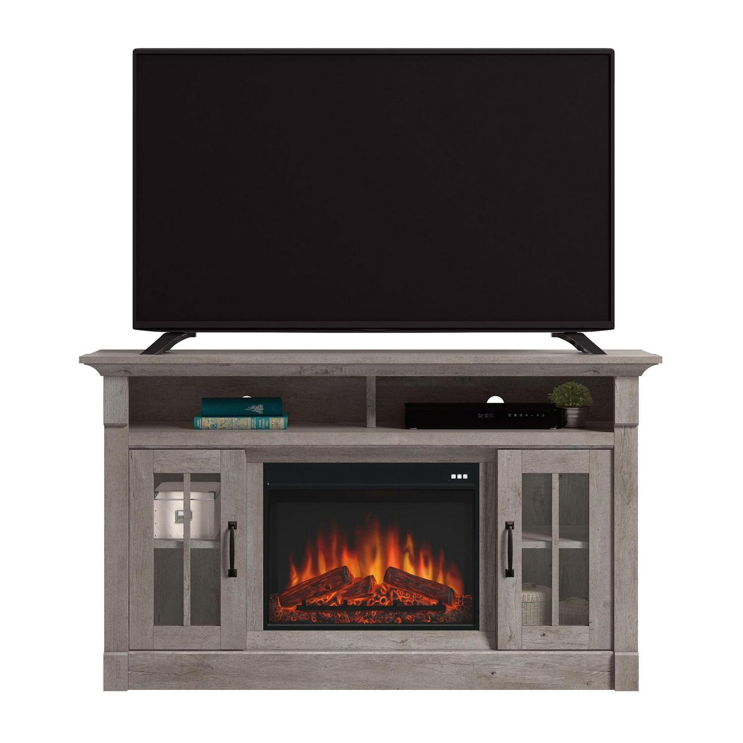 – Sauder Rustic Fireplace TV Stand, for TVs up to 65″, Mystic Oak Finish: