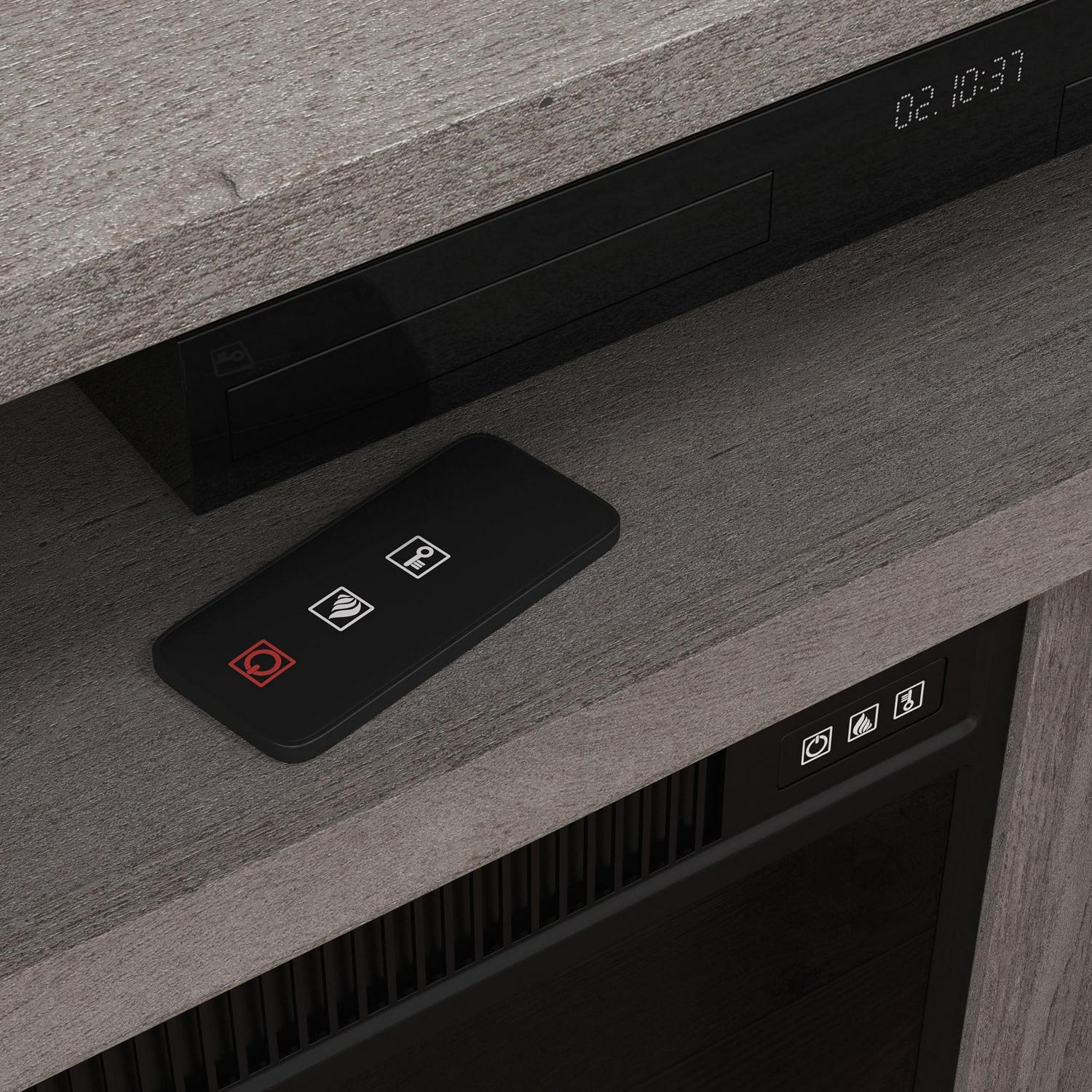 - Electric firebox with remote control and built-in overheat protection heats up to 400 square feet