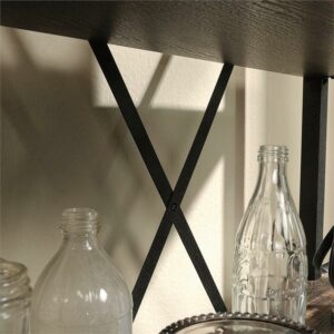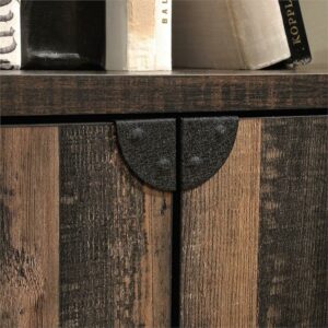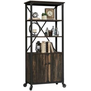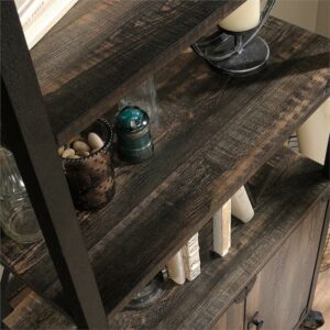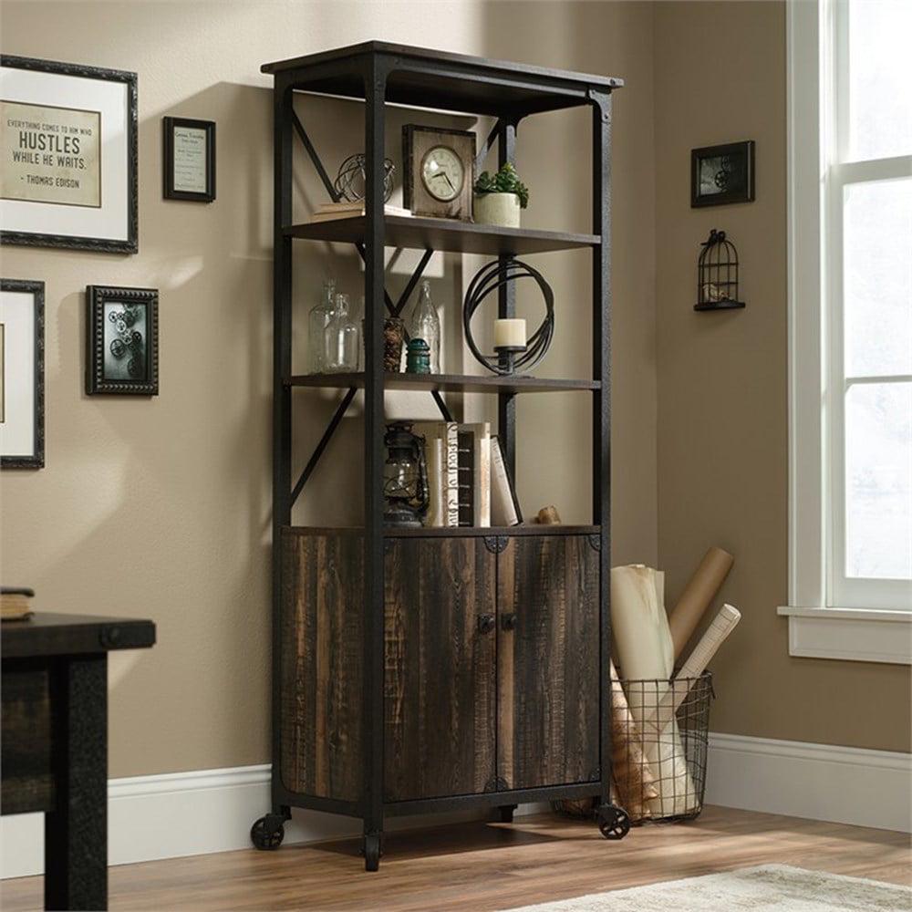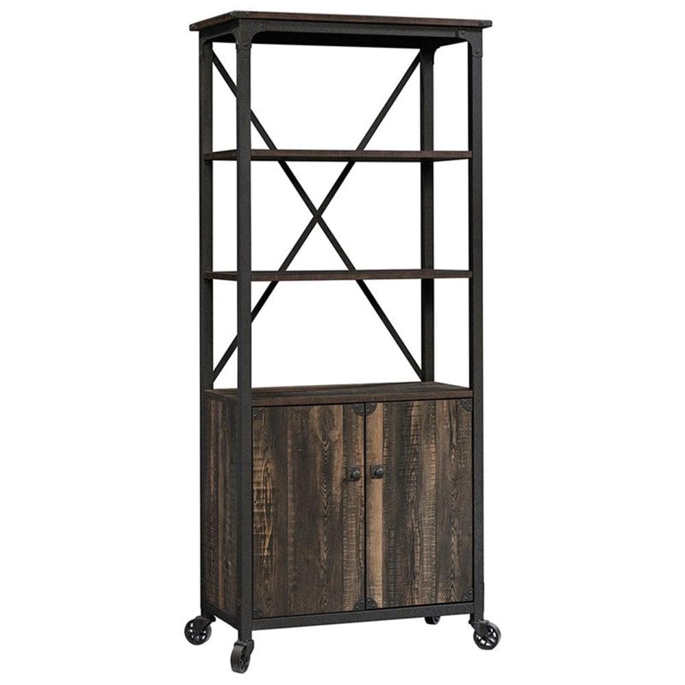 Craving a beautiful, rustic-inspired accented piece for your home We ve got just the thing for you. Add one-of-a-kind style and design to any room in your home with this bookcase with doors from the Steel River collection. It features three spacious open shelves that are ideal for storing and displaying a variety of different items like decorative plants, organizing bins, your collection of knick-knacks and photos of your family and friends too. This bookcase with doors features a hidden storage area that includes a large fixed shelf for additional storage of miscellaneous items that you prefer to not be seen. It is detailed with rear crossbars for stability and non-rolling fixed casters to add an extra touch of unique style. It will catch the eye of all your guests! Finished in carbon oak and accented with a textured, powder coated metal frame, this handsome storage bookshelf will make the perfect addition to any room in your home.