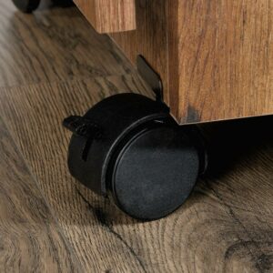 Its a sewers dream come true! Create the space you need to work on all your big sewing and crafting projects with this sewing/craft cart from the Sauder Select collection. This sewing craft table offers a spacious top surface that provides you with the room you need for all your supplies like your sewing machine, scrapbooks, spools of thread and organizing bins. Need additional work space We got you covered. The drop leaf table top provides you with the extra space you need for sewing and crafting. This sewing and craft table features easy access storage behind its roll-open doors that includes two storage bins and a hidden shelf for your sewing machine. Behind the door it also features two adjustable shelves that can move to different heights to create flexible storage for items of all shapes and sizes. This rolling sewing table includes easy-roll casters so it can easily move to wherever your projects take you. Finished in Vintage Oak, this handy craft cart gives you the style you want with the functionality you need.
