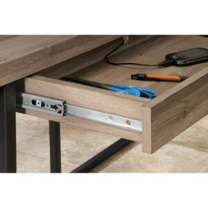The Sauder Transit L-Shaped Desk – Salt Oak does more with less, thanks to a streamlined, space-efficient design that offers plenty of storage and multi-purpose work space. Crafted from steel and engineered wood with a salt oak finish, this modern computer desk is suitable for the studio, office, or home office.