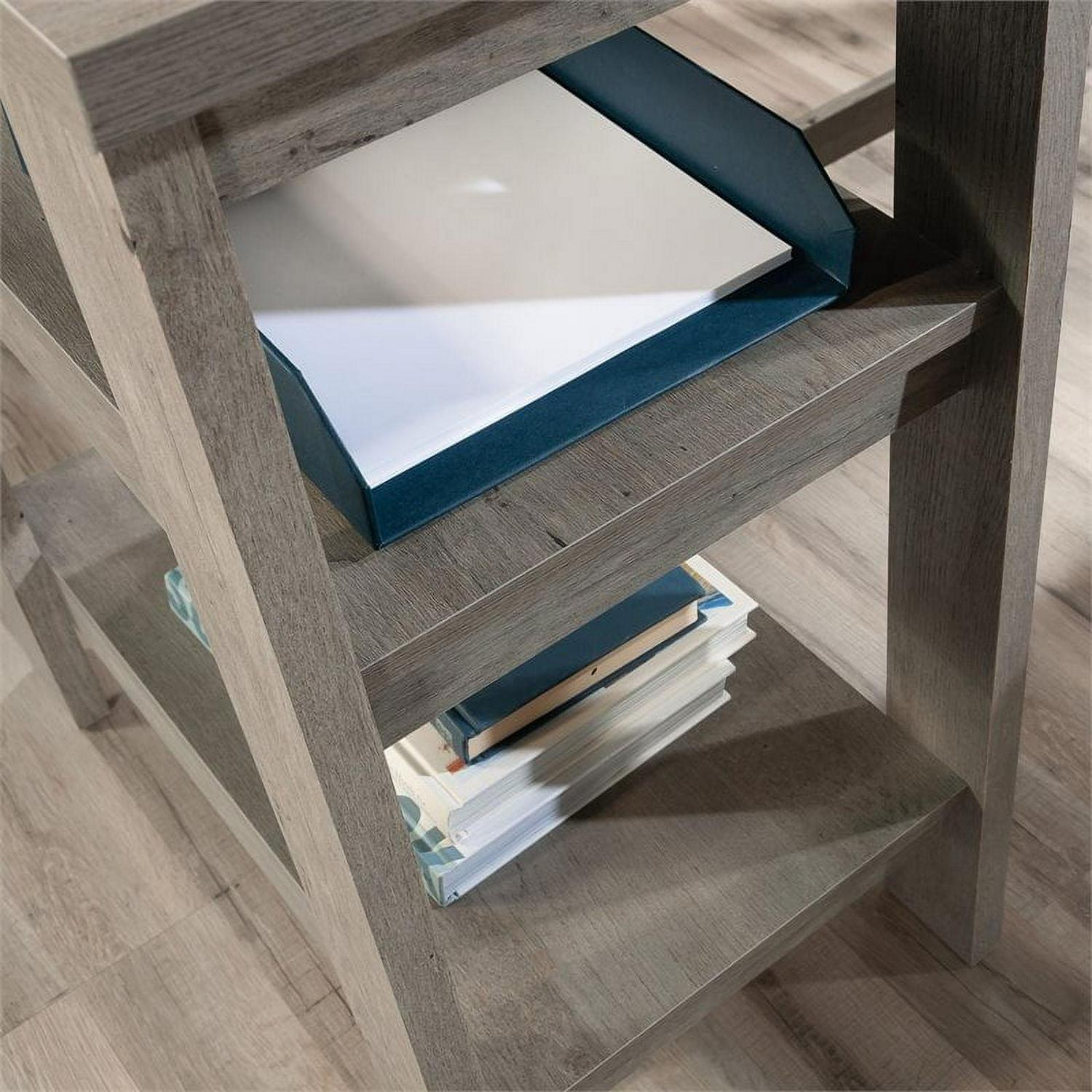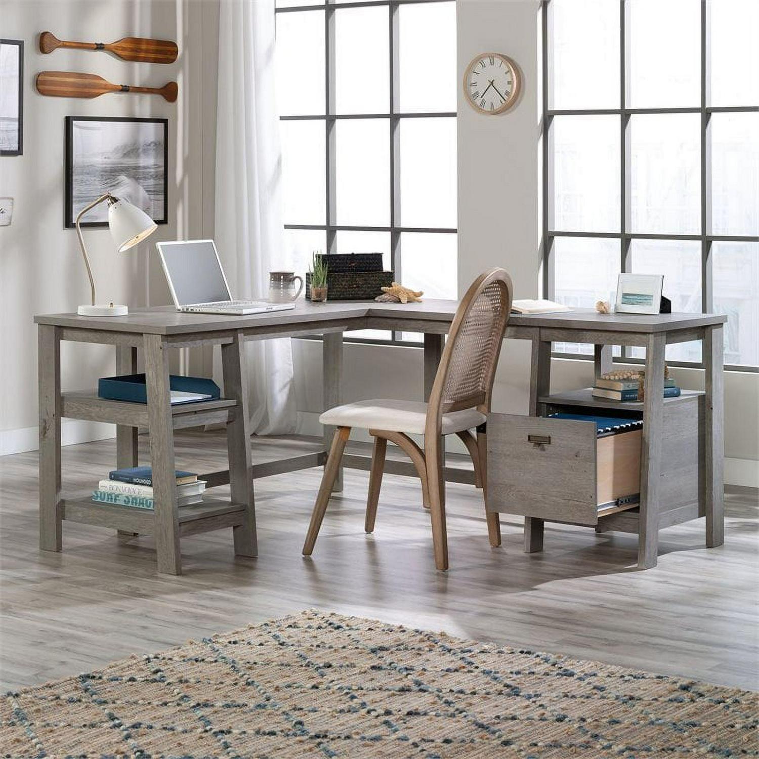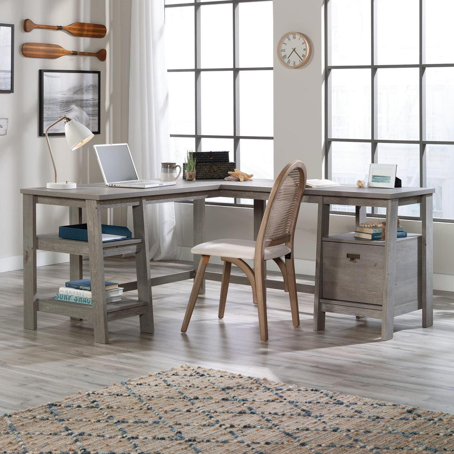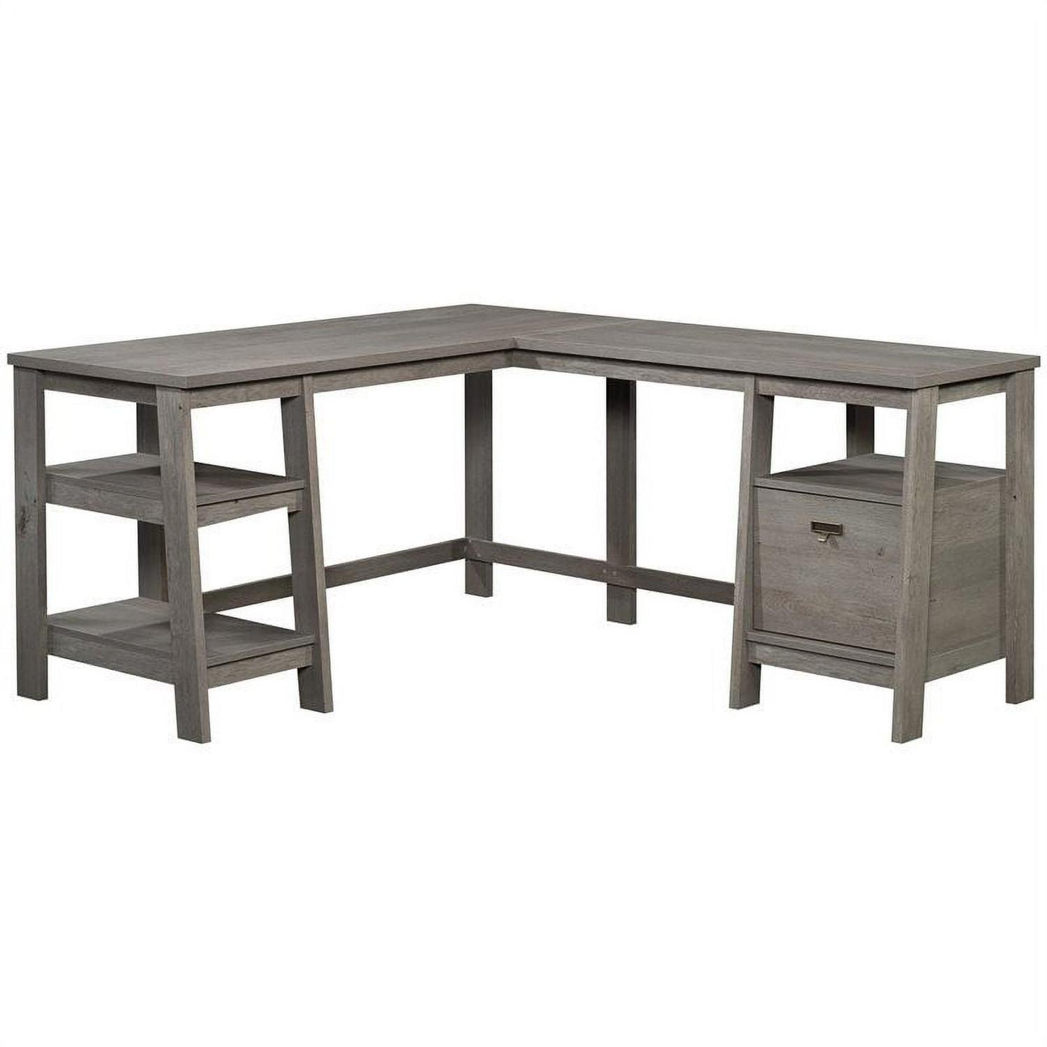 A desk fit for any work from home CEOthe l-shaped desk from the Trestle collection will instantly elevate your home workspace. This trestle desk features strong and lightweight panel construction, making it easy to assemble and rearrange in your home. The file drawer of this l-shaped home office desk features full extension slides and holds your most important letter-size hanging files. Three open shelving options give this l-shaped desk with drawer multiple storage and display options for items like books, folders, binders, small organizing bins, and more. This desk with open shelves is finished on all sides for versatile placement, giving a polished look from every angle. Quick and easy assembly with a T-lock drawer system means there is more time for studying and less time assembling. Finished in a cool Mystic Oak, this l-shaped desk has enough storage, display, and top surface space for all your work needs. We hope you like what you see. Our designers travel the world and bring back the best and latest in style, finish, and color trends. This inspiring world travelis evident in the cutting edge and innovative furniture solutions we offer to you! Other affordablefurnishings from the collection (sold separately) are available to complete the look. For assistanceafter the purchase, you can to reach out to our award-winning and friendly Midwest based customerservice. They are ready to help you every step of the way with any questions you might have aboutthe product. Please contact us at 1-800-523-3987.