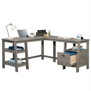 – Sauder Trestle L-Shaped Trestle Desk, Mystic Oak Finish:Assembled Dimensions: 59.1″ L x 66.2″ W x 29.3″ HStrong and lightweight panel constructionFile drawer with full extension slides holds letter-size hanging filesOpen shelving for additional storageFinished on all sides for versatile placementQuick and easy assembly with T-lock drawer systemMystic Oak finish5 year limited warrantyModel #: 428256Box Dimensions: 64.4″ L x 23.7″ W x 5.0″ HFor additional questions or any issues, please contact the manufacturer at 1-800-523-3987.Be sure to check out the Sauder Trestle collection for more great items!Assembled Dimensions: 59.1″ L x 66.2″ W x 29.3″ HStrong and lightweight panel construction