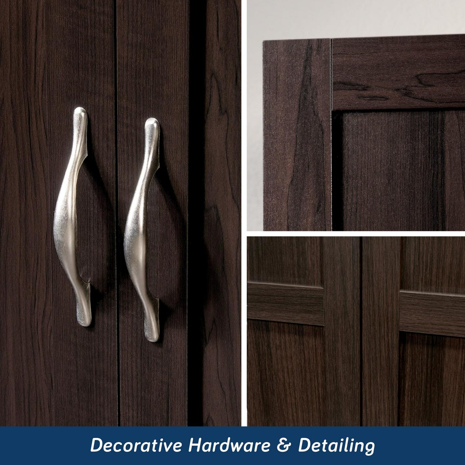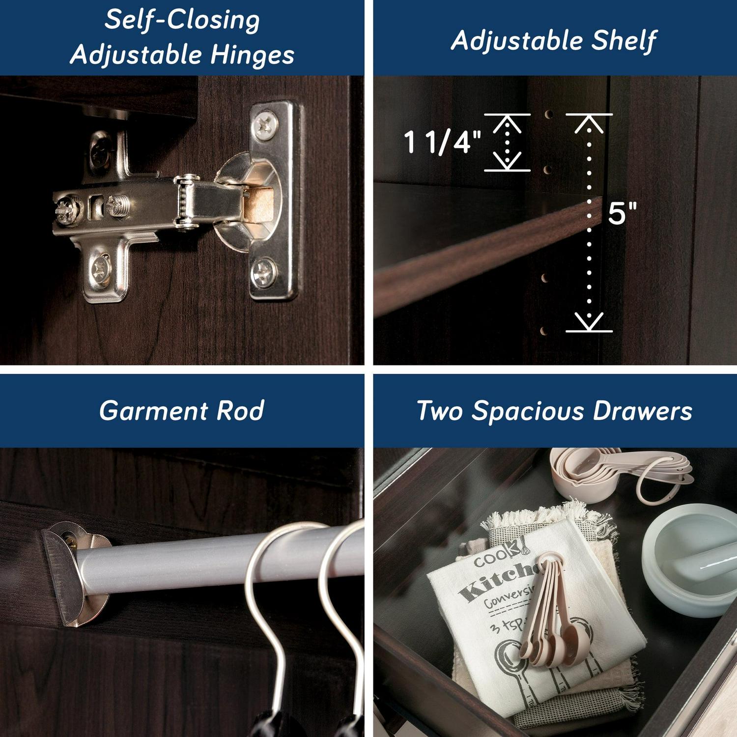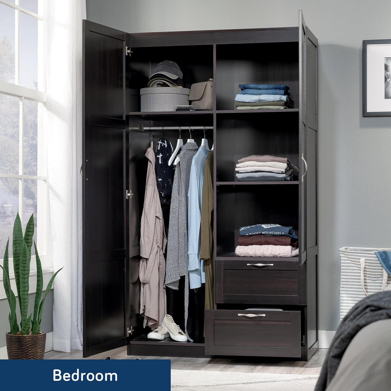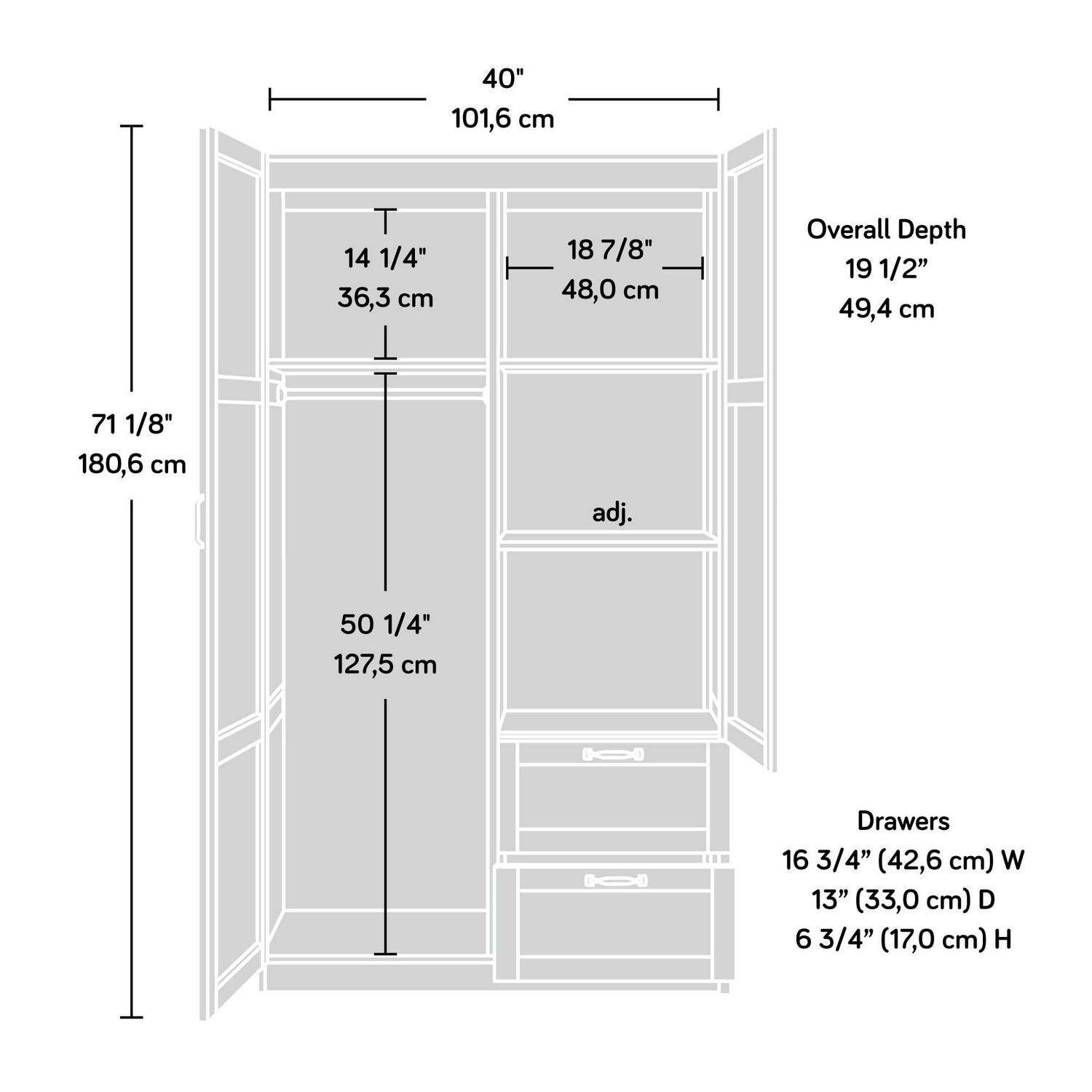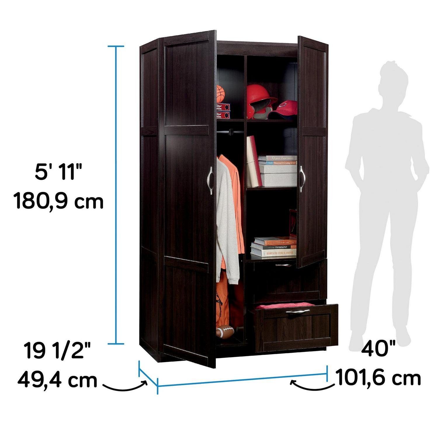 Need a place to store your abundance of clothes, linens, jackets, school or work supplies, and much more Check out this storage cabinet from Sauder Select collection. This cabinet with doors features a garment rod to hang coats, jackets, your school uniform, dress clothes, and anything that needs to be kept wrinkle free. The upper fixed shelf behind the full-length door, and one fixed and one adjustable shelf behind the upper door, give you ample room to store board games, shoes, organizing bins, seasonal outerwear, books anything you could think of! Two lower easy-to-access sliding drawers with metal runners, create storage space for blankets, pillows, extra bed sheets and more. The storage possibilities are endless! Place this storage wardrobe in any room of your home for ample storage space. Finished in a dark Cinnamon Cherry and detailed with framed panel doors and sides, this wardrobe with drawers is the perfect storage solution for you.