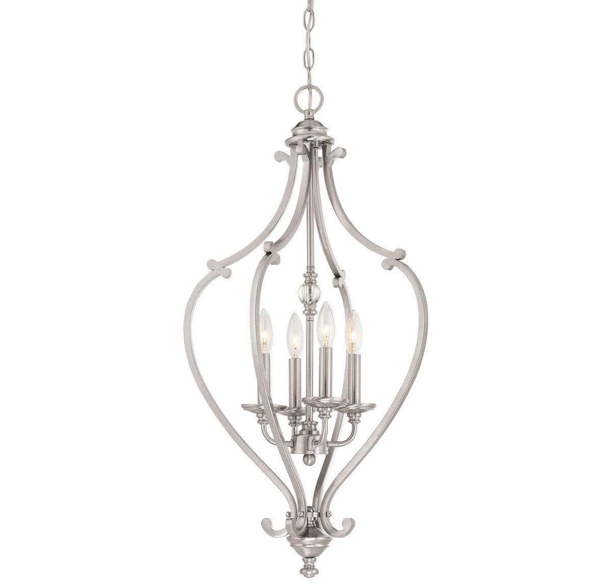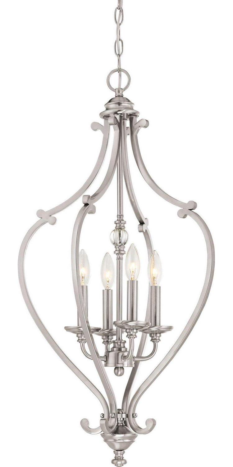 Oh, you didn t know a fixture could be as charming as the city it s named for Well, bless your heart! Meet the Minka Lavery Savannah Row, a southern-spirited, classically colored chandelier that s as pleasant as sitting on a wraparound porch with a glass of sweet tea. In the center of the fixture, four candelabra-style bulbs sit perched in crisp brushed nickel candle covers. Around the lit centerpiece, brushed nickel arms jet out into a soft diamond shape with small curlicue embellishments at t