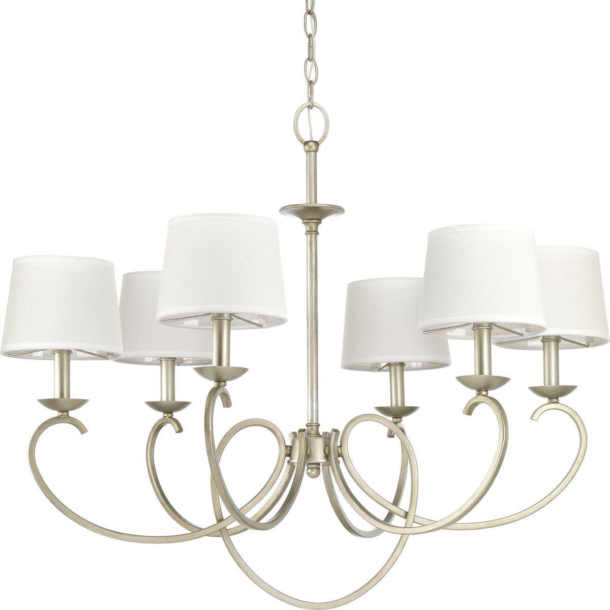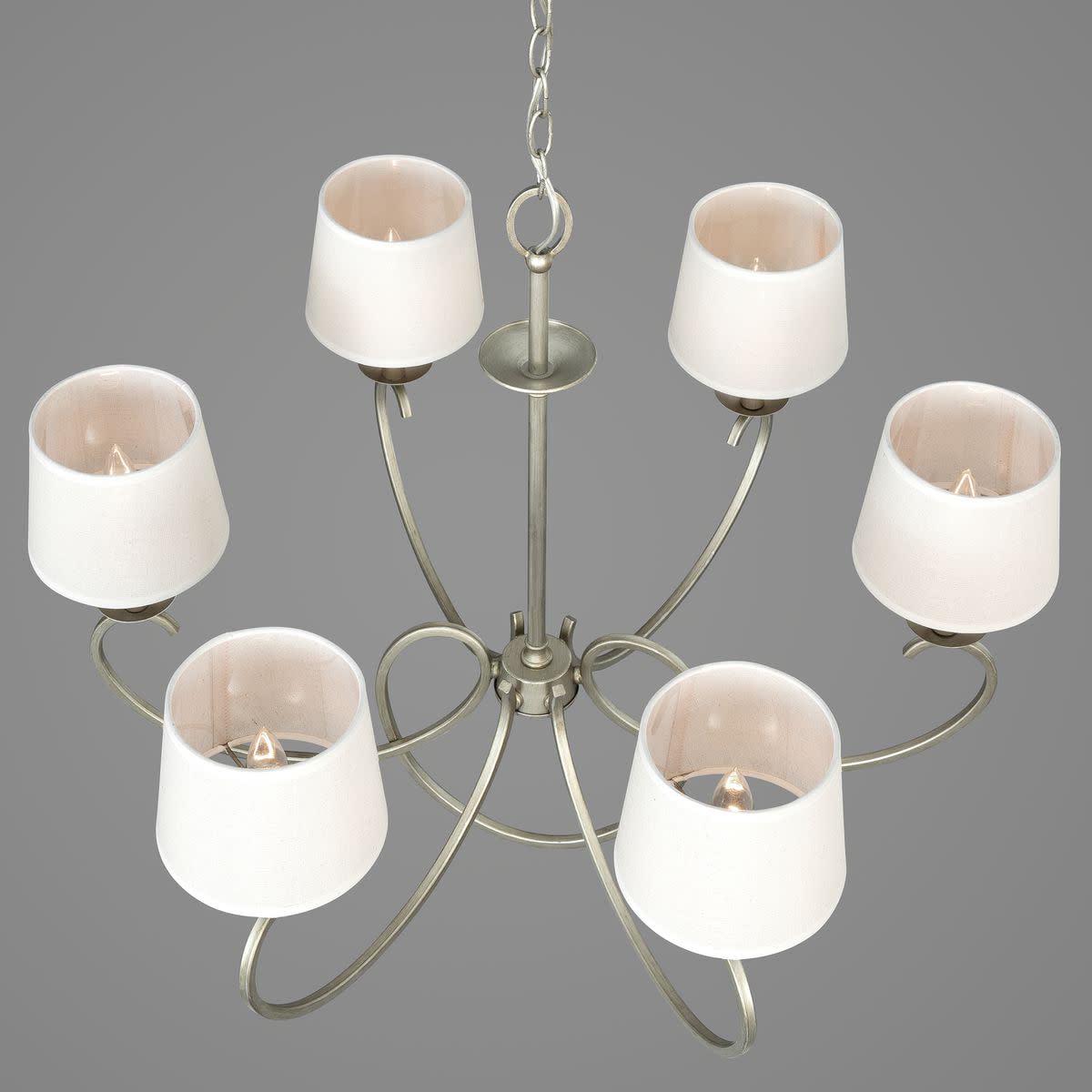 Savor is a soft blend of sweeping details and contemporized wrought iron craftsmanship. Sheer sailcloth textured shades are integral to the design. Savor is suitable for a wide variety of home decor styles. Six-Light chandelier in a Silver Ridge finish.