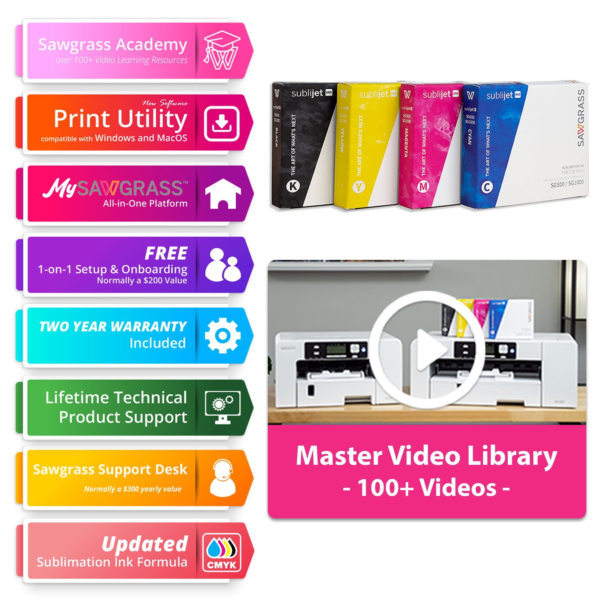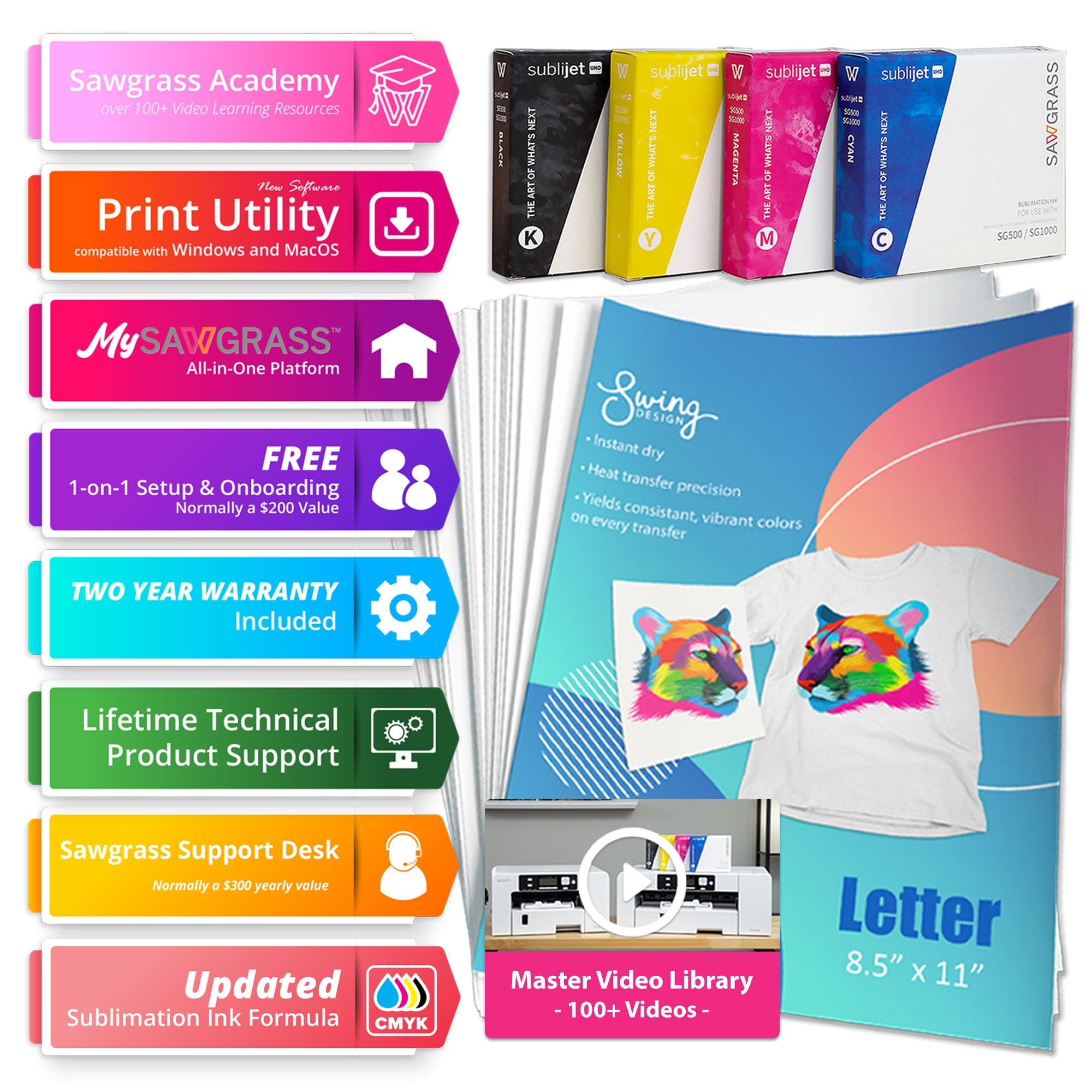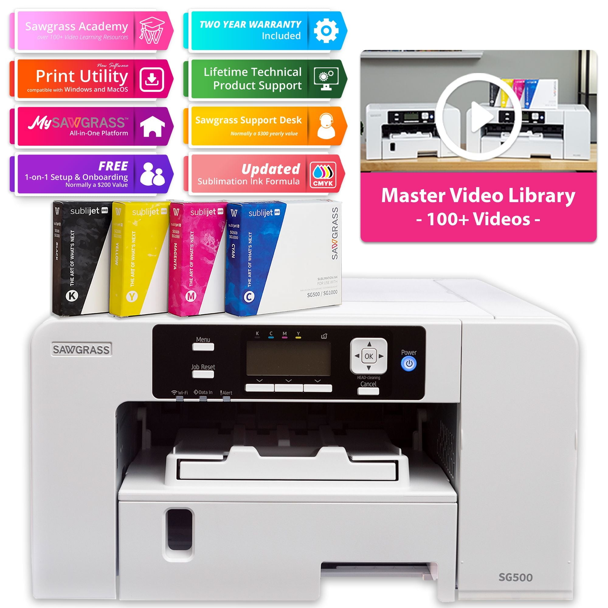 Create like never before with the new and improved Sawgrass Virtuoso SG500 HD Product Decorating System. Sawgrass Virtuoso systems are the industry’s first and only fully integrated desktop solution designed specifically for sublimation. The perfect printer for hobbyists or moonlighter, the SG500 fits comfortably on a desktop and prints media up to 8.5″ x 14″.Or expand the max media size to8.5″ x 51″ with the bypass tray. The SG500 has been updated inside out from its predecessor, the SG400. The SG500 is backwards-compatible with all SG400 accessories. Like all Sawgrass printers, the SG500 performs its own automatic maintenance cycle for trouble-free printing. Decorate a wide variety of products made from polyester fabrics or polymer-coated rigid media including: Aluminum Panels and Inserts, Hardboard and Wood Plaques, Tile, Mugs, Acrylic, Glass, Slate, Polyester Fabric, and Reinforced Fiberglass Plastic. New Features: Wifi Capability Backlit LCD Screen 4880 x 1200 DPI Resolution Two-Year Warranty Single Roll Bar -Eliminates Paper Jams Aluminum Encoder Strip – Reduces Dust Accumulation Ultra-fine Printing Capabilities with 4880 x 1200 dpi Brand New Processor for Faster Image Processing Decorate a wide variety of products made from polyester fabrics or polymer-coated rigid media including: Aluminum Panels and Inserts, Hardboard and Wood Plaques, Tile, Mugs, Acrylic, Glass, Slate, Polyester Fabric, and Reinforced Fiberglass Plastic. Bundle Includes: Sawgrass SG500 Printer – Max Media Size 8.5″ x 14″ INK INSTALL KIT-SubliJet-UHD Inks- 4 Pack Black, Cyan, Magenta, Yellow Brighter and Consistent Color High Stability Choose From 20ml or 31ml Ink Set **Free One on One Setup & Onboarding 250 Sheet Capacity 2 Year Warranty Lifetime Support Access toGO Expression Access toGO Exchange Exclusive Content from Swing Design CreativeStudio Online Designer Compatible with CorelDraw X6 or later, Adobe Illustrator and Photoshop CS6 or Creative Cloud, Adobe Photoshop Elements 12 or later AC 110-120 / 220-240V Must download Sawgrass Print Manager (SPM) for optimal quality. Recommend Windows 10, Compatible with Windows 7, 8, 8.1, 10; Mac OS 10.9 or later