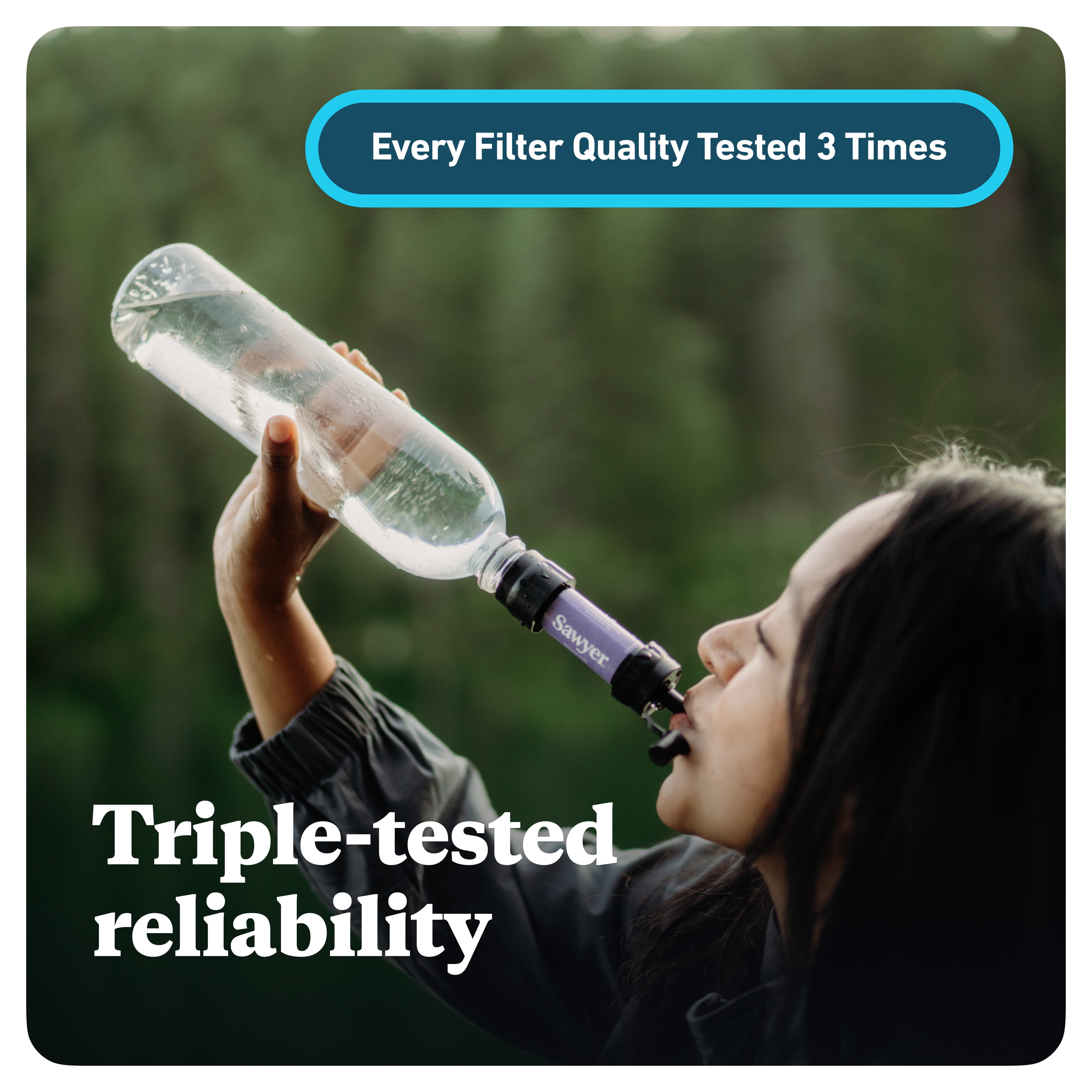 A lightweight, versatile personal filtration system, the second-generation Sawyer MINI Water Filter fits in the palm of your hand and has a total field weight of just 2 ounces. Perfect for everything from camping with the kids to traveling abroad where tap and bottle water can’t be trusted, the tiny MINI provides 0.1 micron absolute filtration for clean drinking water on the go — filtering out bacteria, protozoa, and microplastics. The MINI filter removes 7 log (99.99999%) of all bacteria (like salmonella) as well as other harmful bacteria causes cholera, Leptospirosis, and E. coli and 6 log (99.9999%) of all protozoa such as giardia and cryptosporidium (independent testing laboratory Hydration, LLC.; microbiological report S05-03). These removal rates equal or exceed other filter options. EPA guidelines allow ten times more protozoa left in the water than Sawyer MINI filters allow. The MINI also filters out 100% of microplastics. The MINI 0.1 micron absolute filter houses a cluster of micro-fibrous tubes which use similar technology found in medical dialysis. As water passes through the side walls of the tubes, harmful bacteria and protozoa are trapped on the outer walls so you can be confident your water is safe to drink. Great for outdoor recreation, hiking, camping, scouting, domestic and international travel, and emergency prepping, the Sawyer MINI gives you a number of ways to access clean water. Attach it to the included drinking pouch, use the included straw to drink directly from your water source, connect it to hydration pack tubing (sold separately), or screw it onto standard disposable bottles (28mm thread). Since 1984, Sawyer has used technological advancements to create products that keep you outdoors — from the backcountry to the backyard — including insect repellents for both skin and clothing, water filters for camping and emergencies, and sun protection.
