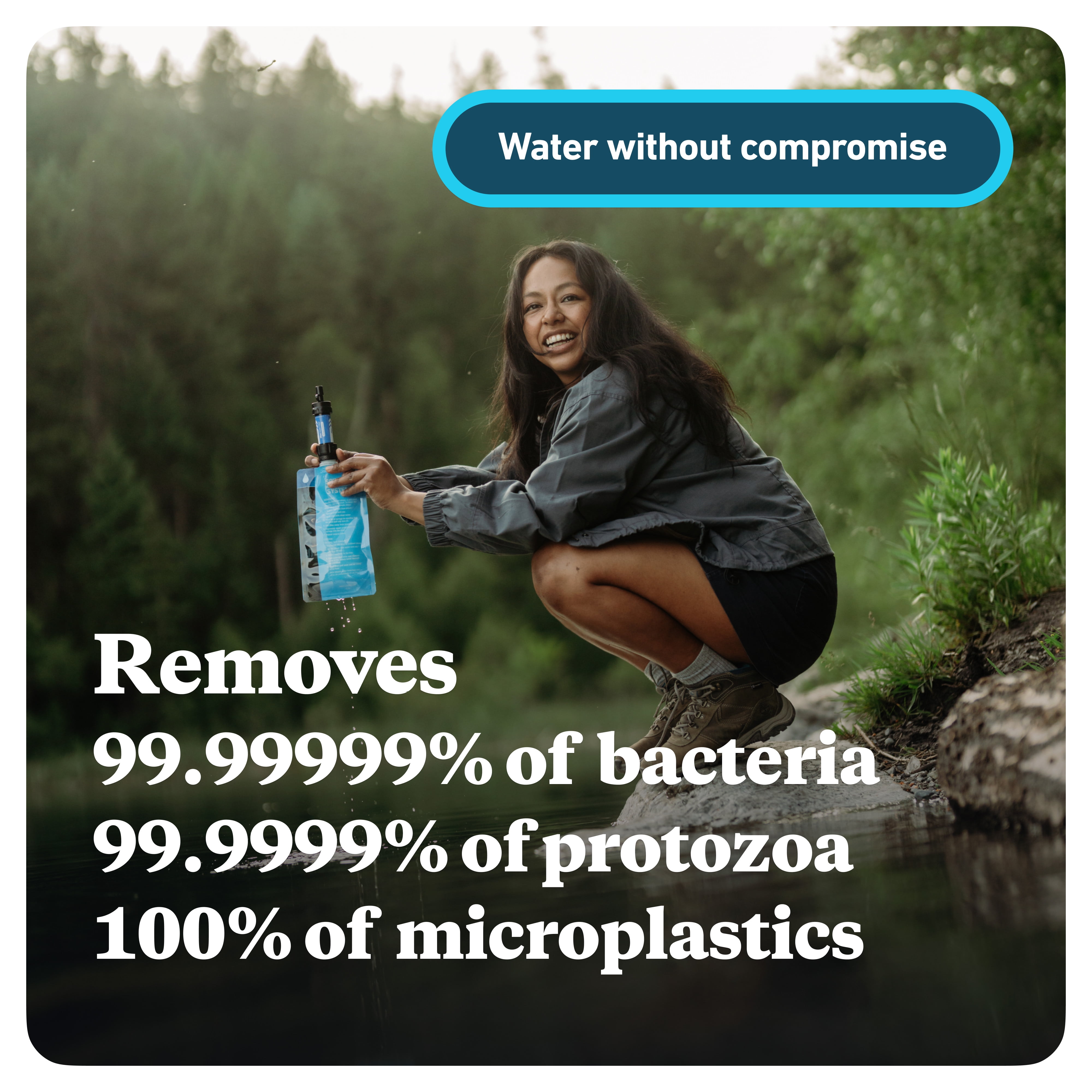 Ideal for outdoor recreation, hiking, camping, scouting, domestic and International travel, and emergency preparedness High-performance 0.1 micron absolute inline filter fits in the palm of your hand and weighs just 2 ounces; 100% of MINI units individually tested three times to performance standards by Sawyer Attaches to included drinking pouch, standard 28 mm disposable water bottles, hydration packs, or use the straw to drink directly from your water source Removes 99.99999% of all bacteria (salmonella, cholera, and E. coli); removes 99.9999% of all protozoa (such as giardia and cryptosporidium); also removes 100% of microplastics Filter rated up to 100,000 gallons; includes two Sawyer MINI filters, 16-ounce reusable squeeze pouch, two 7-inch drinking straws, and two cleaning plungers This same filter is being used to bring clean water to families all around the world in over 80 countries