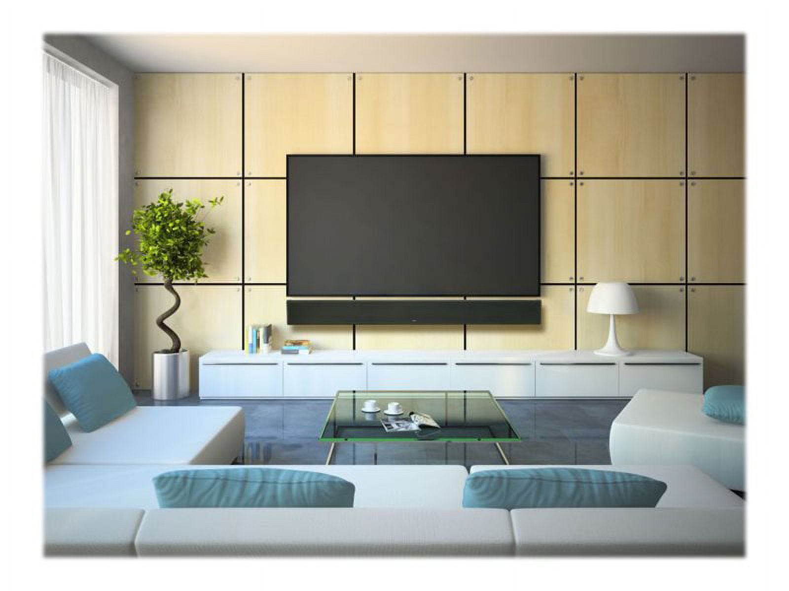 Room-filling 3D sound from a single aluminum cabinet. AccuVoice feature uses dialogue clarifying technology to deliver ultra-clear dialogue. Dual built-in subwoofers with MegaBass produce great bass without external subwoofer. Works with your current remote control. Output Leveling tames loud commercials. Multiple inputs make it simple to add a multi-zone streaming audio receiver. Works well with TVs from 65 “- 90”