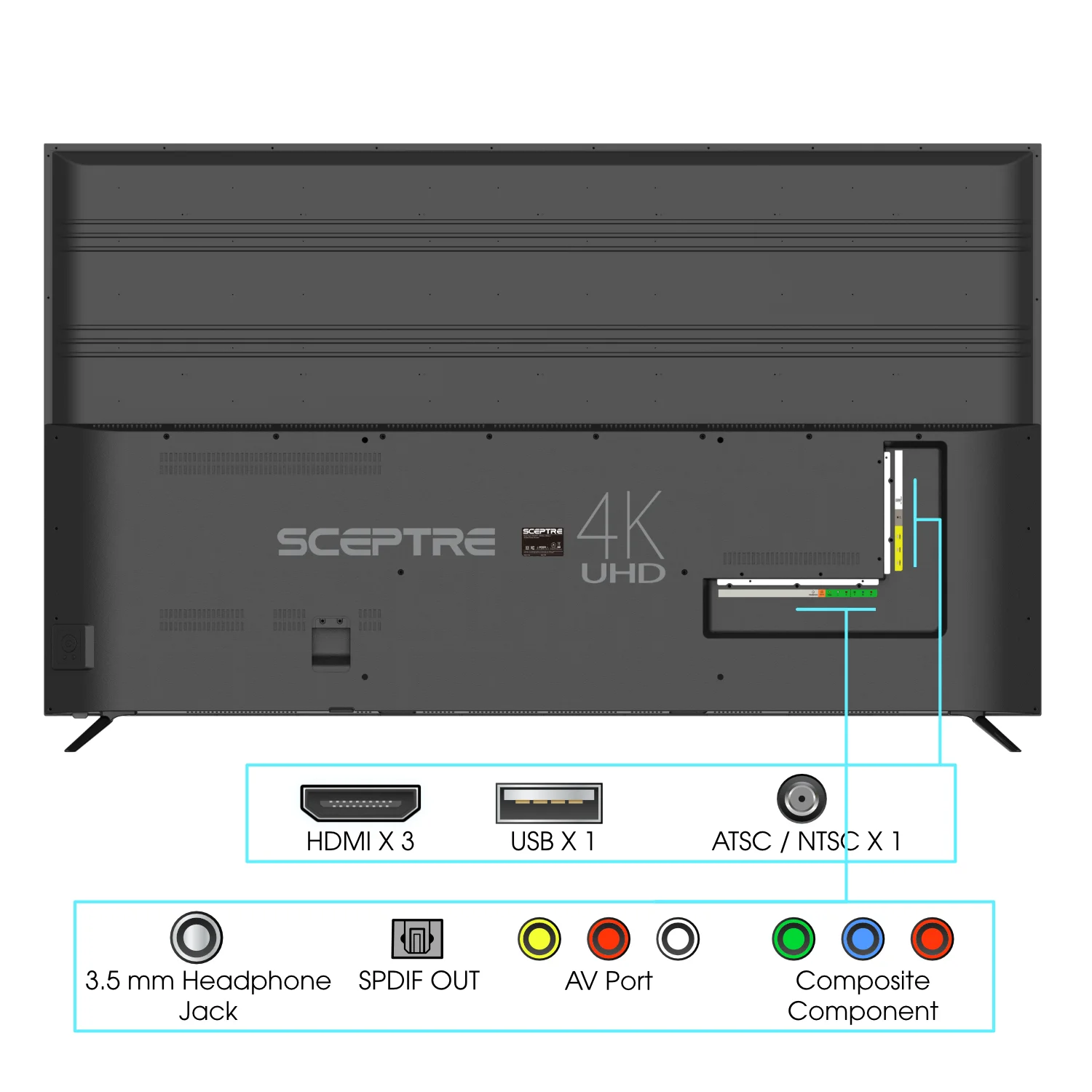 Sceptre 75″ Class TV (U750CV-U): Key Features: Screen Size (Diag.): 74.5″ Backlight Type: LED Resolution: 2160p High Dynamic Range (HDR) Effective Refresh Rate: 60Hz Smart Functionality: no Aspect Ratio: 16:9 Viewable Angle (H/V): 178 degrees/178 degrees Number of Colors: 16.7 M OSD Language: English, Spanish, French Speakers/Power Output: 10W x 2 Noise Reduction and Weak Signal EnhancementConnectivity: Component/Composite Video HDMI Headphone Optical Digital Audio RCA Audio L+R RF (Coaxial) USB 2.0What’s In The Box: Remote ControlSupport and Warranty: 1-year limited labor and parts Flat Screen TV stand sold separately. See all TV stands. Flat Screen TV mount sold separately. See all TV mounts. TV audio equipment sold separately. See all Home Theater Systems. HDMI cables sold separately. See all HDMI Cables. Accessories sold separately. See all Accessories.