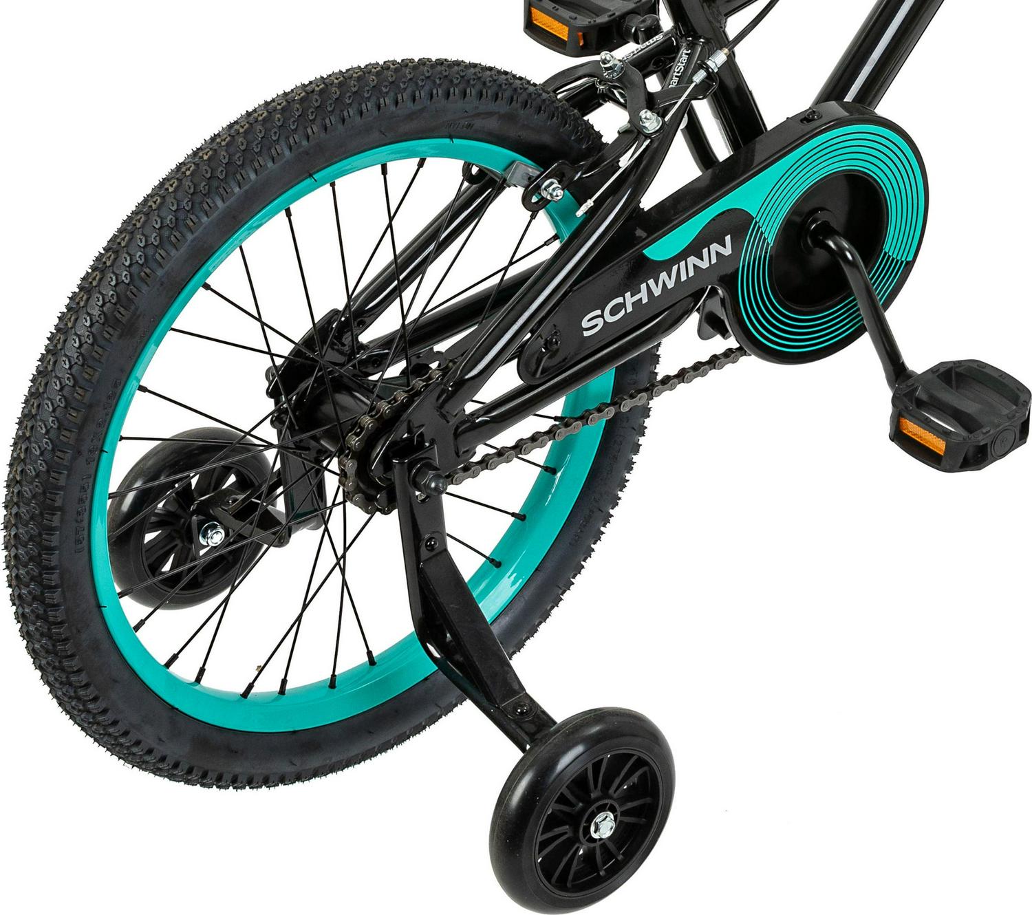 – Features removable training wheels and handlebar number plate. Full coverage chain guard to protect little hands, feet, and clothing.