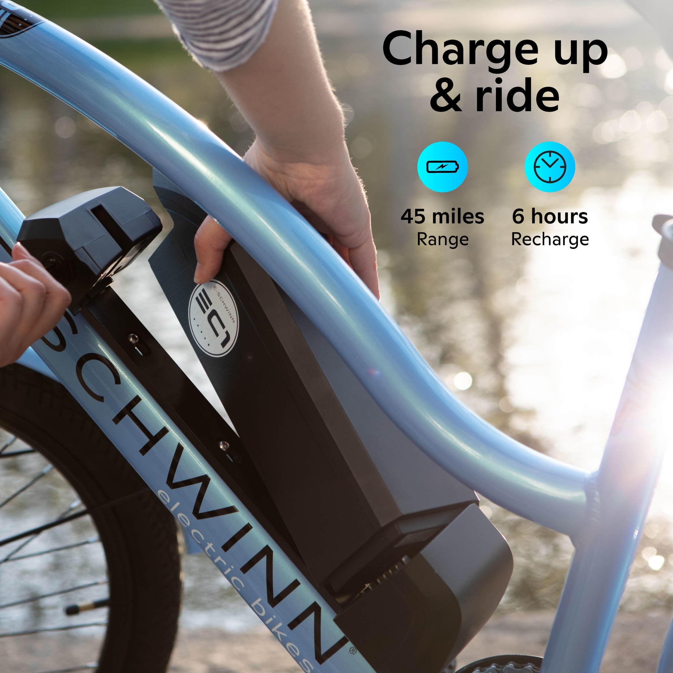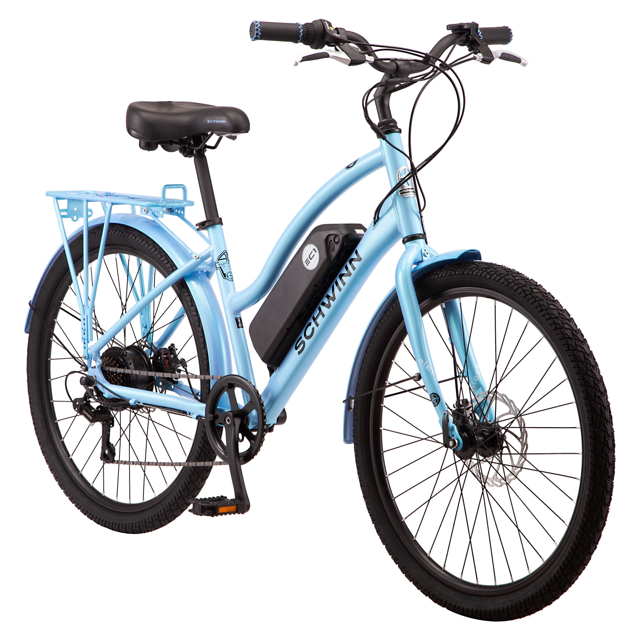 Schwinn 26″ EC1 Electric Cruiser Bike for Adults, 7 Speeds, 250w Motor, Blue Ebike Enjoy the outdoors and health benefits of bicycle riding, without some of the situational challenges like sweaty hill climbing and lengthy travel times, with the EC1 e-bike by Schwinn. Schwinn E-Bikes have a motor and battery integrated into the bike. When you pedal, the motor activates and provides an extra level of assistance that you control with a thumb pad on the handlebar. There are five different levels of pedal-assist for you to choose from, which offer e-assistance up to 20 miles per hour. View more from us on our brand page.