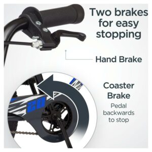 – Rear coaster brake with front and rear hand brakes helps young riders learn to use big kid brakes.