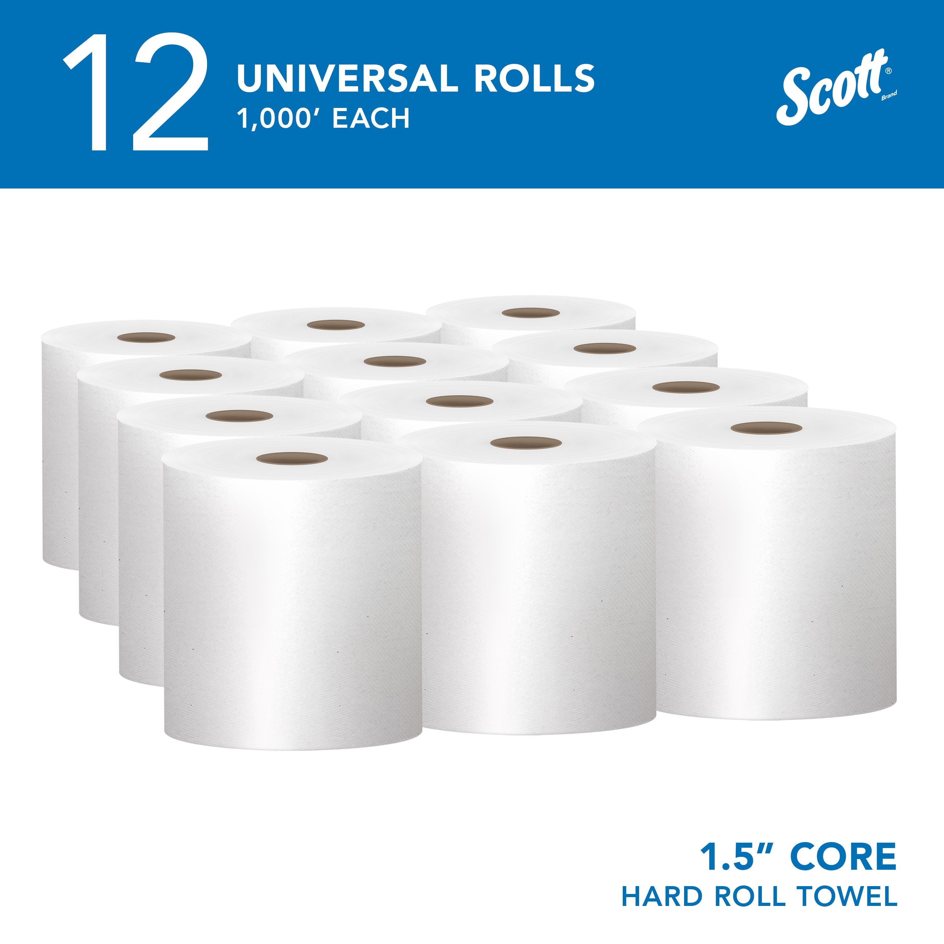 1,000’/Roll; 12 Rolls of Scott® Essential Universal High-Capacity Hard Roll Paper Towels/Case; 12,000’/Case; with Absorbency Pockets™; 1.5″ Core; White Reduce maintenance time, run-outs and complaints with long-lasting bulk paper towels (as compared to a folded towel system) Compatible with many Kimberly-Clark Professional™ universal Hard Roll Paper Towel dispensers, along with many other universal hard roll paper towel dispensers designed to hold 1.5″ cores Absorbency Pockets™ absorb lots of water fast for superior hand drying performance, so guests use fewer paper towels Designed for efficient general-purpose cleaning and drying, saving you money.