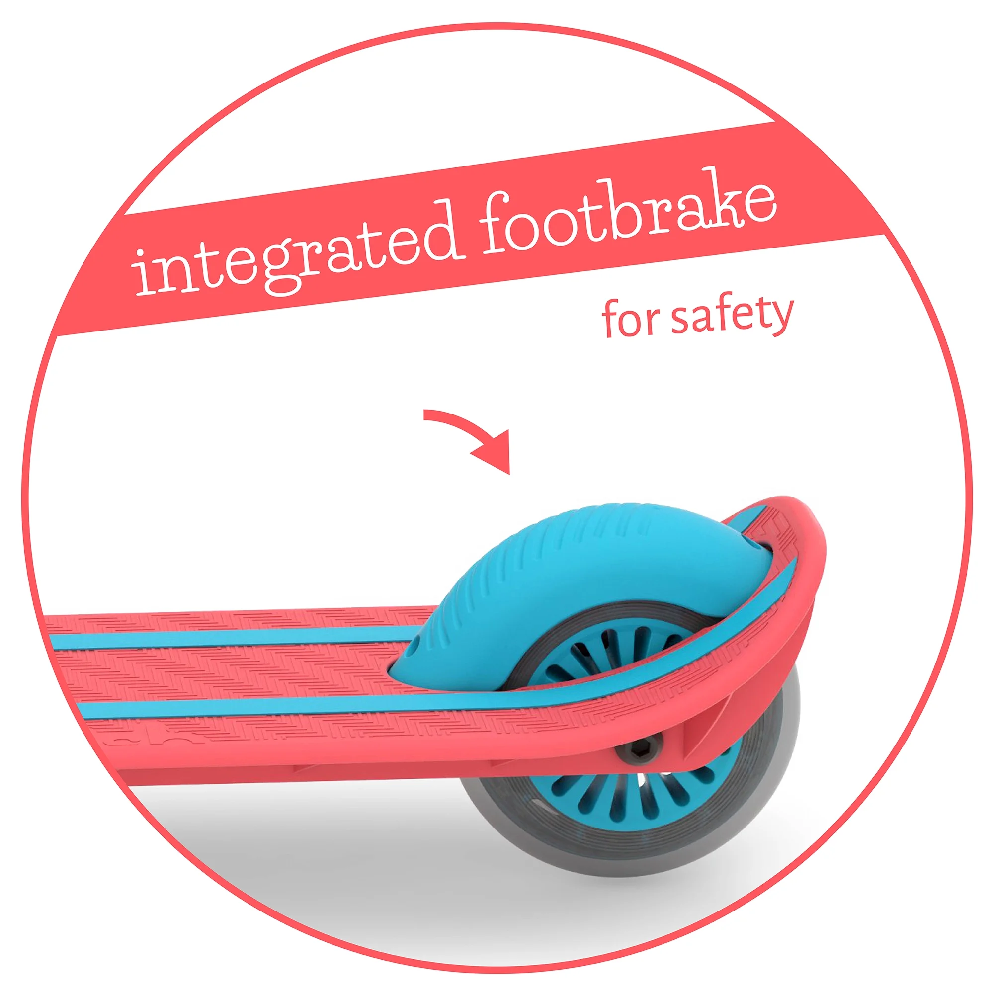 Lightweight 3-wheel scooter for kids age 3 and up. Lean to steer mechanism : just lean your weight to turn – super easy. Re-invented twintip deck design with integrated footbrake for safety. No-tools detachable handlebar can be taken out for easy storage/transport. High-quality ABEC-5 wheels make you roll like you’ll never stop. Max weight 50kg.
