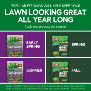 – Apply Scotts Turf Builder Southern Triple Action when weeds are actively growing, then apply Scotts Turf Builder Green Max Lawn Food 6 to 8 weeks later to maintain a lush, green lawn