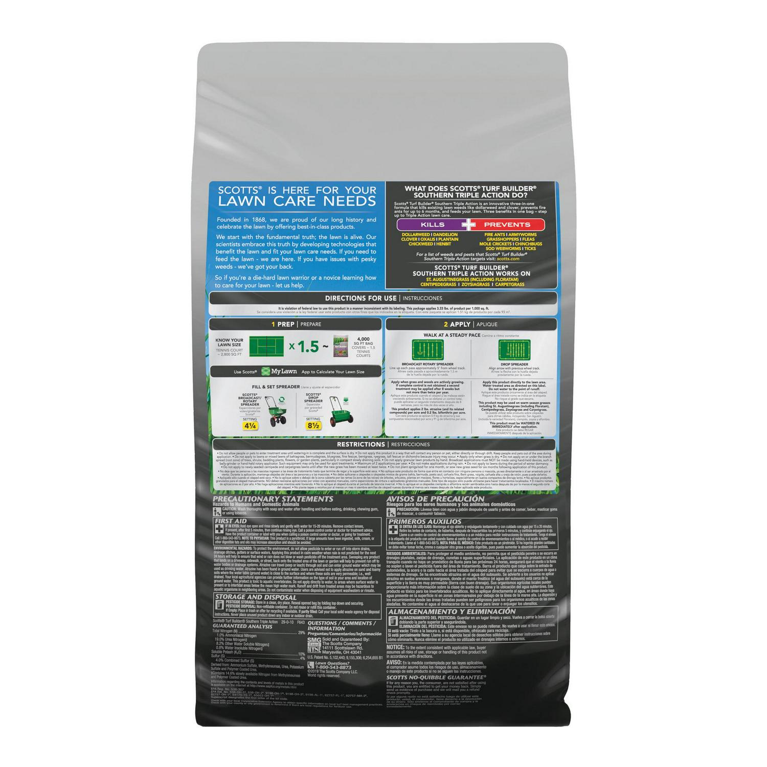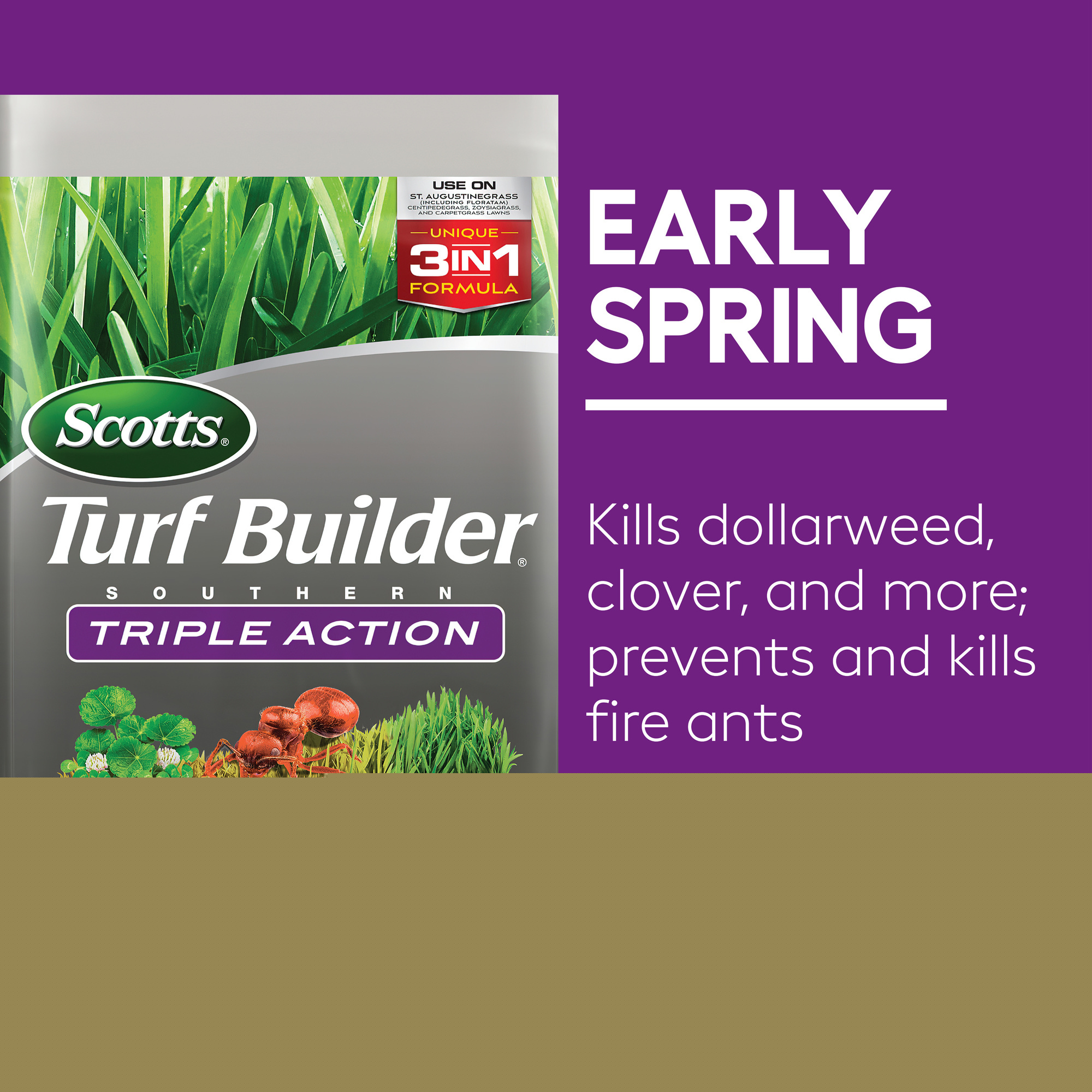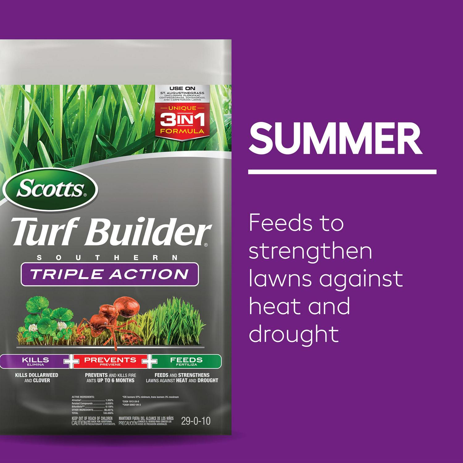 – Scotts Turf Builder Southern Triple Action 3-in-1 weed killer, insecticide, and fertilizer controls listed weeds, prevents fire ants, and feeds your lawn