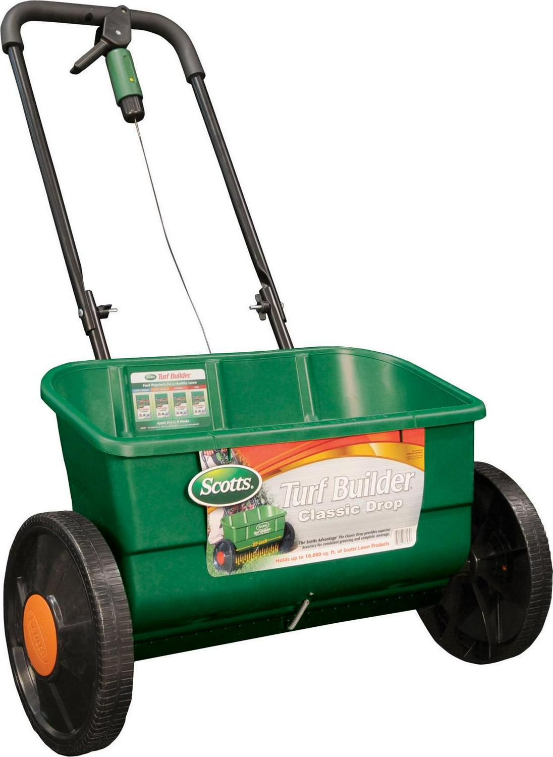Spread product efficiently and effectively with Scotts Turf Builder Classic Drop Spreader. With a large capacity hopper and a heavy-duty frame for optimum stability, you can spread up to 10,000 sq. ft. of Scotts lawn food for maximum coverage and accuracy. Fully assembled and pre-calibrated, the Classic Drop Spreader comes ready to treat your lawn immediately.
