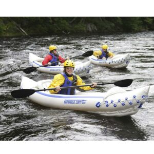 2 person Sea Eagle Inflatable Kayak (500 pounds) capacity suitable for up to Class III whitewater and is easy to carry and store