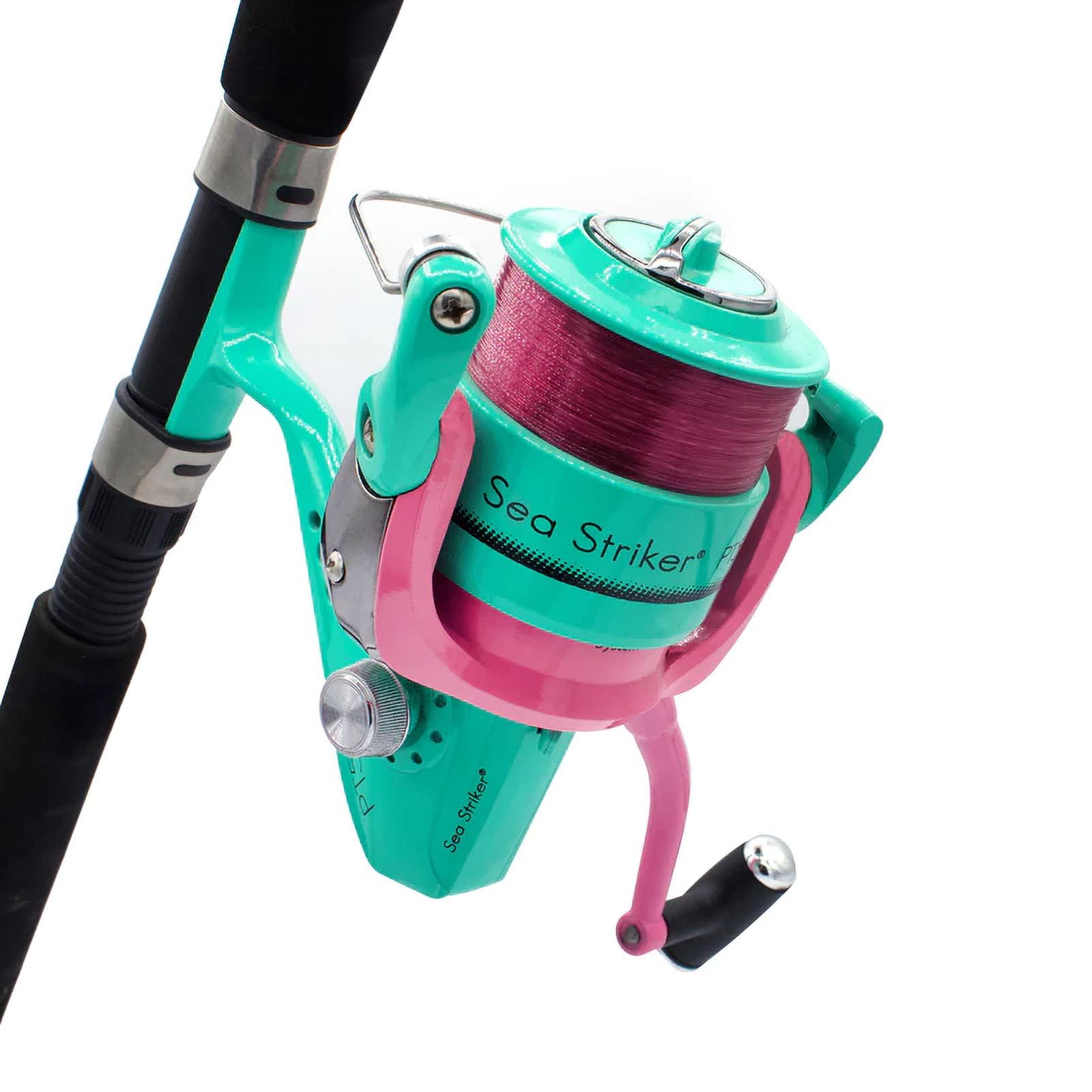 Catch attention and fish with these Shur Strike®/Sea Striker® pink and teal rods and reels. The teal rod blank is accented with pink wraps. EVA foam grips are lightweight and comfortable. Graphite reel seat features stainless steel hoods. Shur Strike®/Sea Striker® pink and teal graphite reels have one ball bearing and come filled with pink monofilament.