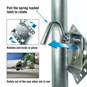 – Convenient, spring-loaded, plunger-pin swivel feature – Swing up to stow parallel to the tongue for travel; move back into an upright position for use.