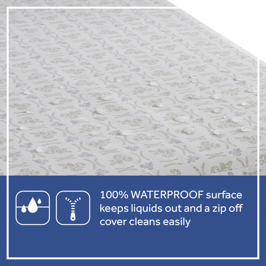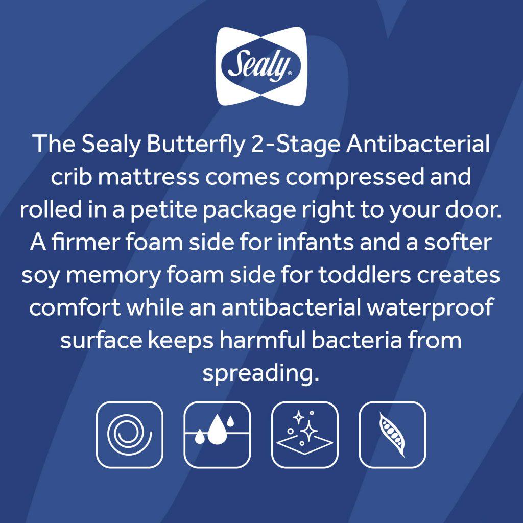 The Sealy Butterfly Crib and Toddler Mattress collection is made with CERTIPUR-US Certified foams that are firm, supportive and non-toxic for babies. Plus, you can have confidence in the quality, workmanship, and safety testing of our locally-made foam that is engineered for lasting firmness and durability. Packaged in a small box and delivered compressed and rolled inside. It immediately “butterflies” out to take shape into a full standard size crib mattress for a snug fit inside cribs and toddler beds. The Sealy Butterfly 2-Stage Antibacterial Ultra Firm Crib Mattress offers a grow-with-me design, made with a high-density foam side and a comforting soybean memory foam side. Our foam is marked with the infant side for families using it during the newborn stage. This model has a hospital-grade STAPH-GARD laminate cover lab-tested to help eliminate harmful bacteria from spreading on the baby s surface. It is gentle on babies but harsh on bacteria. The surface is entirely waterproof and wiped clean with a damp cloth.
